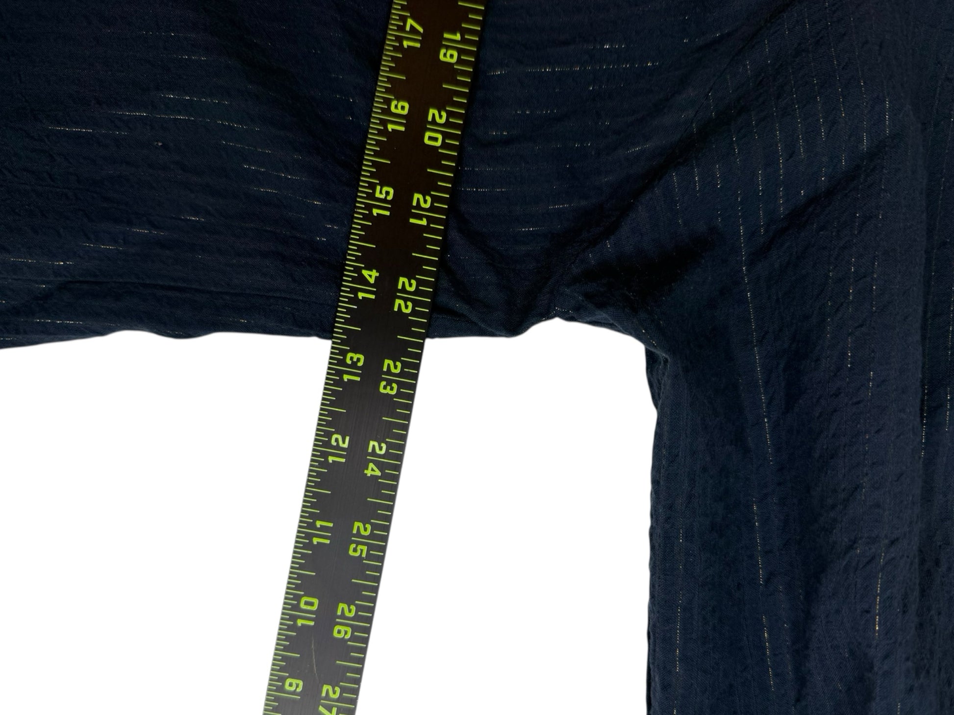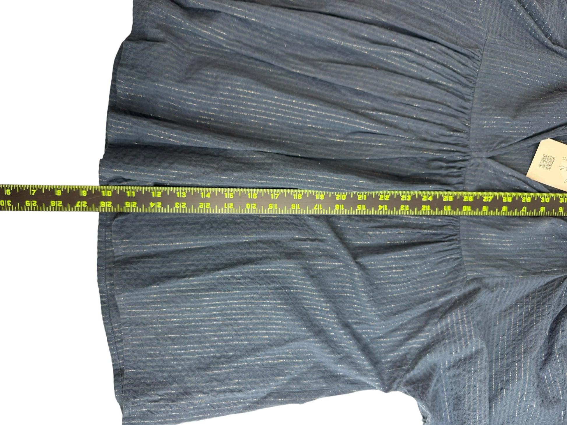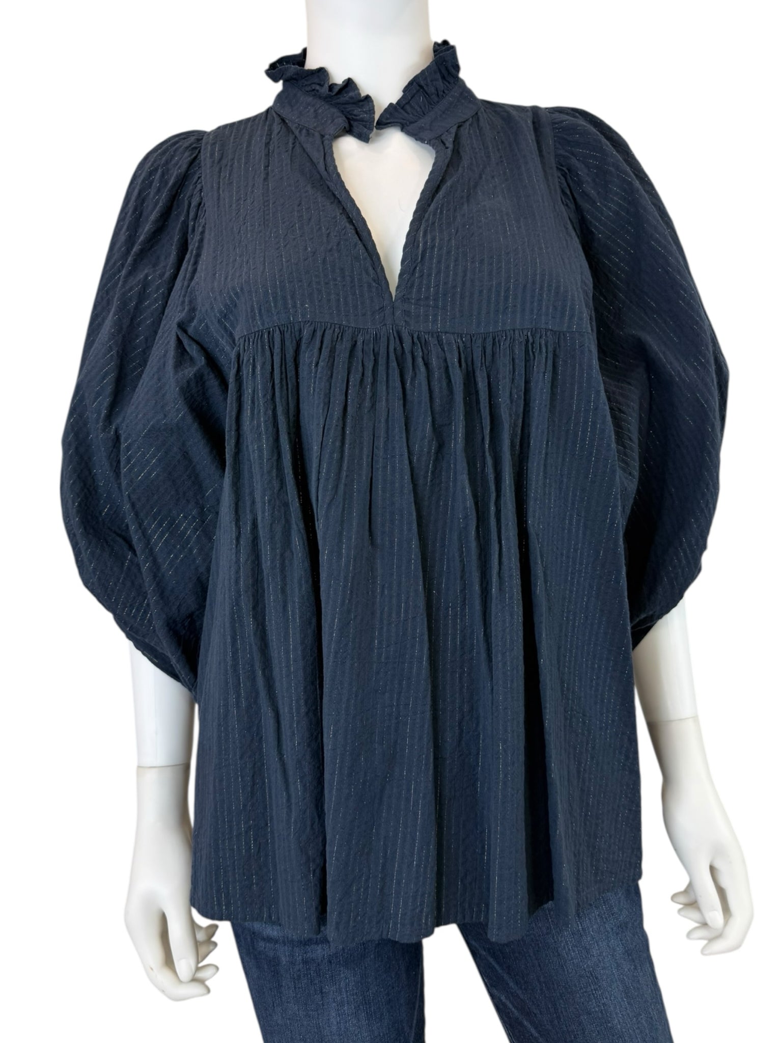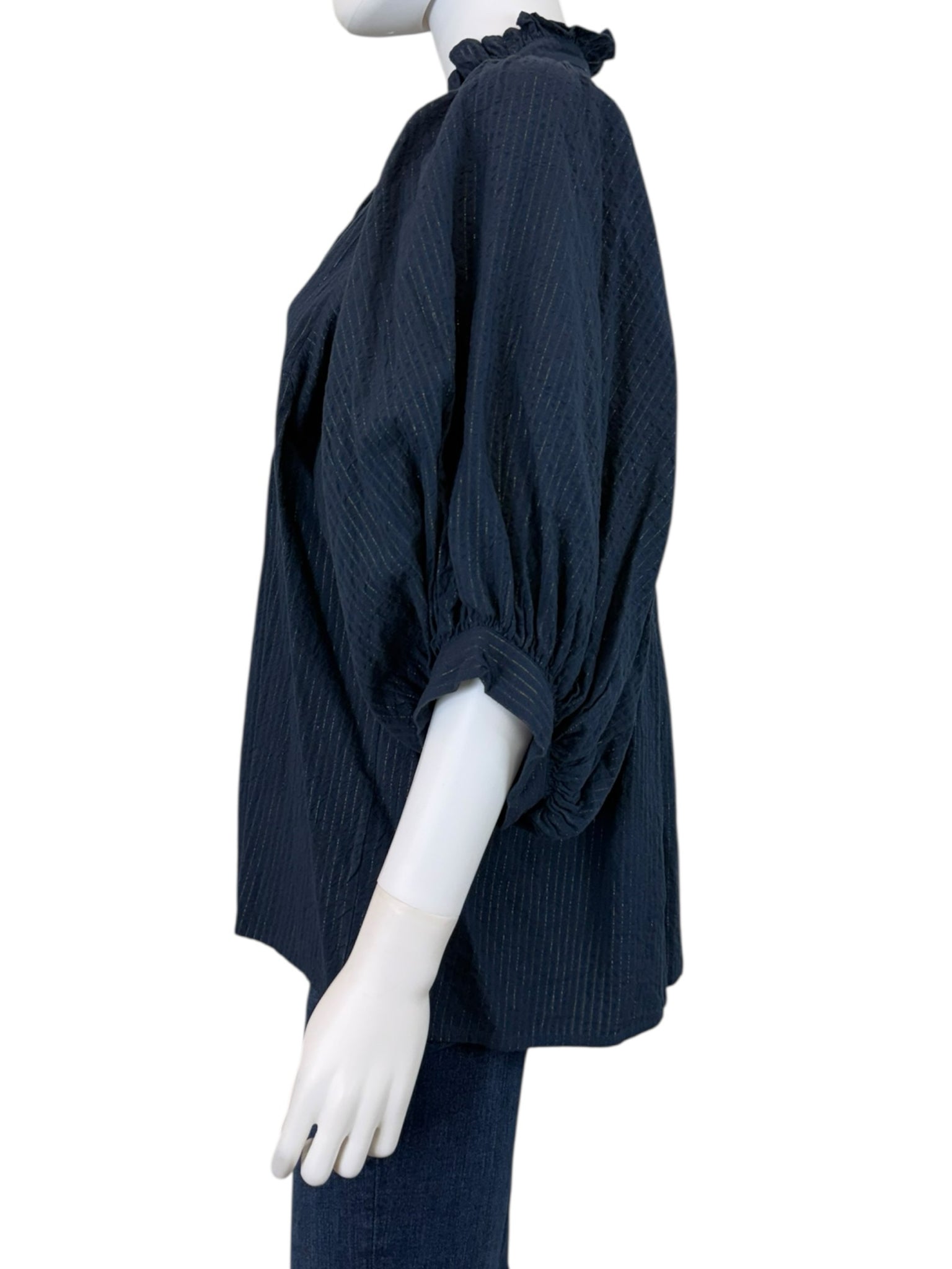 Navy long 3/4 sleeves. keyhole neckline. Teared and ruffle design. Cute for spring. thin gold line line design.