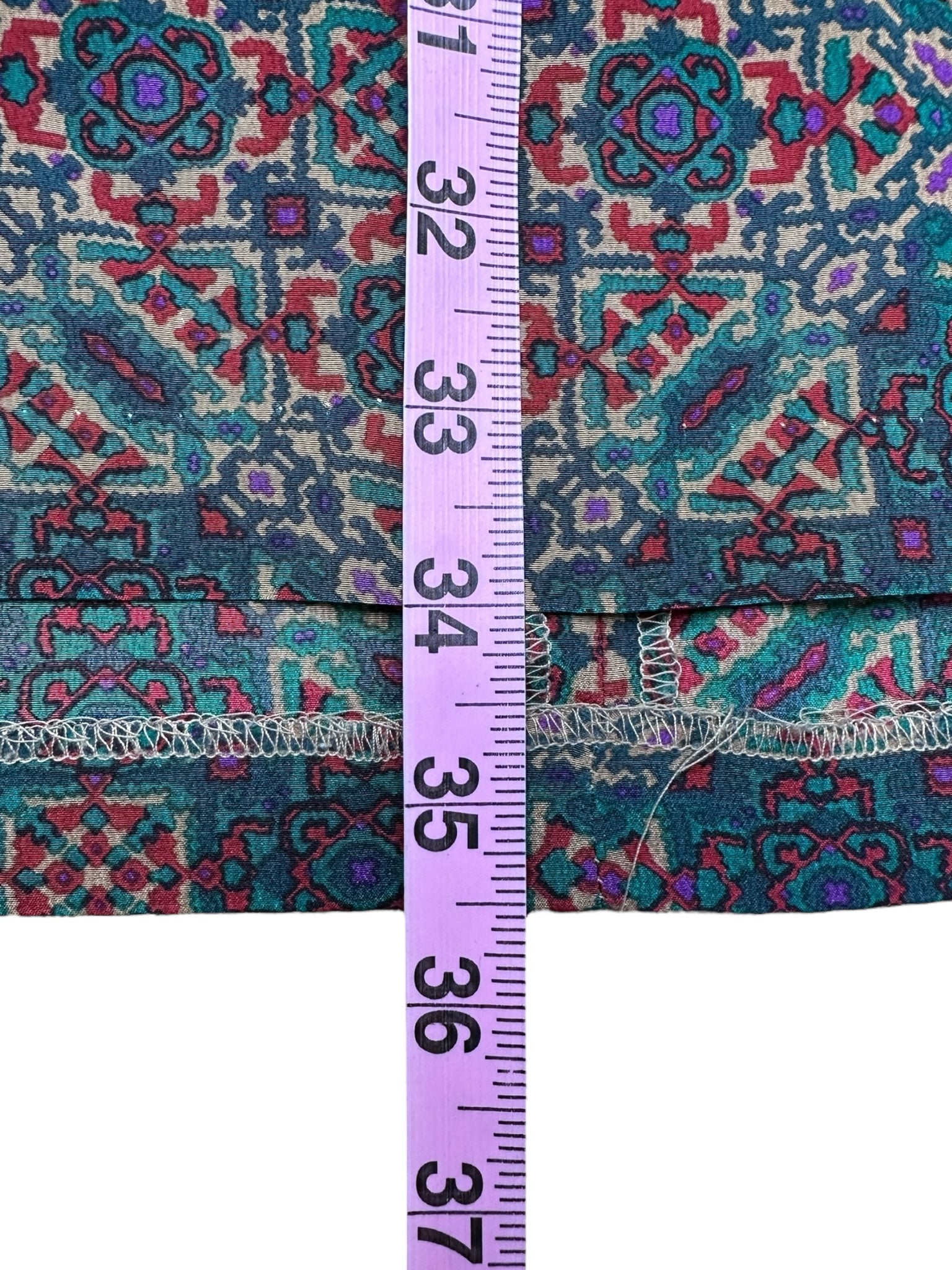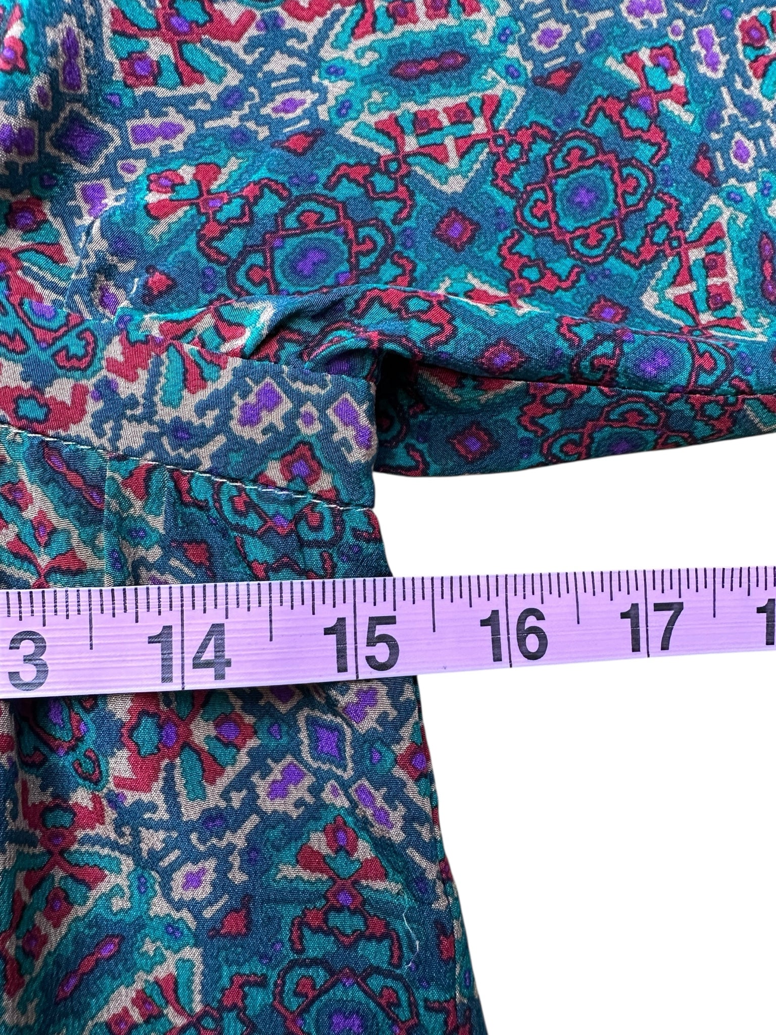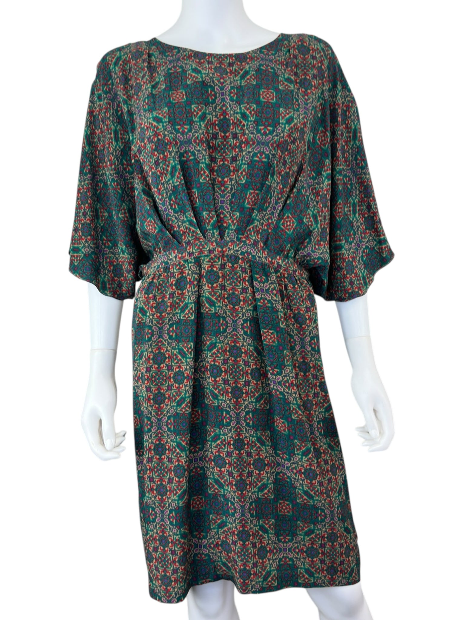 100% silk green, red, cream & purple print mini dress with batwing sleeves and back zipper closure.