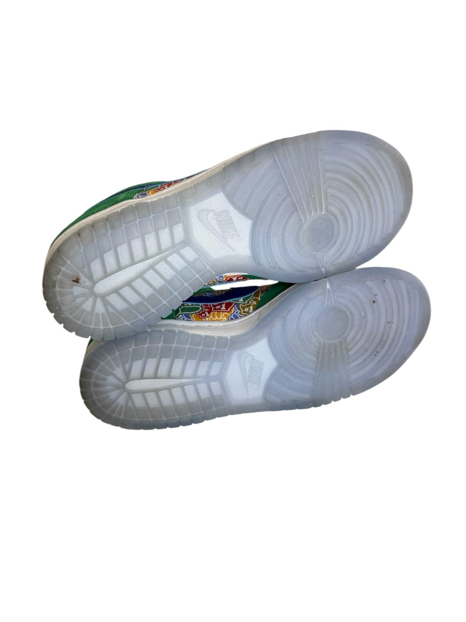 Green suede and Foam Finger leather print low top sneakers with braided lace closure. Sneakers a youth size 6 which converts to a women's 7.5.