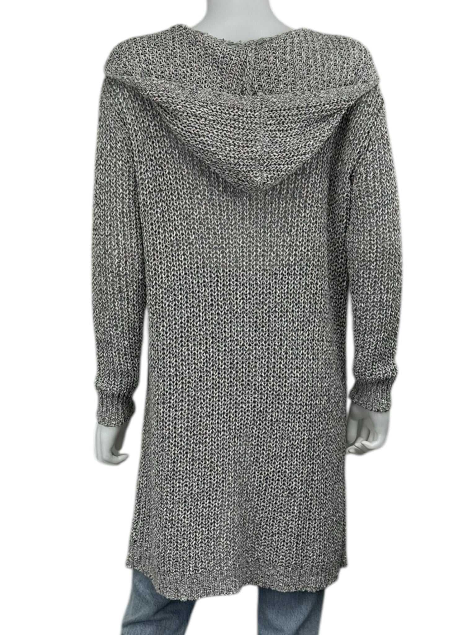 Gray confetti cotton blend hooded duster cardigan with long sleeves and an open front.