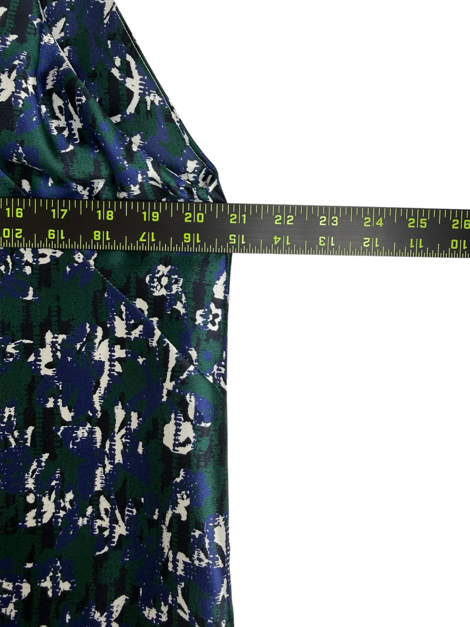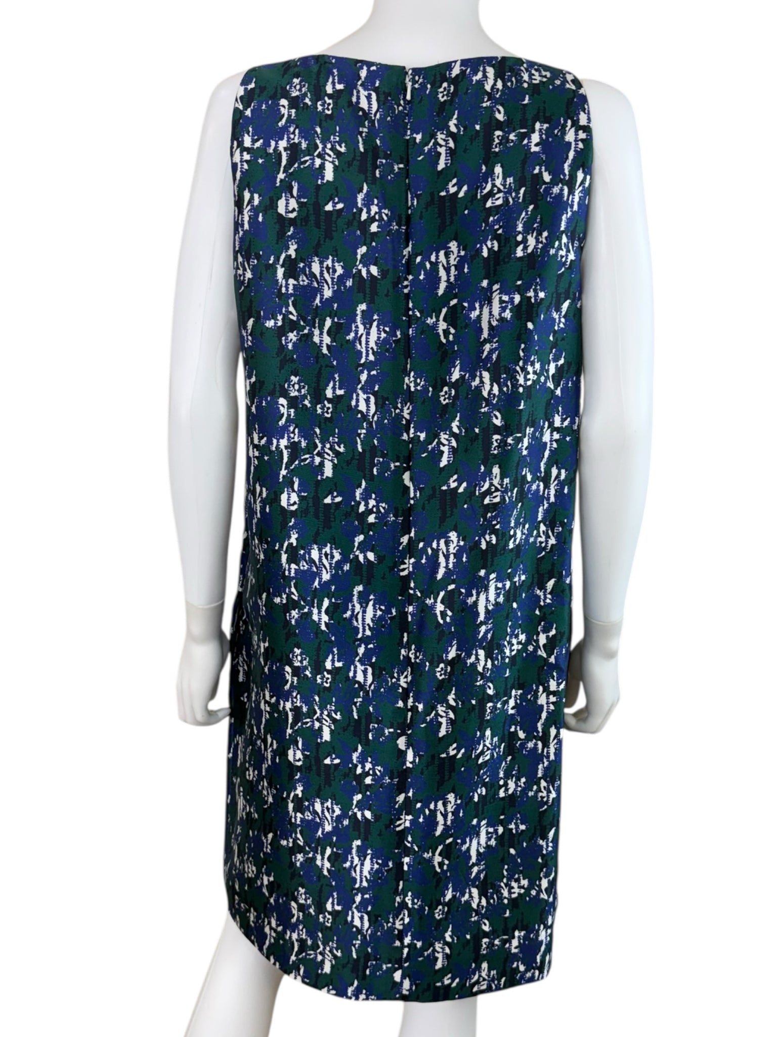 New with tags! Blue, green, and white patterned mini dress with a high neckline and hidden pockets.