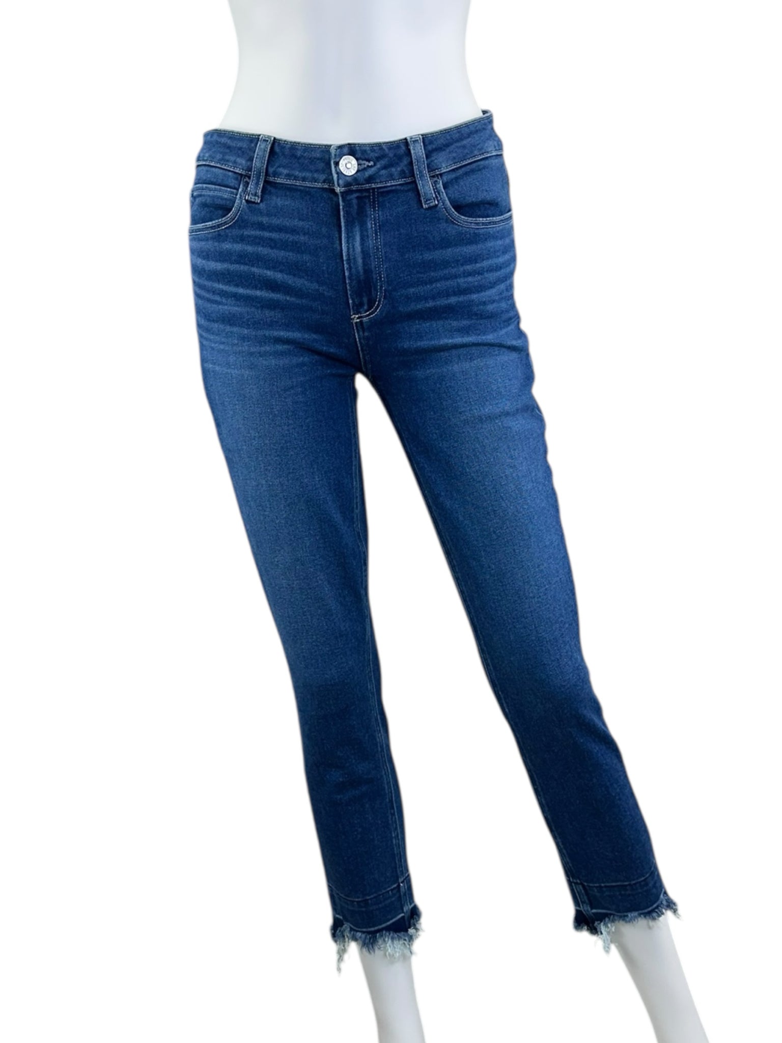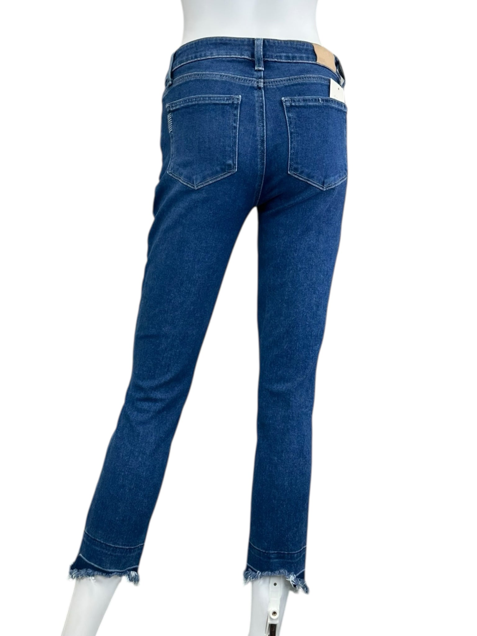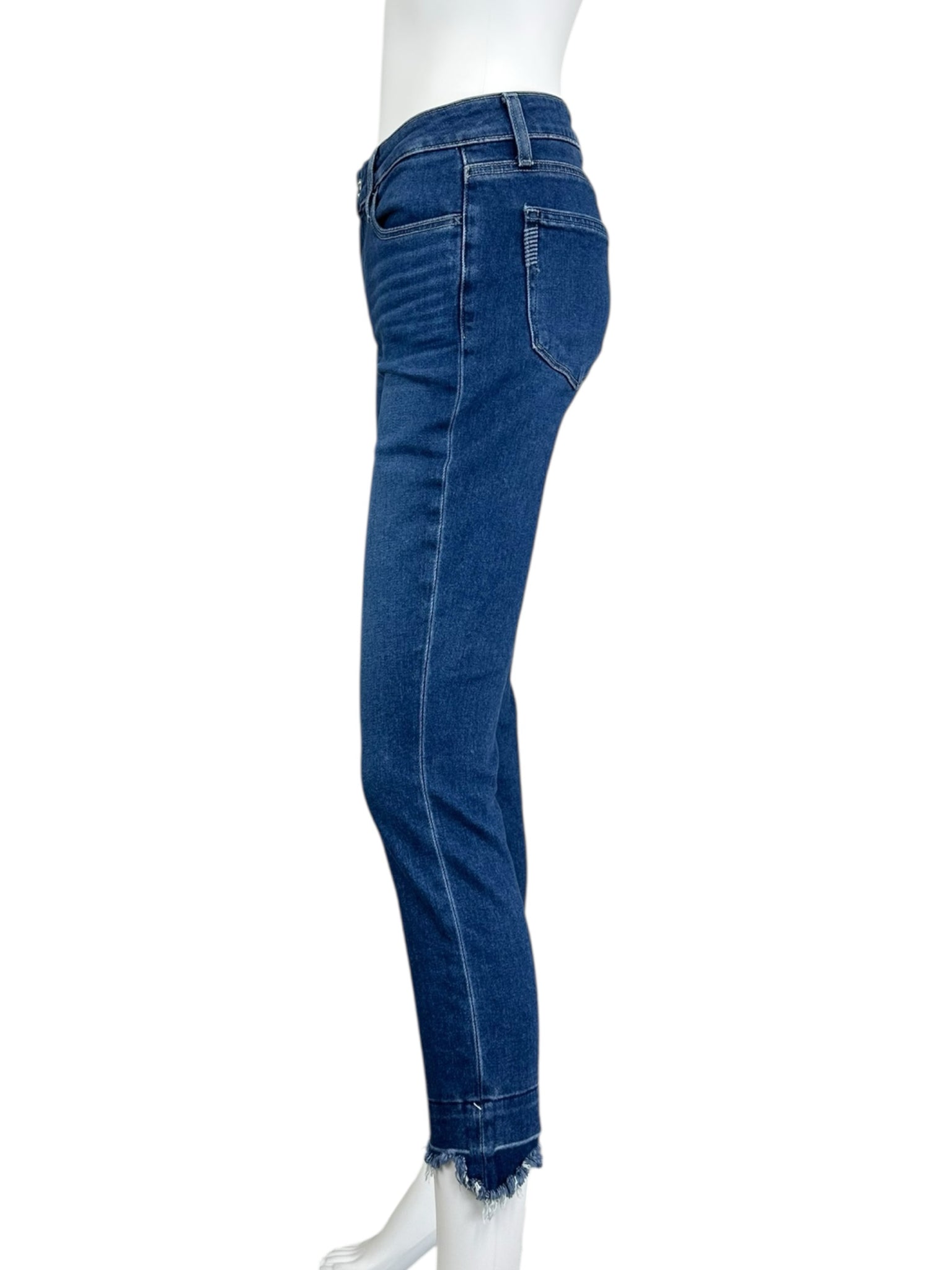 Dark wash frayed bottoms "skyline skinny crop" with zip and button closure and 4 pockets.