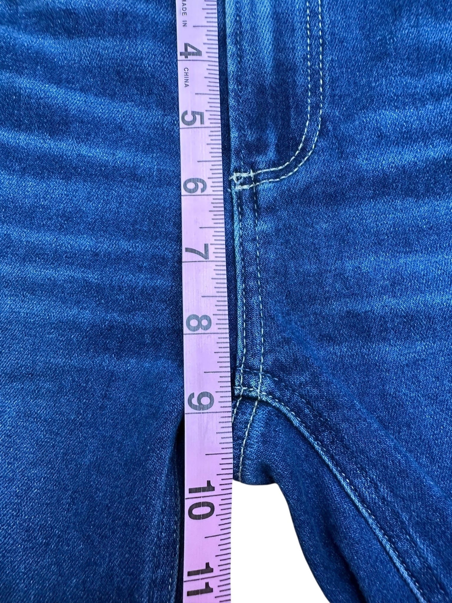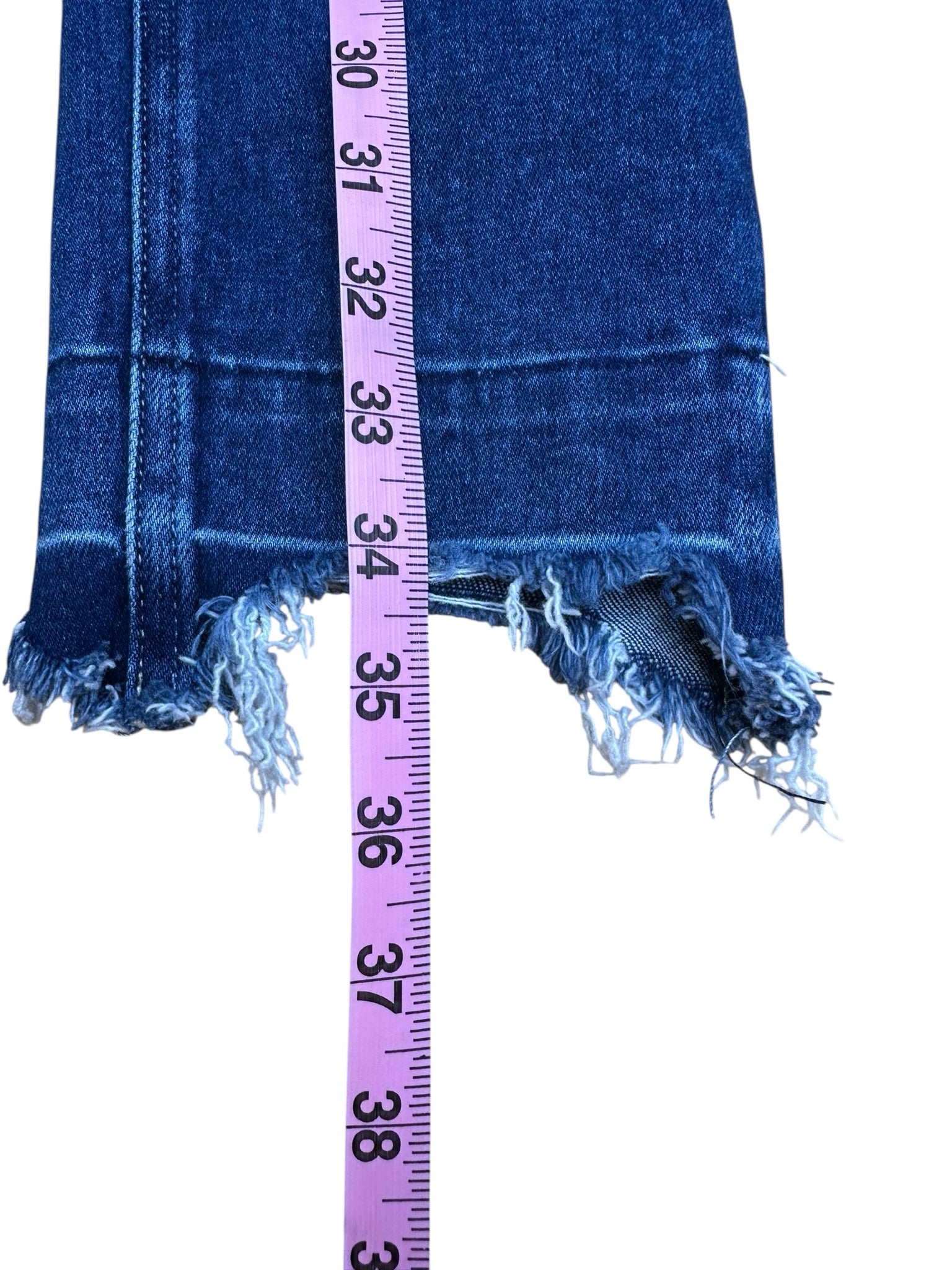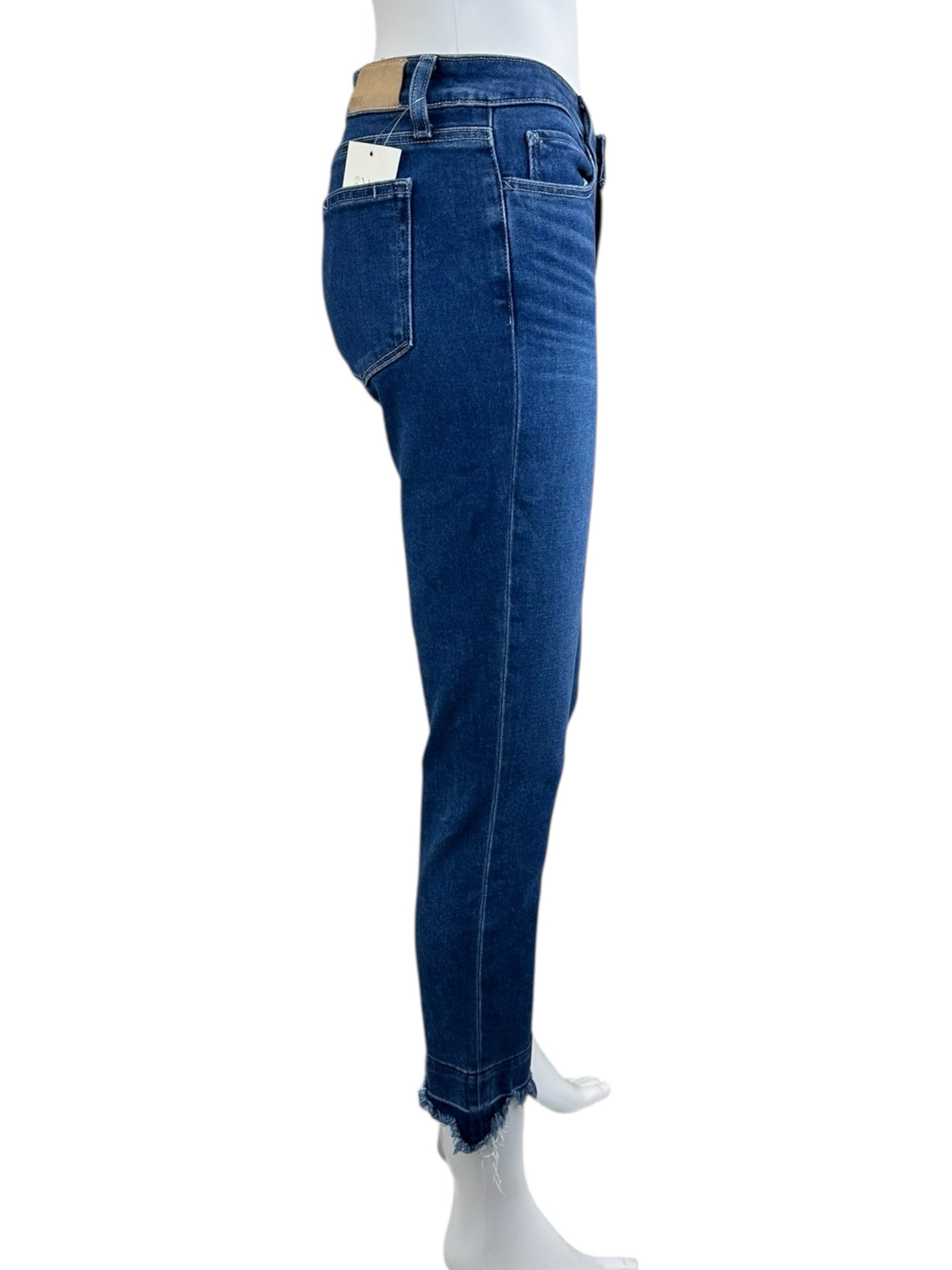 Dark wash frayed bottoms "skyline skinny crop" with zip and button closure and 4 pockets.