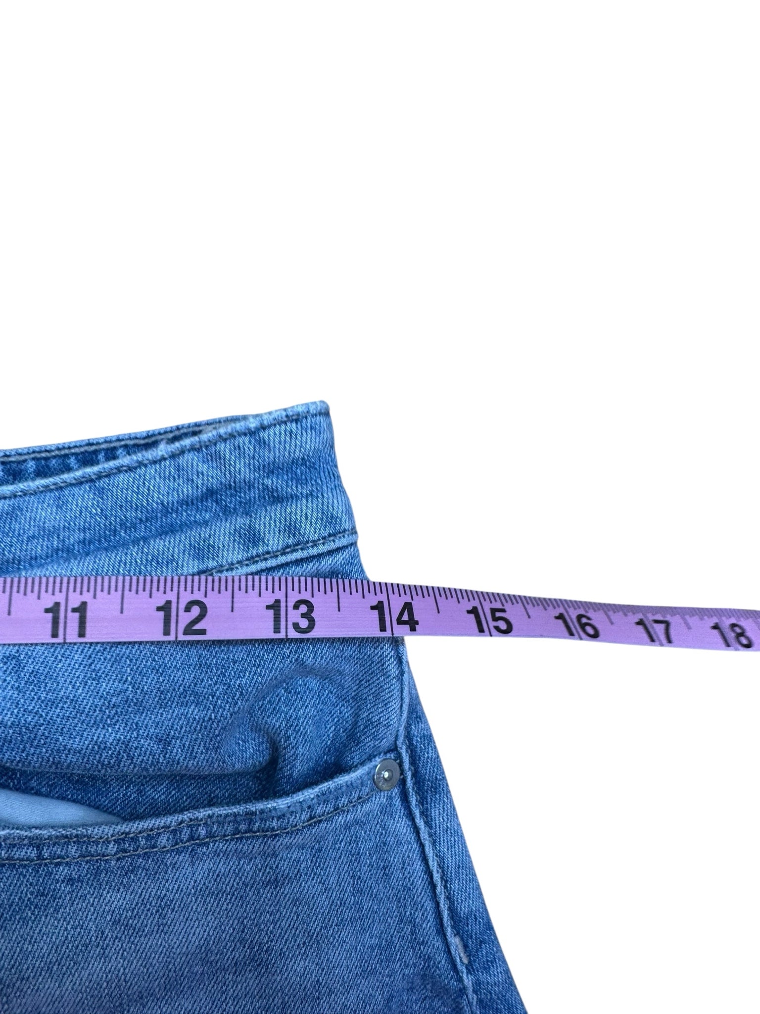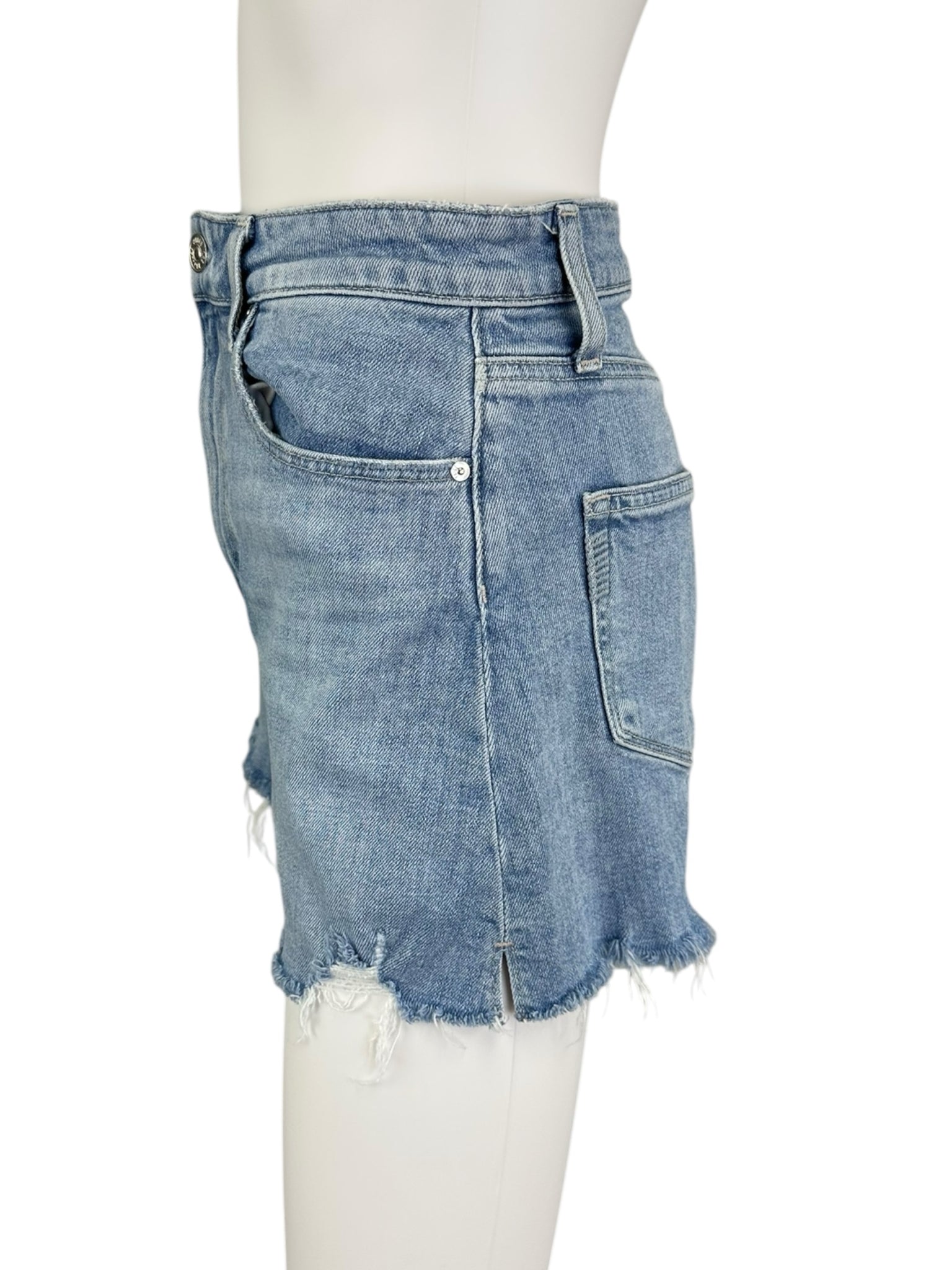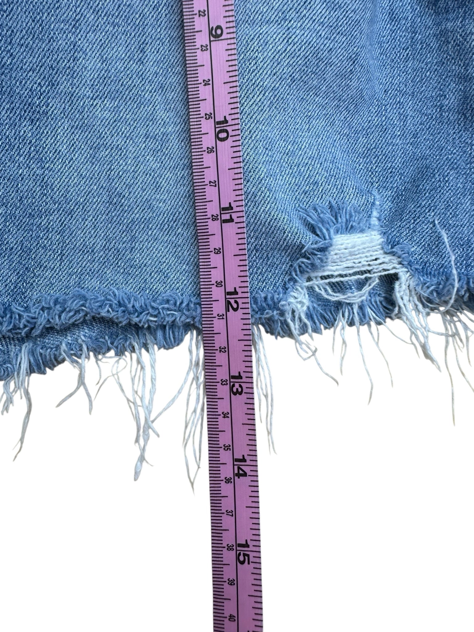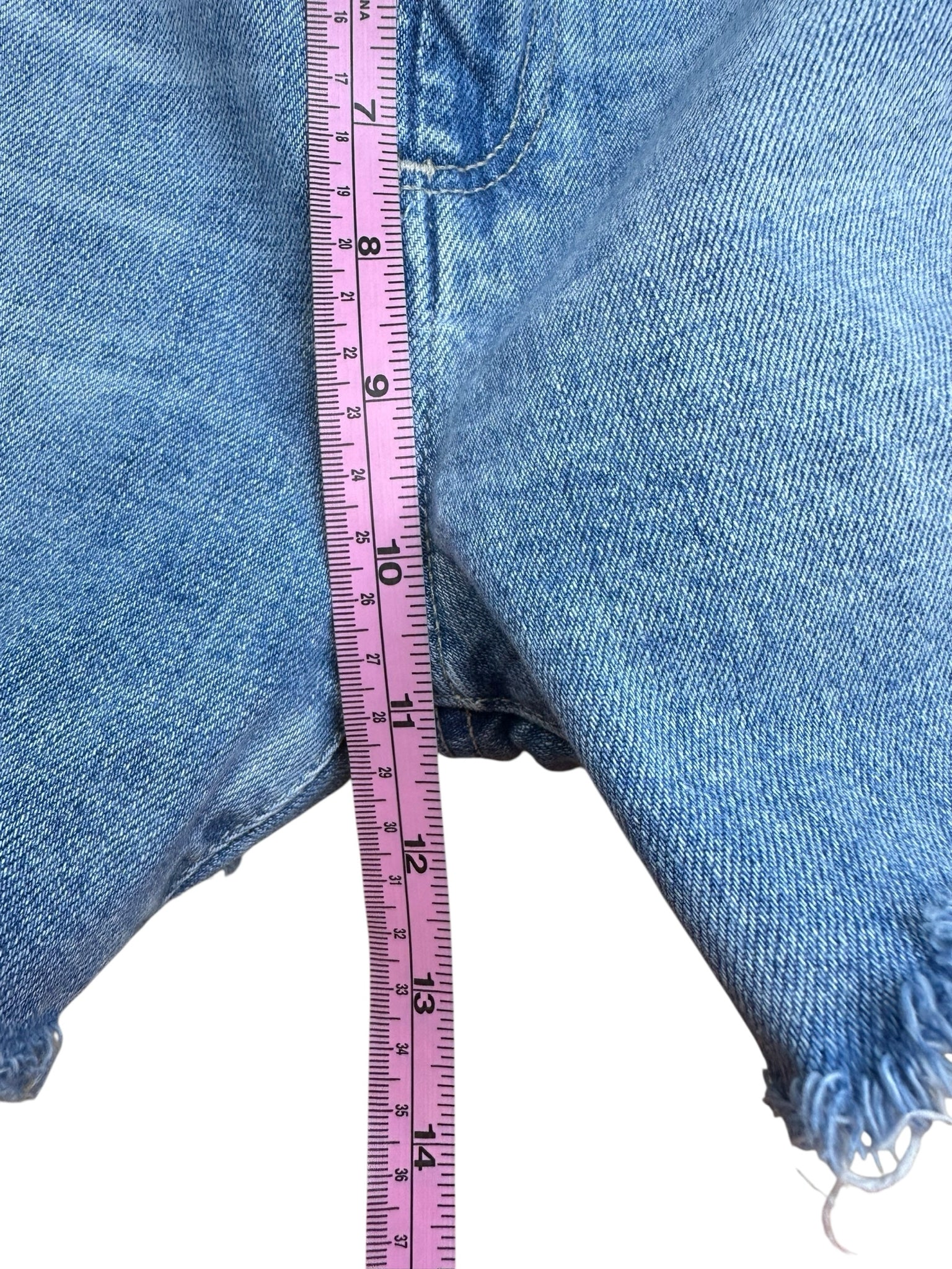 Blue distressed light wash 'dani short' with frayed bottom, high rise. zip and button closure with 5 pockets.