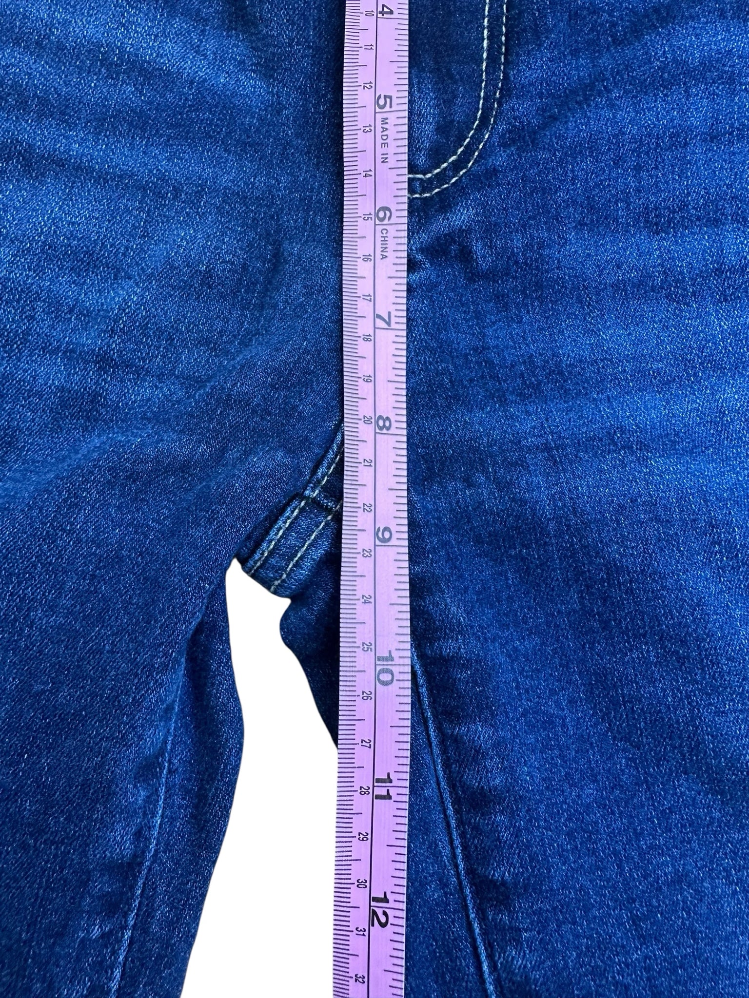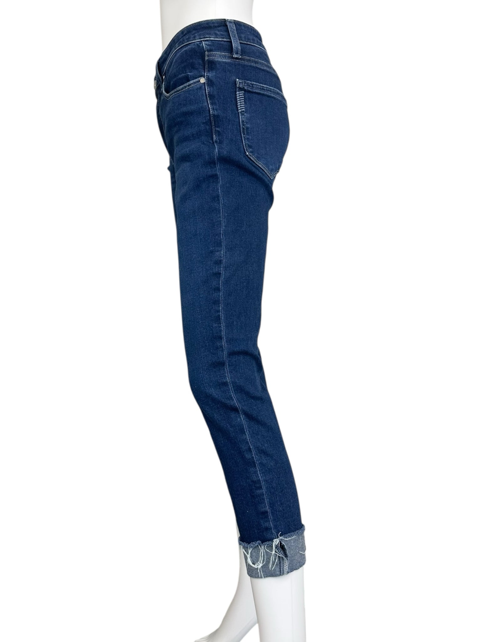 Blue dark wash skyline skinny cropped jeans with a classic 5 pocket design with a zipper/button fly. Jeans have a raw edge cropped ankle and are made from a cotton blend fabric.