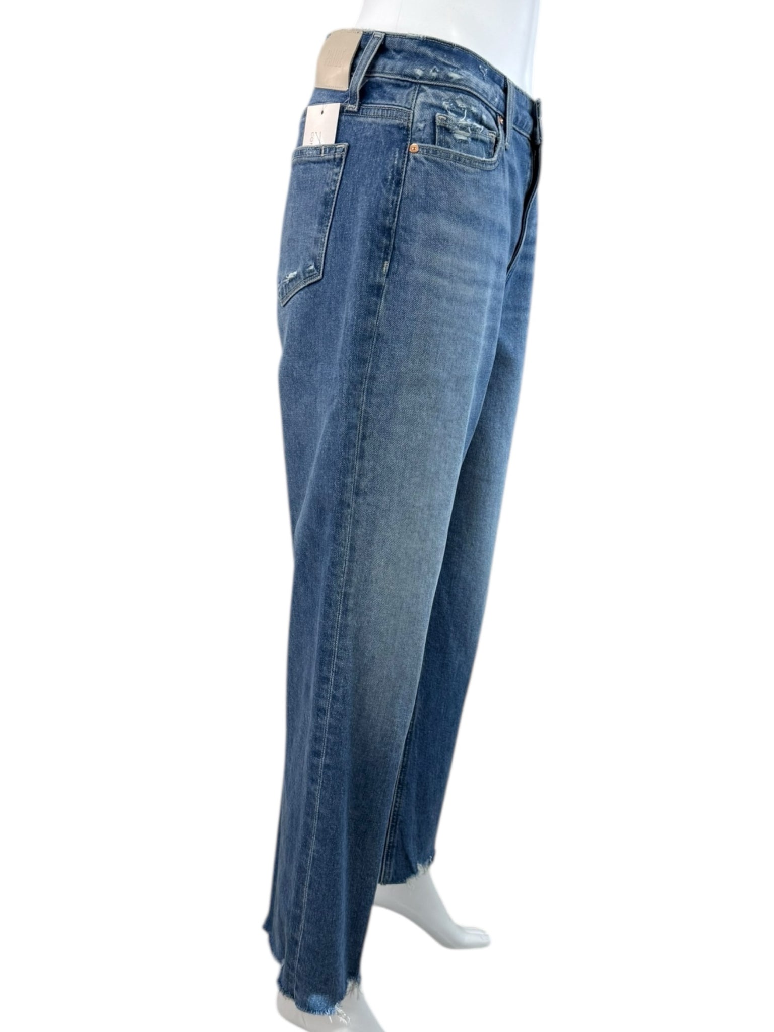 Medium wash high waisted blue denim wide leg leenah ankle jeans with a classic 5 pocket design and zip/button closure.