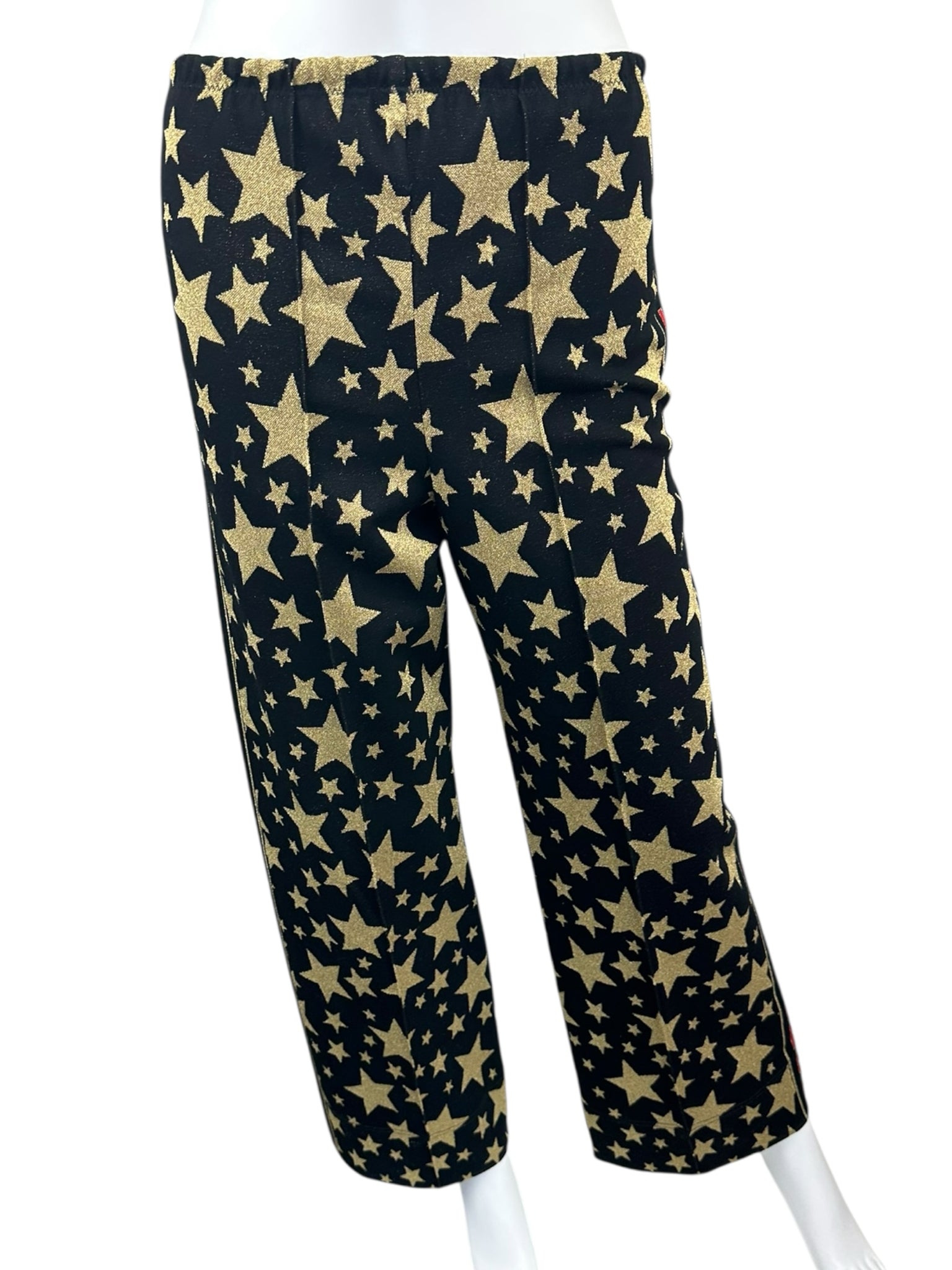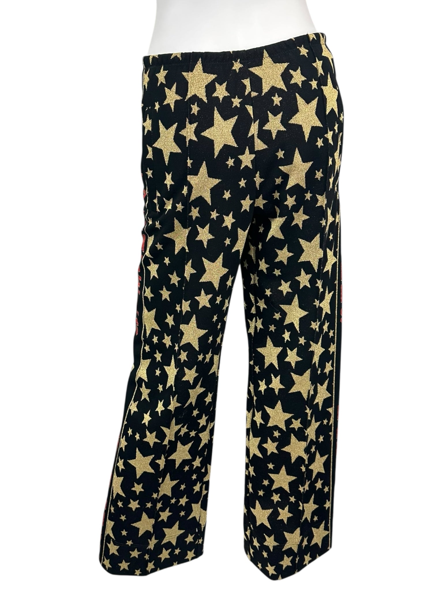 Black with metallic gold star pattern pull on style track pants with front pockets and graphic side stripe.