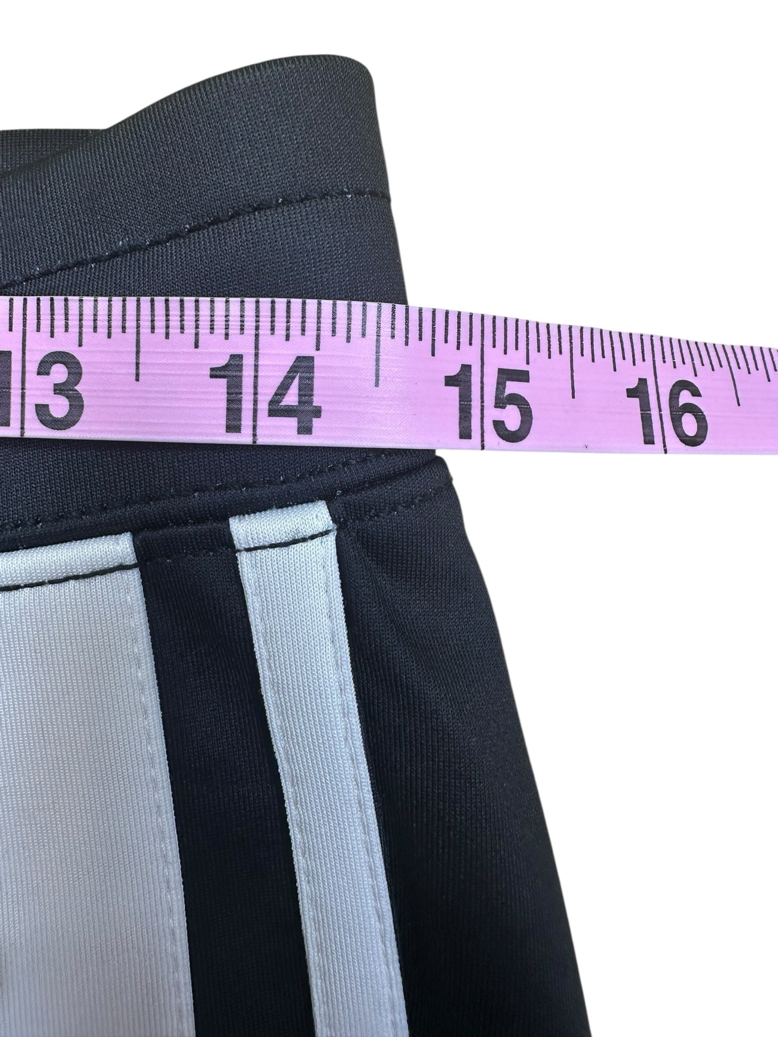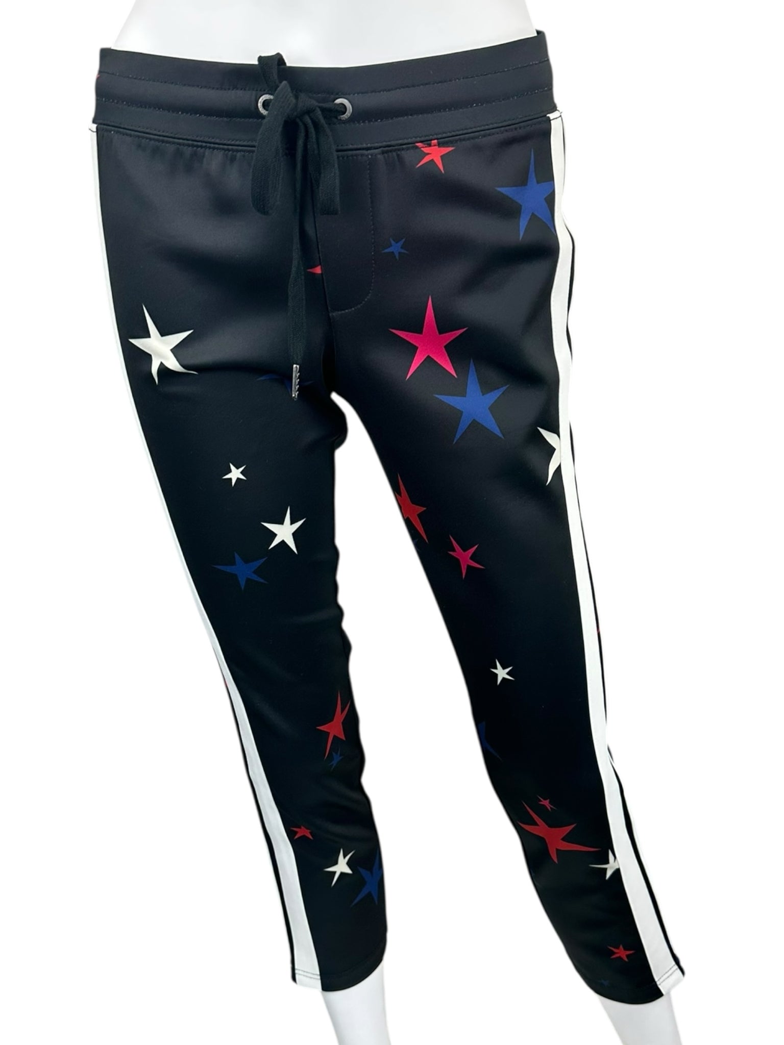 Black multi-colored star pattern track pants with adjustable tie waist and ankle zippers.
