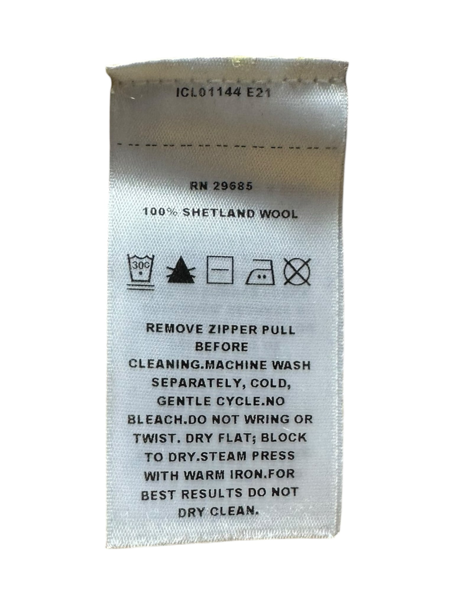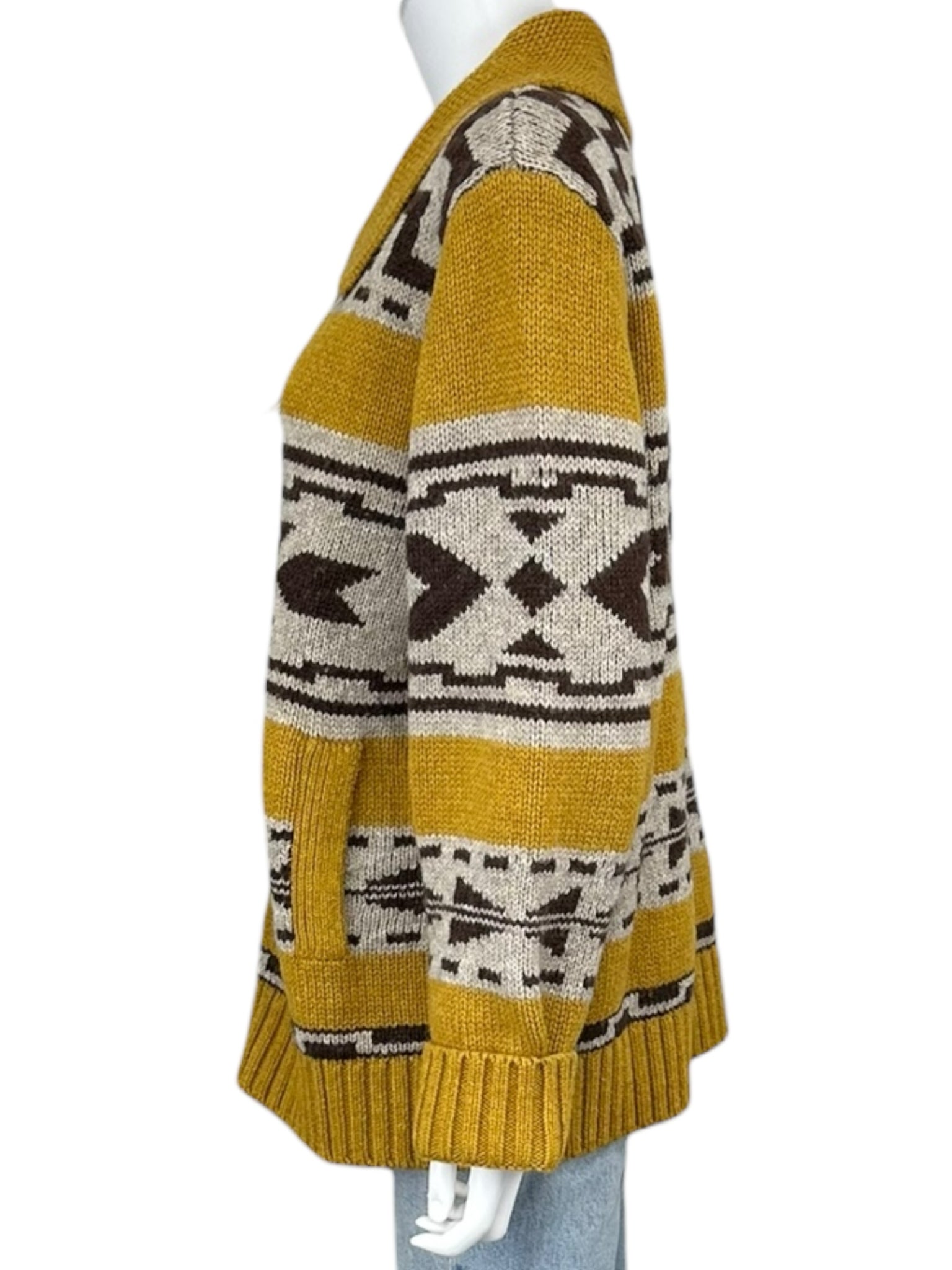 Light brown and yellow striped long sleeve with brown tribal pattern all over and two front pockets with silver zipper closure down the front. Heavy knit sweater.