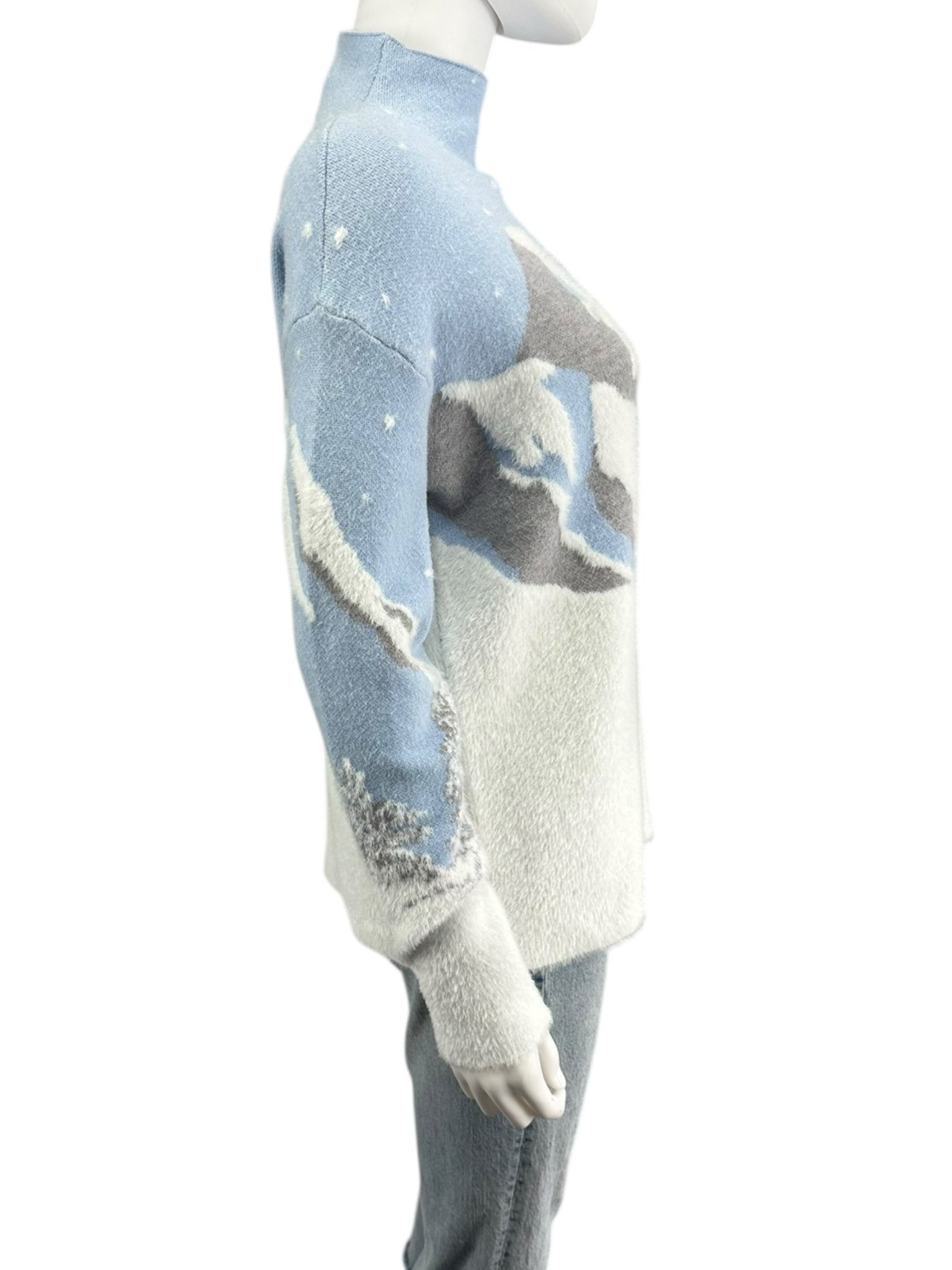Super soft and cozy light blue and white winter mountain range pullover sweater with long sleeves and a mock neck.