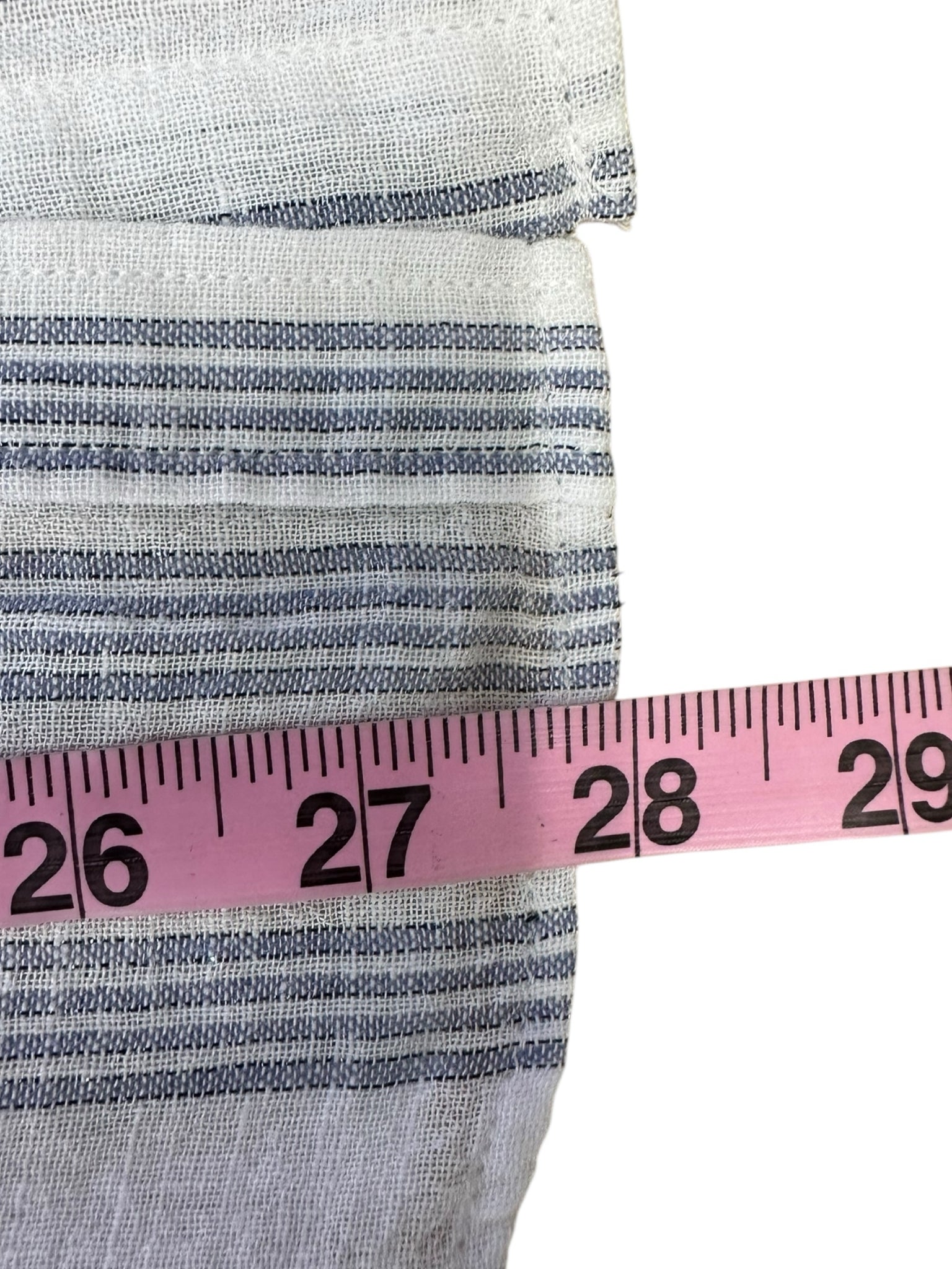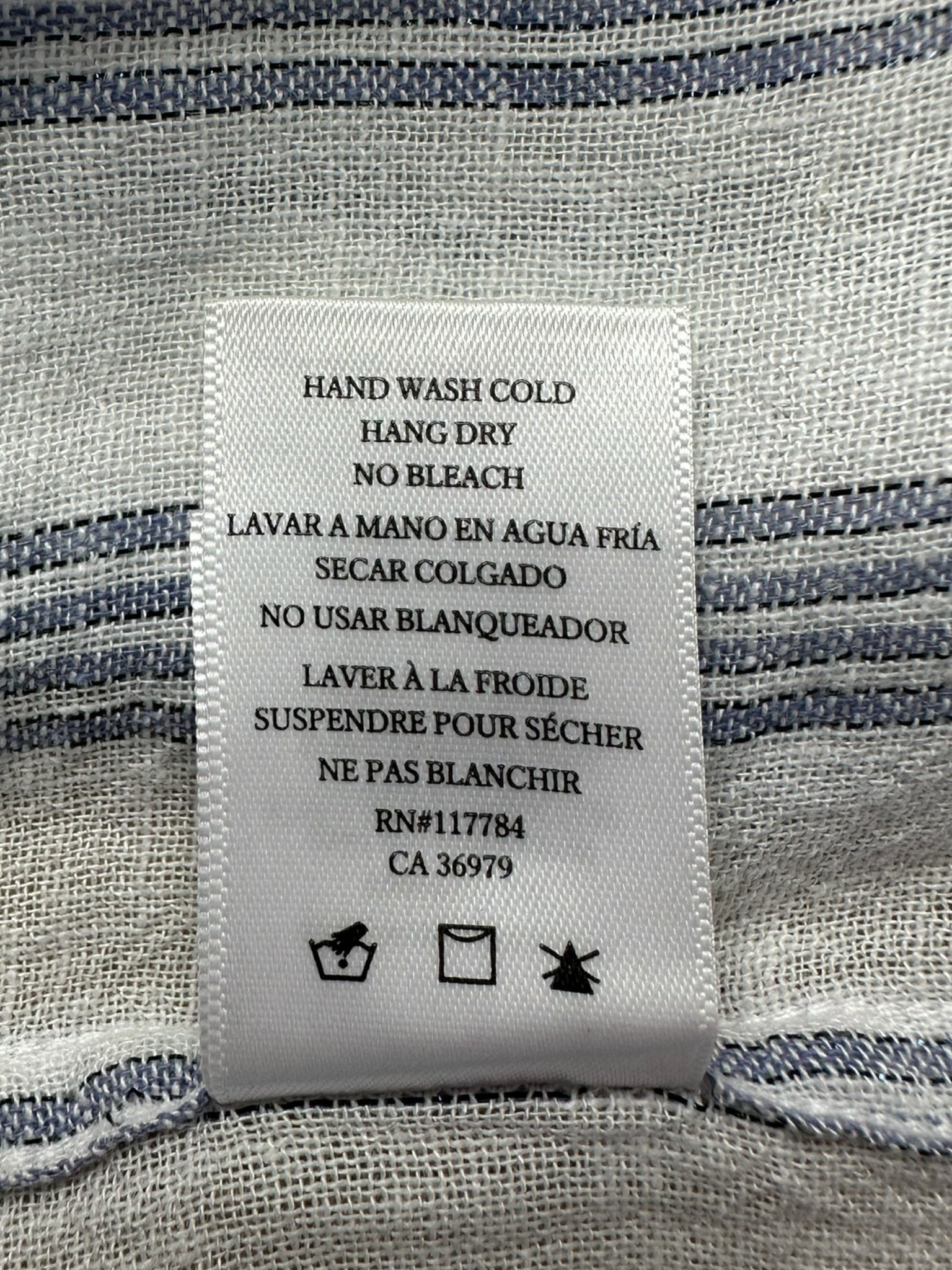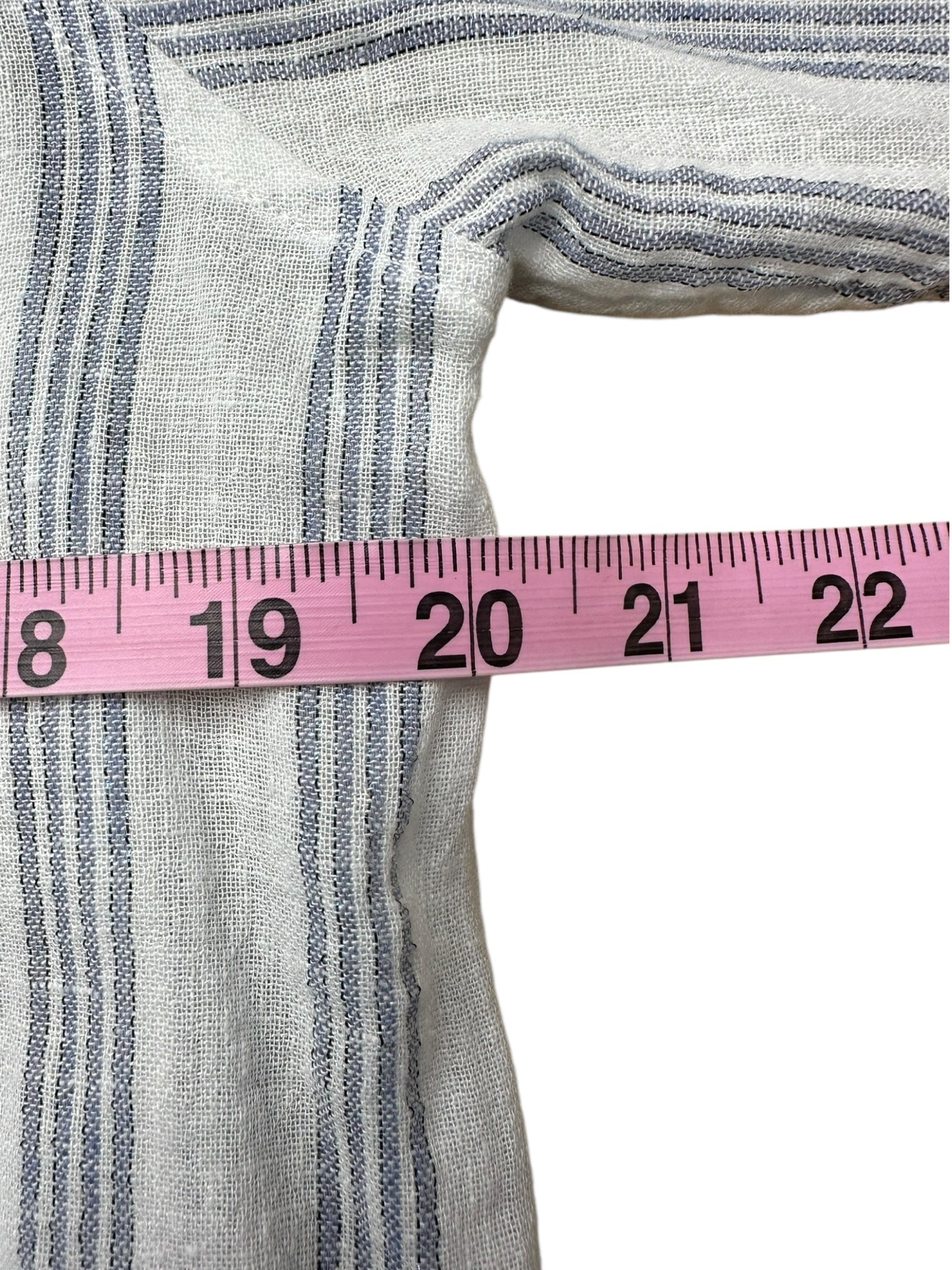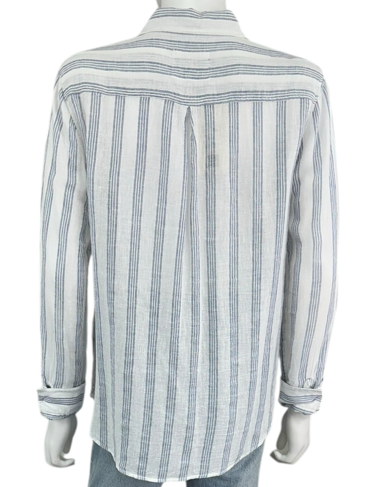 Lightweight white with blue striped pattern top with long button cuff sleeves, single chest pocket and a button front closure. Top is made from a linen blend fabric.