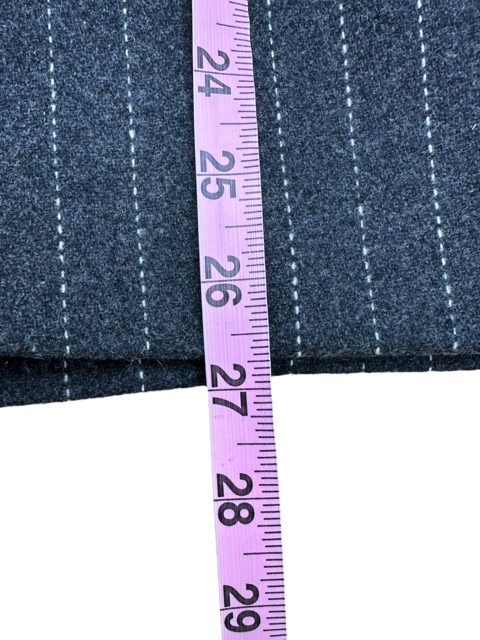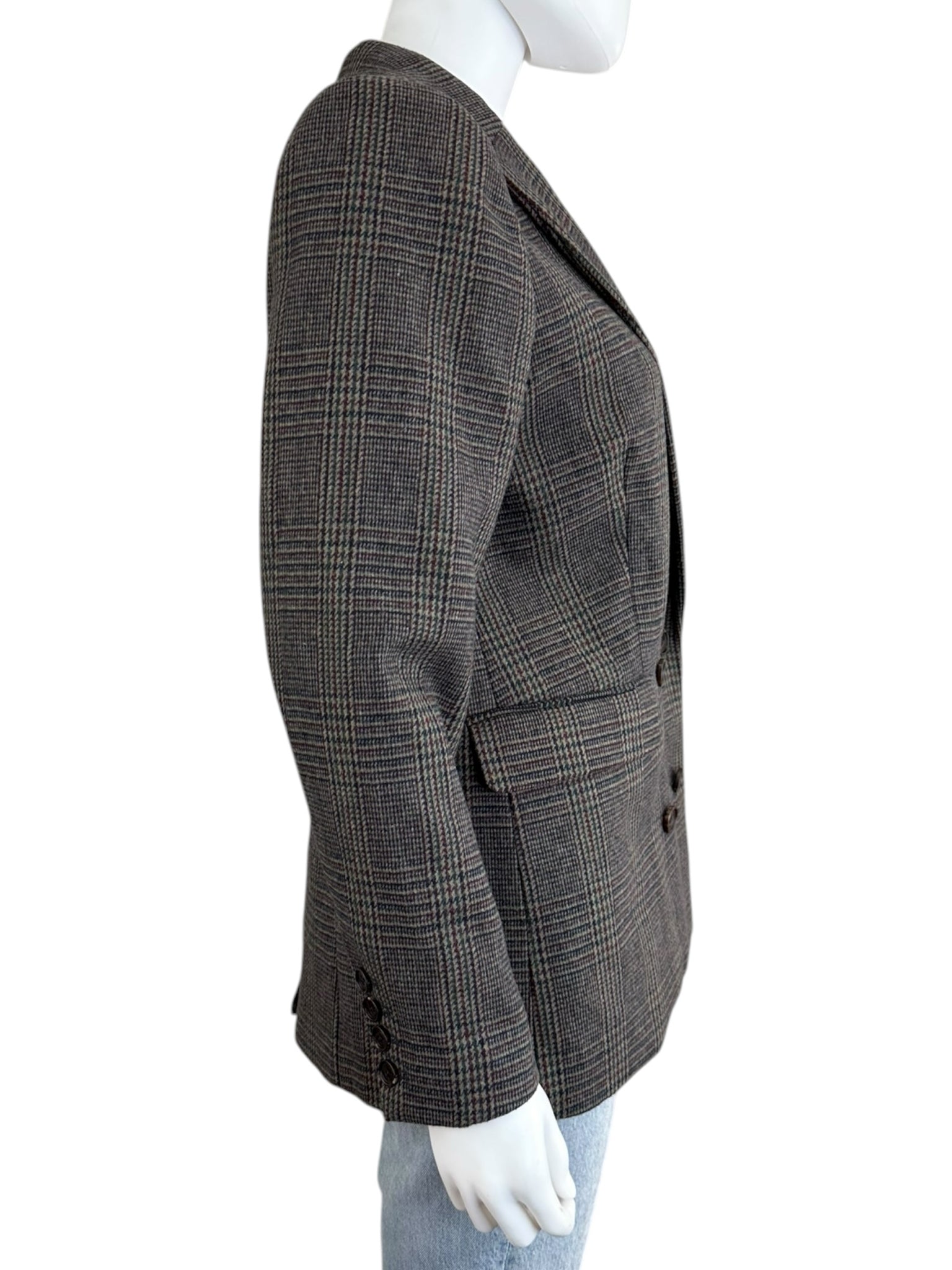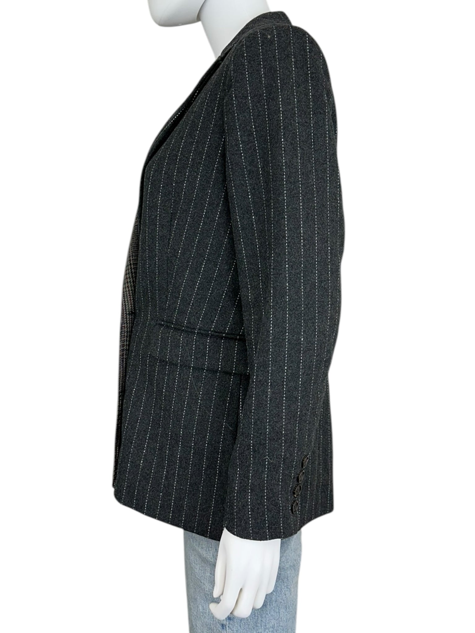 Warm and cozy Cody mixed mini check and pinstripe wool blend blazer in new condition. Blazer features a notched collar, long sleeves and a front double breasted closure. Blazer has two front pockets and a back single vent that are both still stitched cl