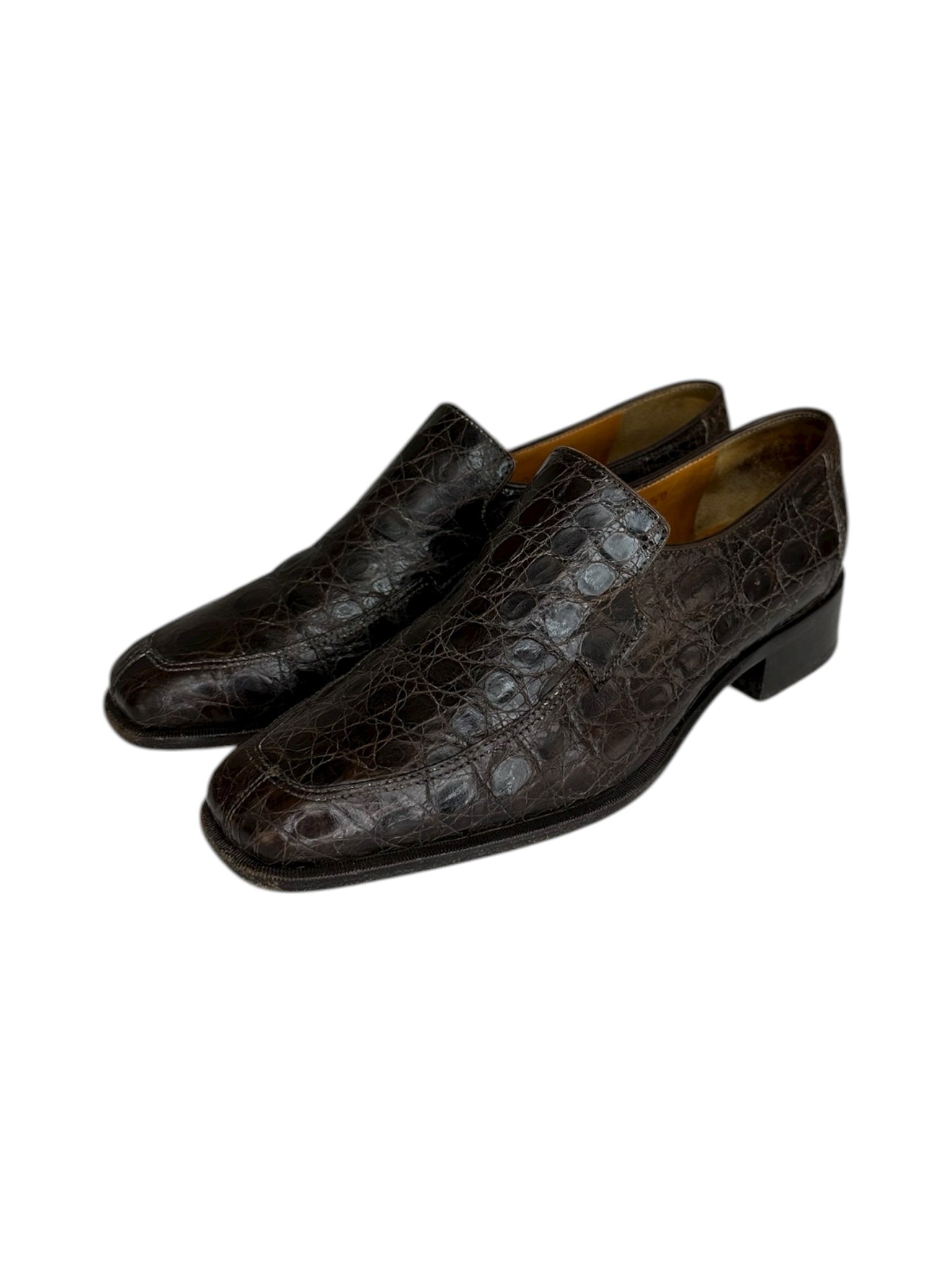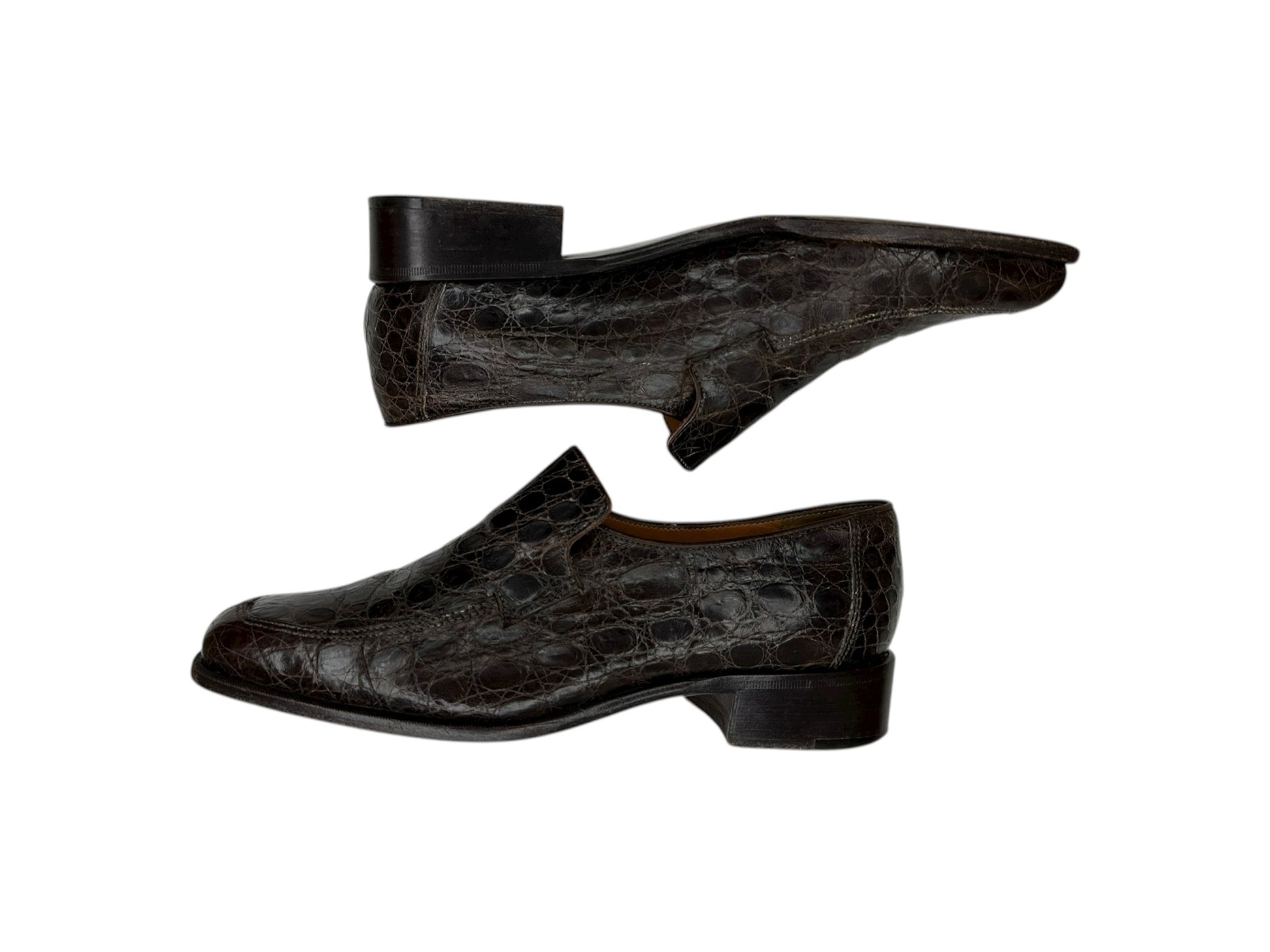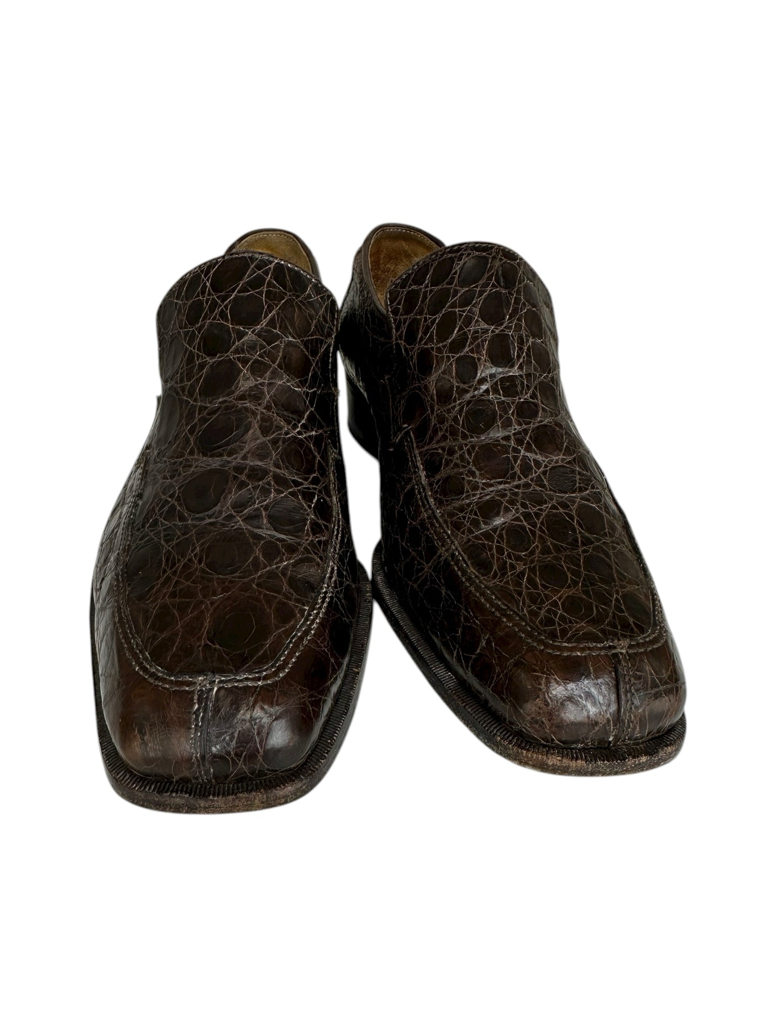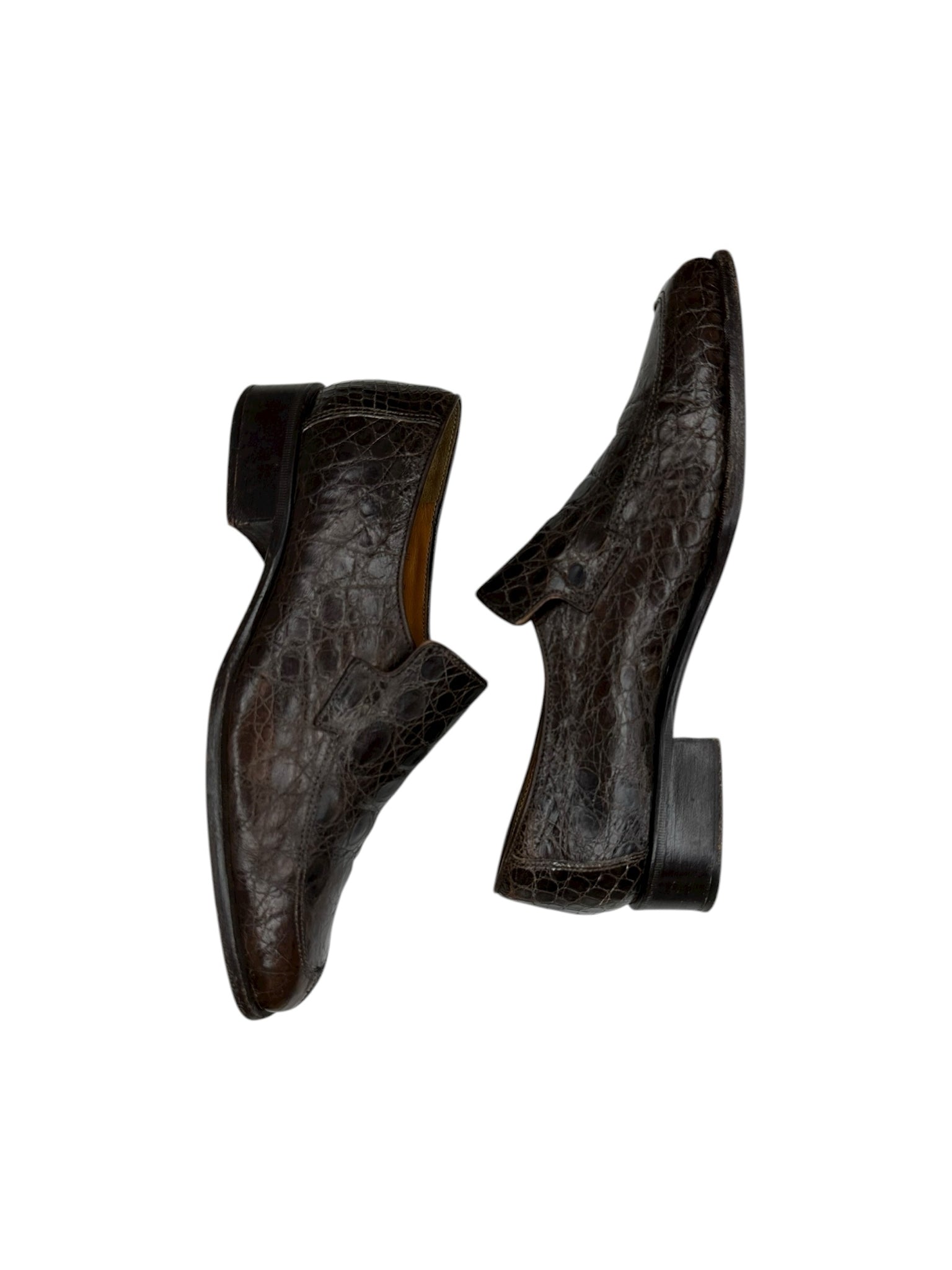 Vintage dark brown leather with a crocodile embossed texture and a low 1.0" block heel with slightly squared toe. Comes with dust bag.