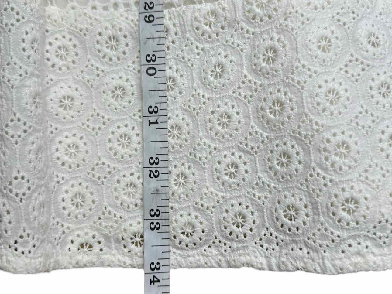 Cream 100% cotton eyelet lace mini dress with short sleeves and a back keyhole opening with button closure.