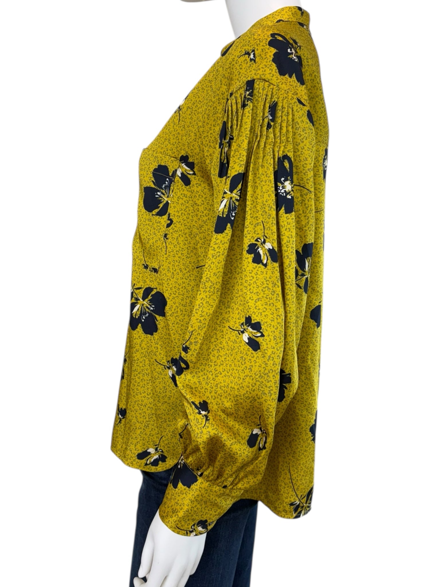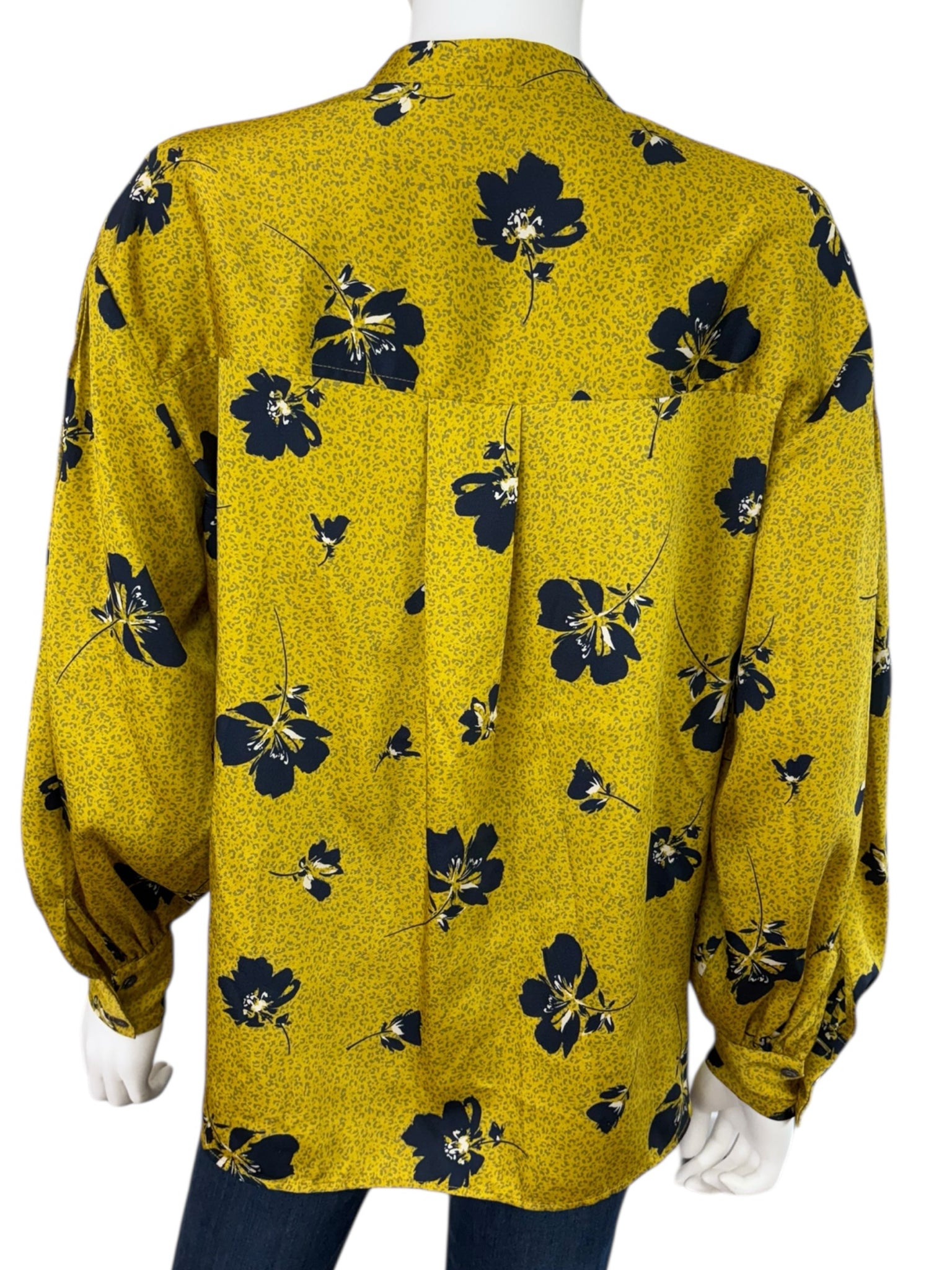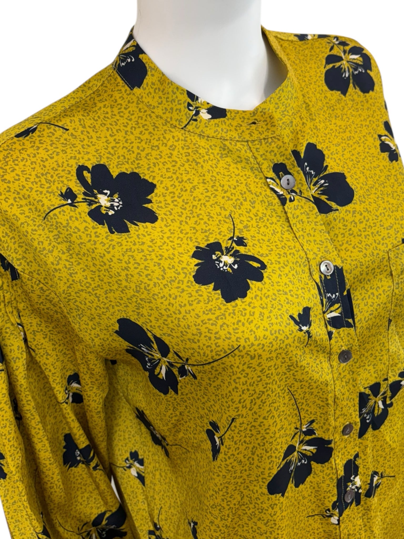 Mustard yellow leopard print with black floral print top with long sleeves, chest pockets and a button front closure.