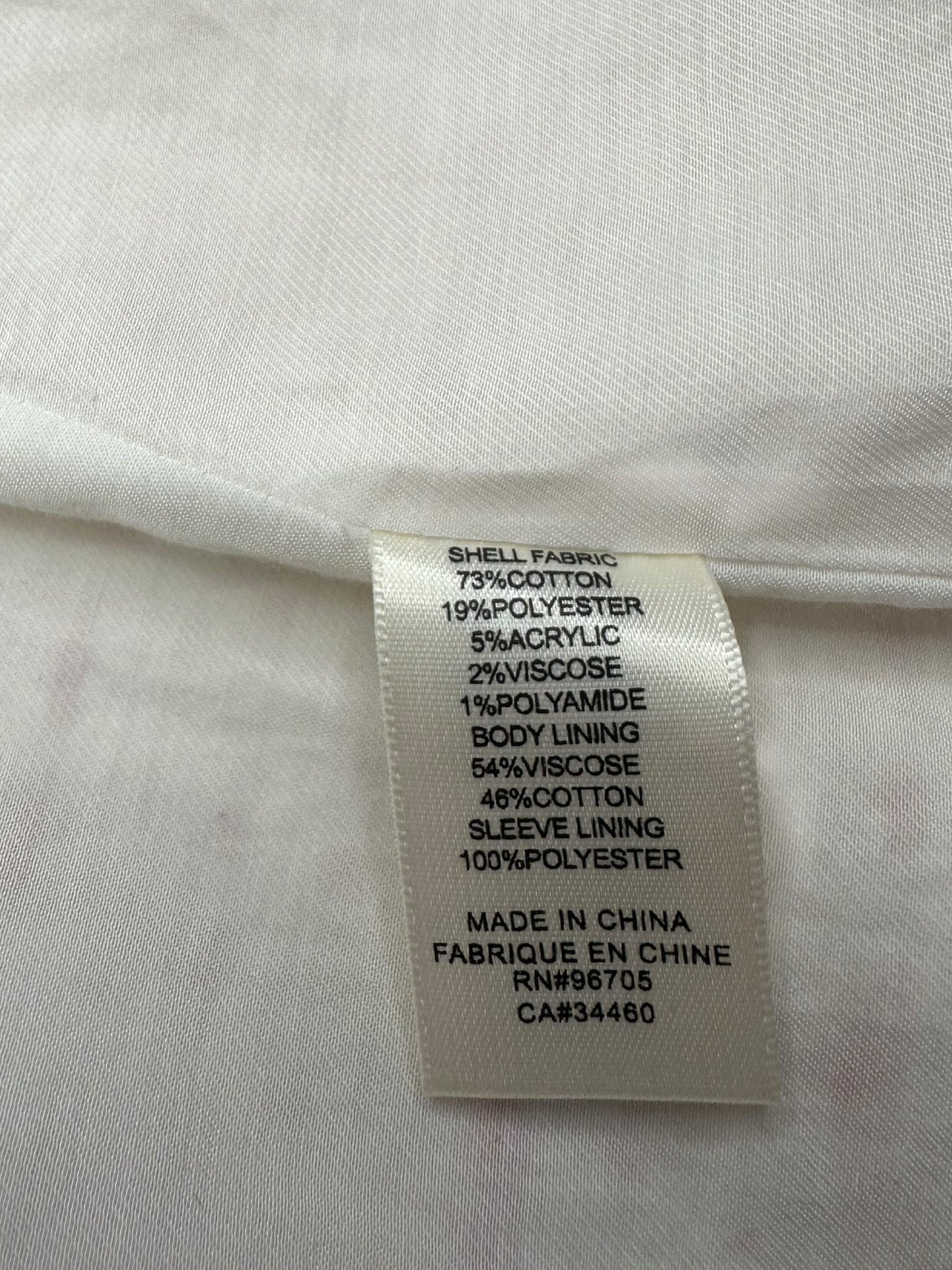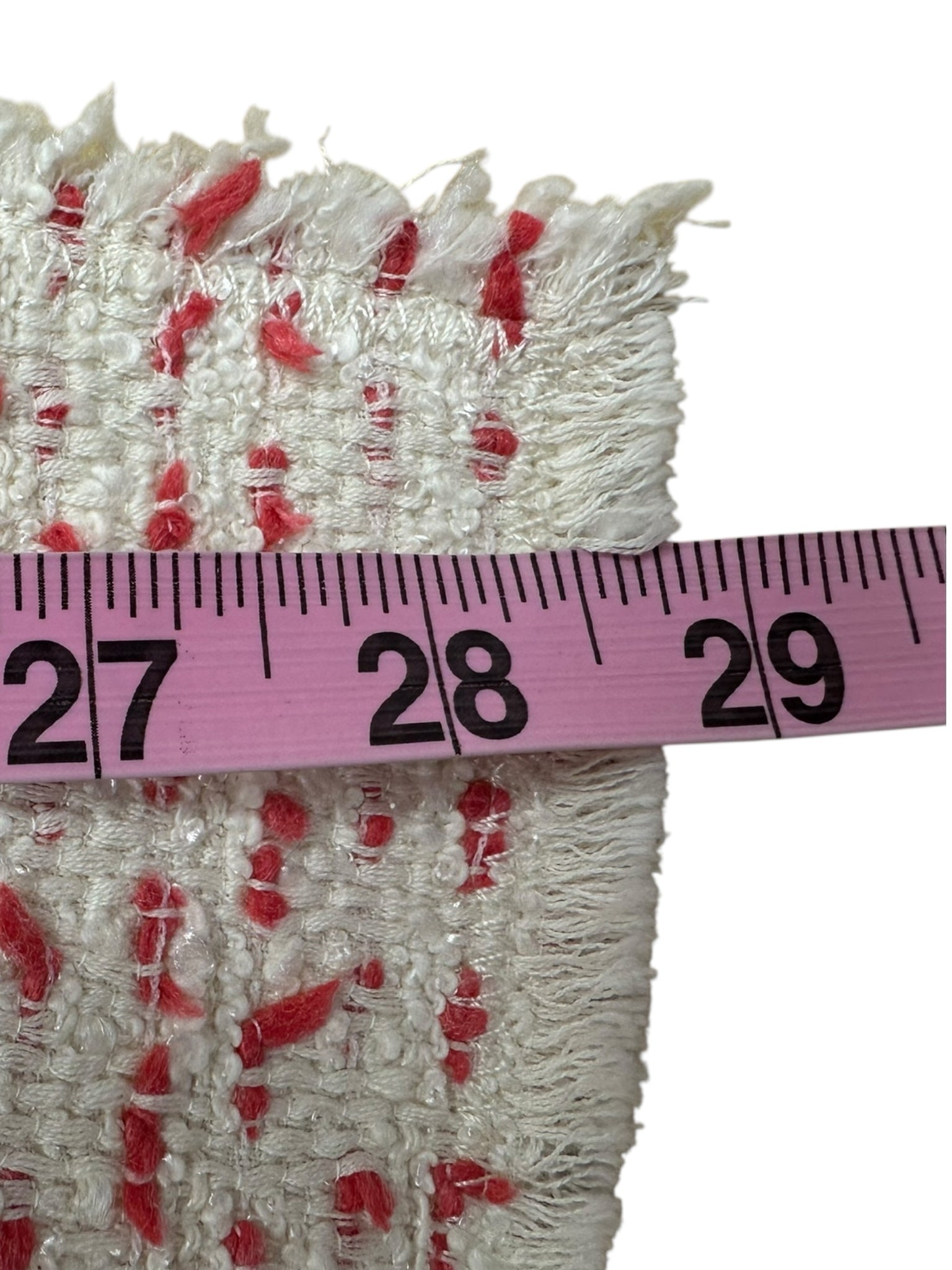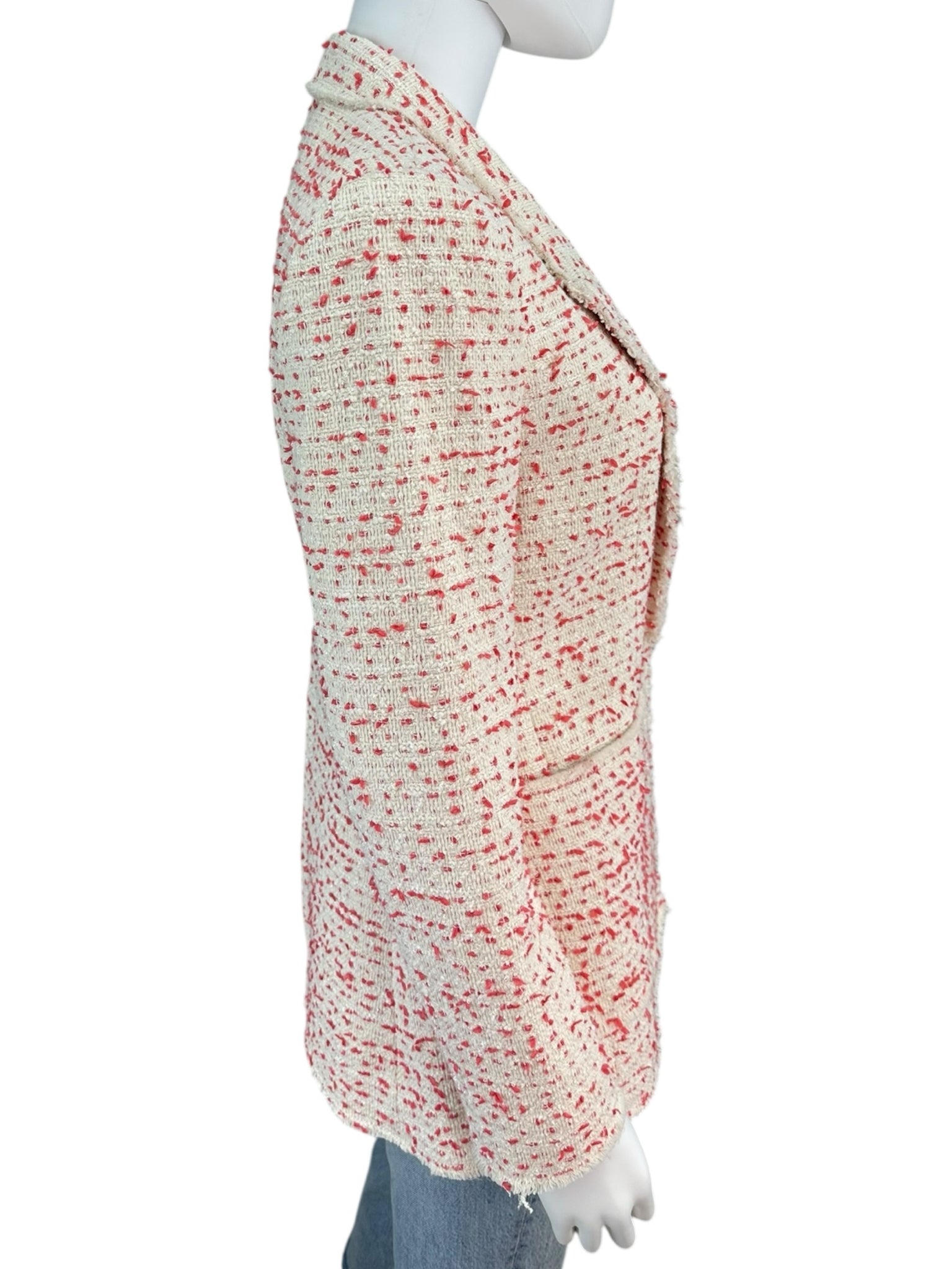 Super sharp white and pink tweed blazer featuring a notched collar, single front button closure, two front open pockets and long sleeves. Blazer is lined and has a fringe trim throughout. and is made from a soft cotton blend fabric.