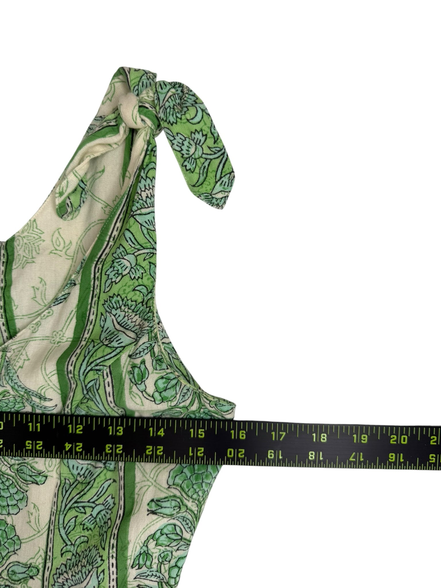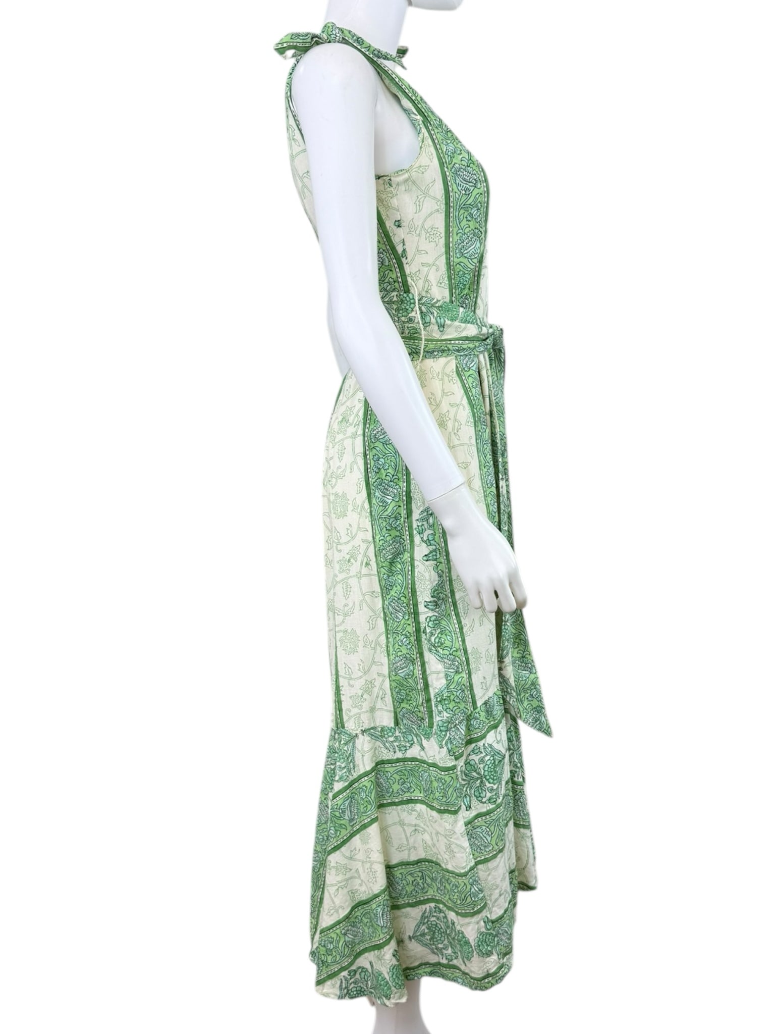 Cream and light green printed sleeveless maxi dress with a full button-down and a tying belt.
