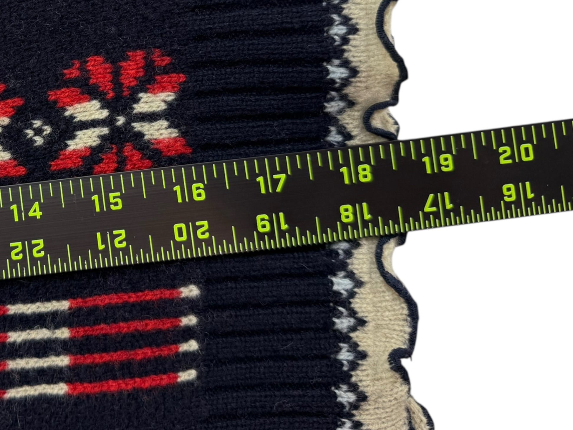 Navy blue, red and cream fair isle pattern sweater cardigan with high neck, long balloon sleeves, ruffle trim and zipper front closure. Sweater cardigan is made from an extra fine merino wool yarn.