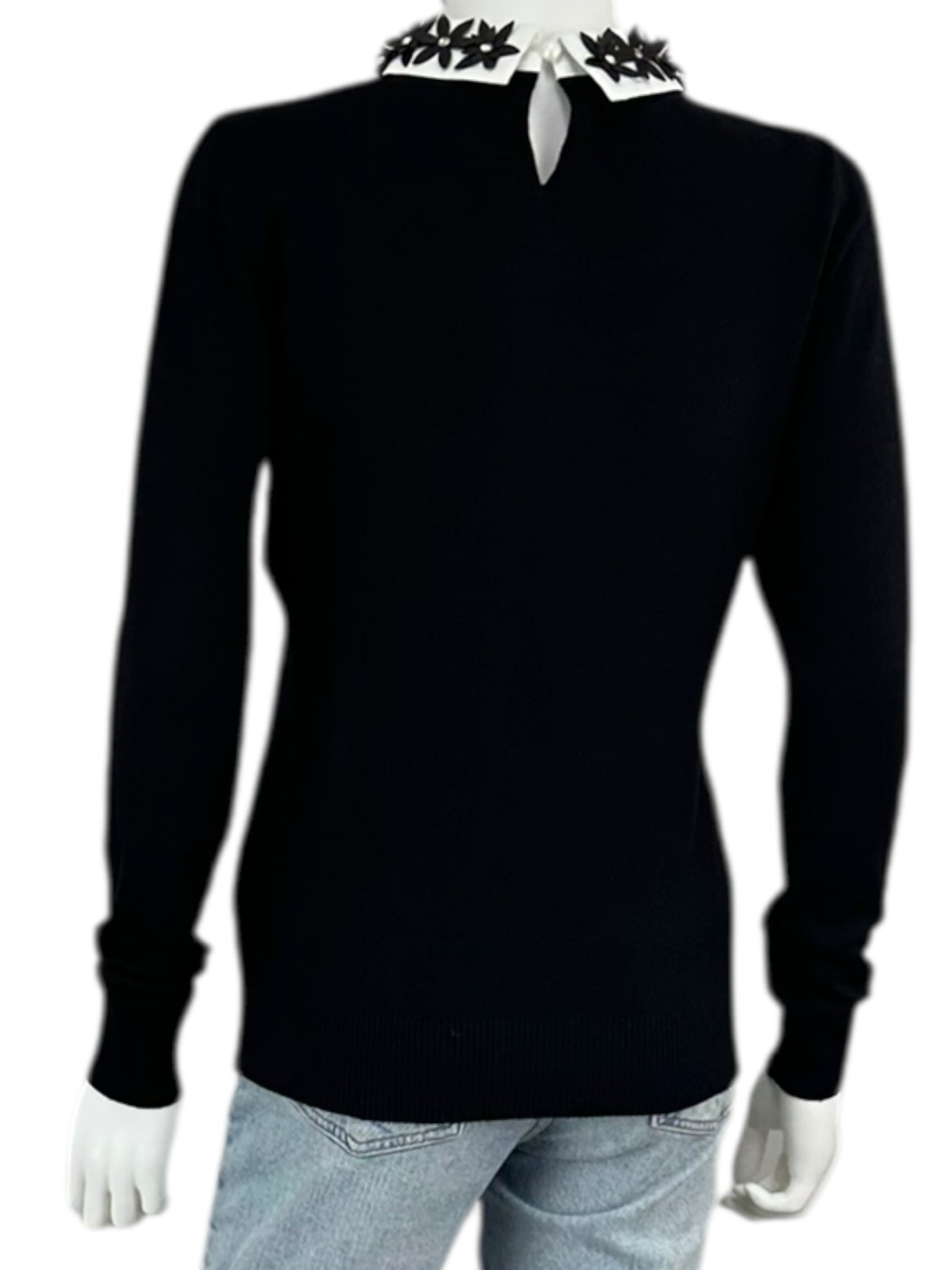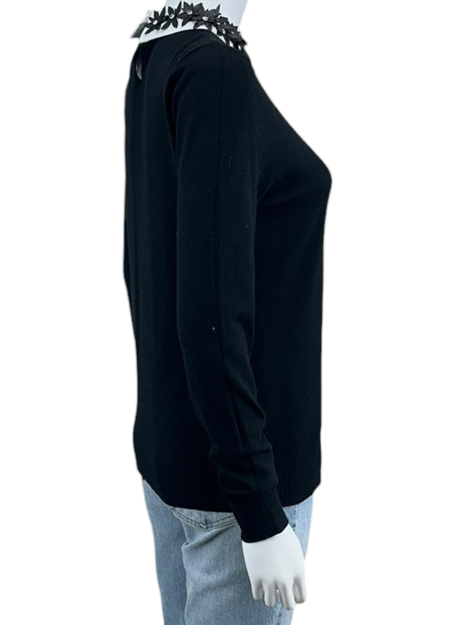 New with tags! Black thiin knit sweater with long sleeves and a black vegan leather floral embellished collar.