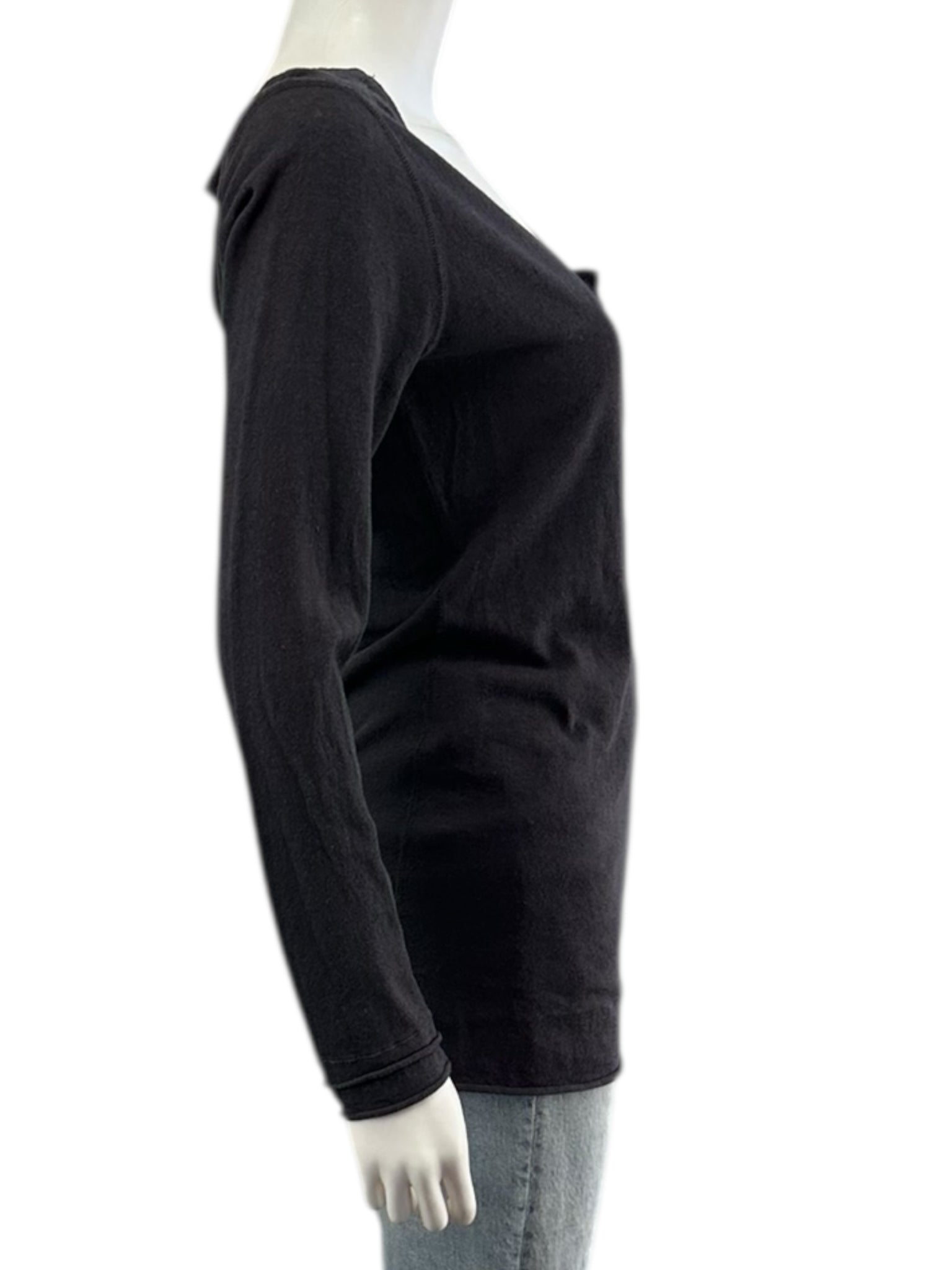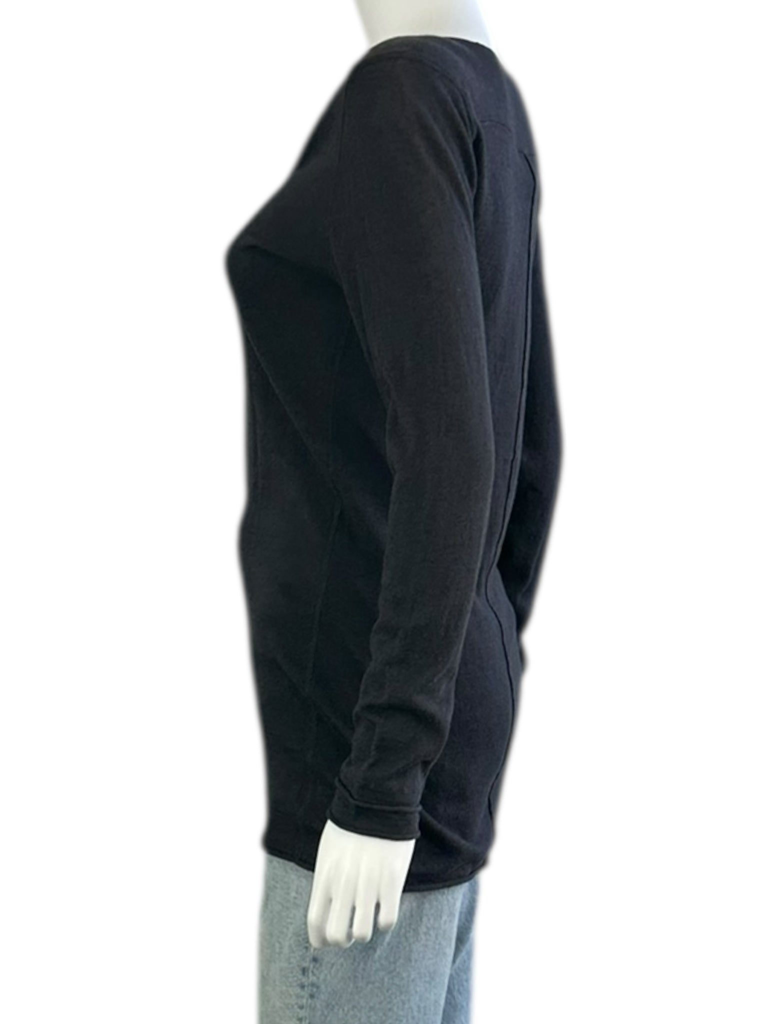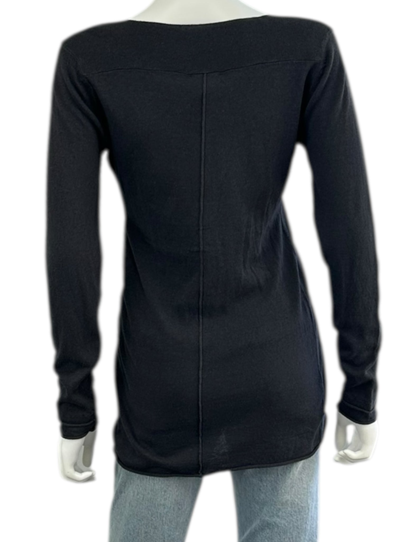 New with tags! Dark gray thin knit tunic length sweater with long sleeves, scoop neckline and button front closure. Sweater is made from a lightweight cotton and linen blend fabric and features a rolled hem.