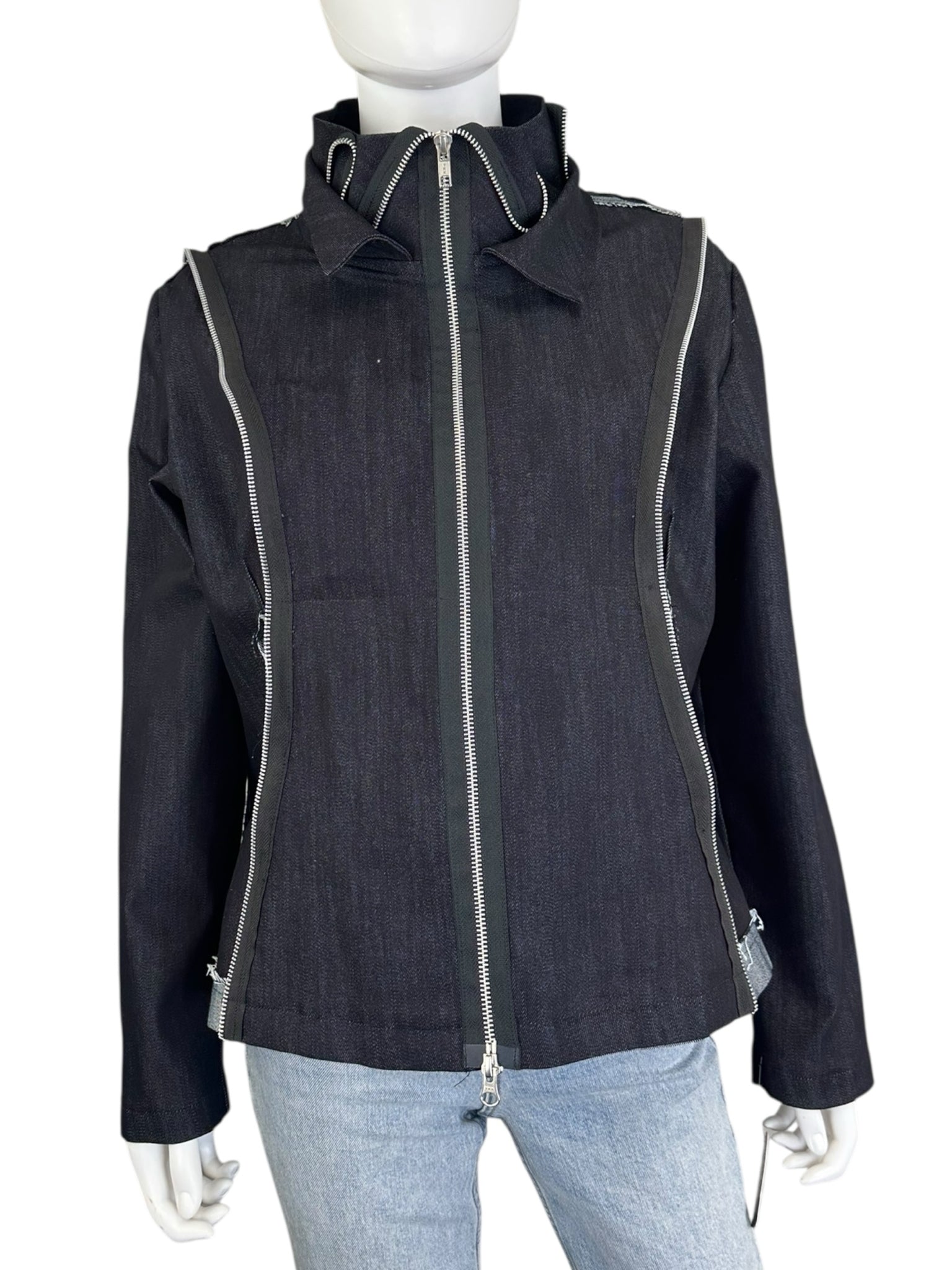 New with tags! Unique dark blue denim jacket with a distressed design, front pockets, long sleeves and a zipper front closure.