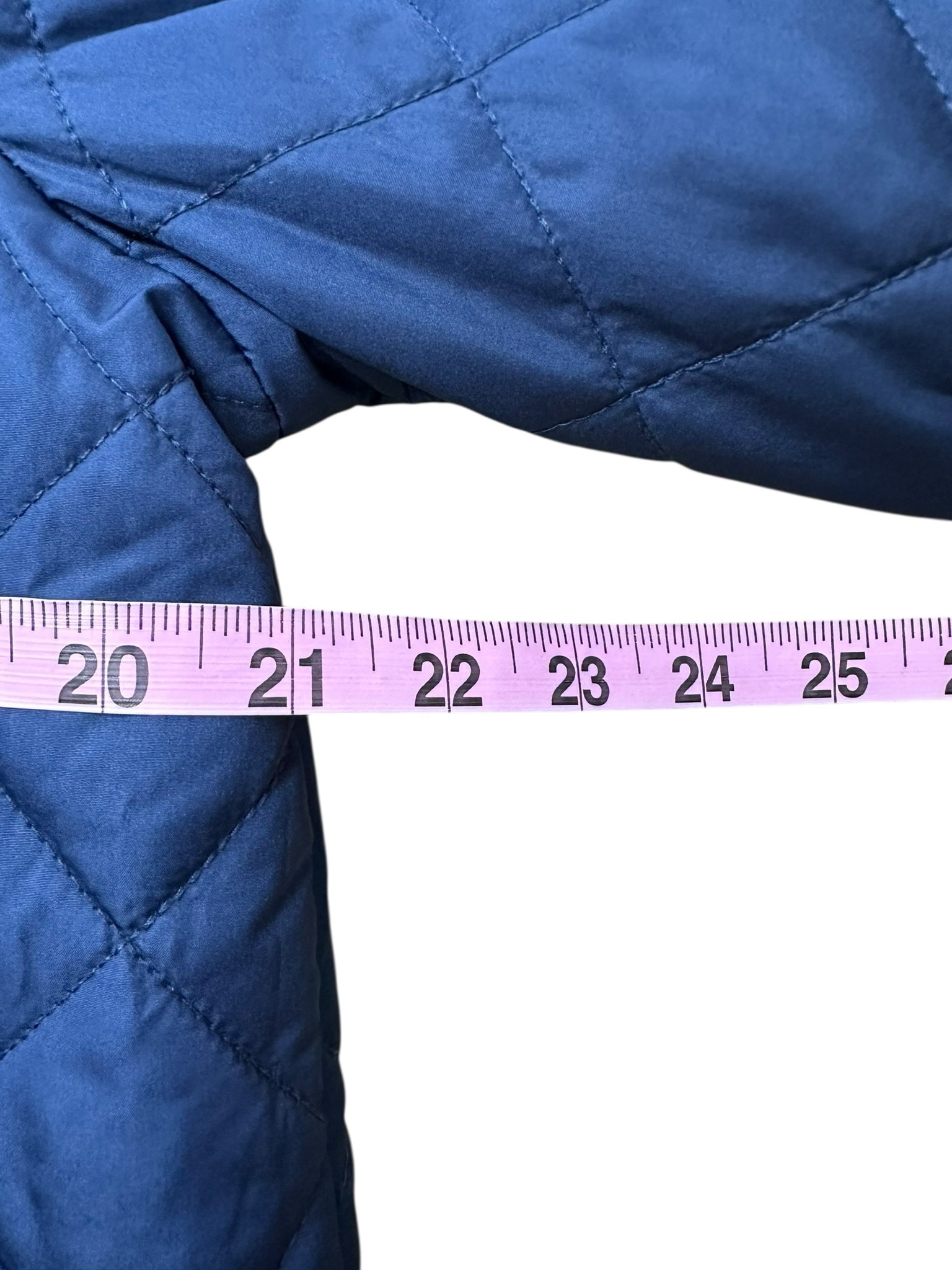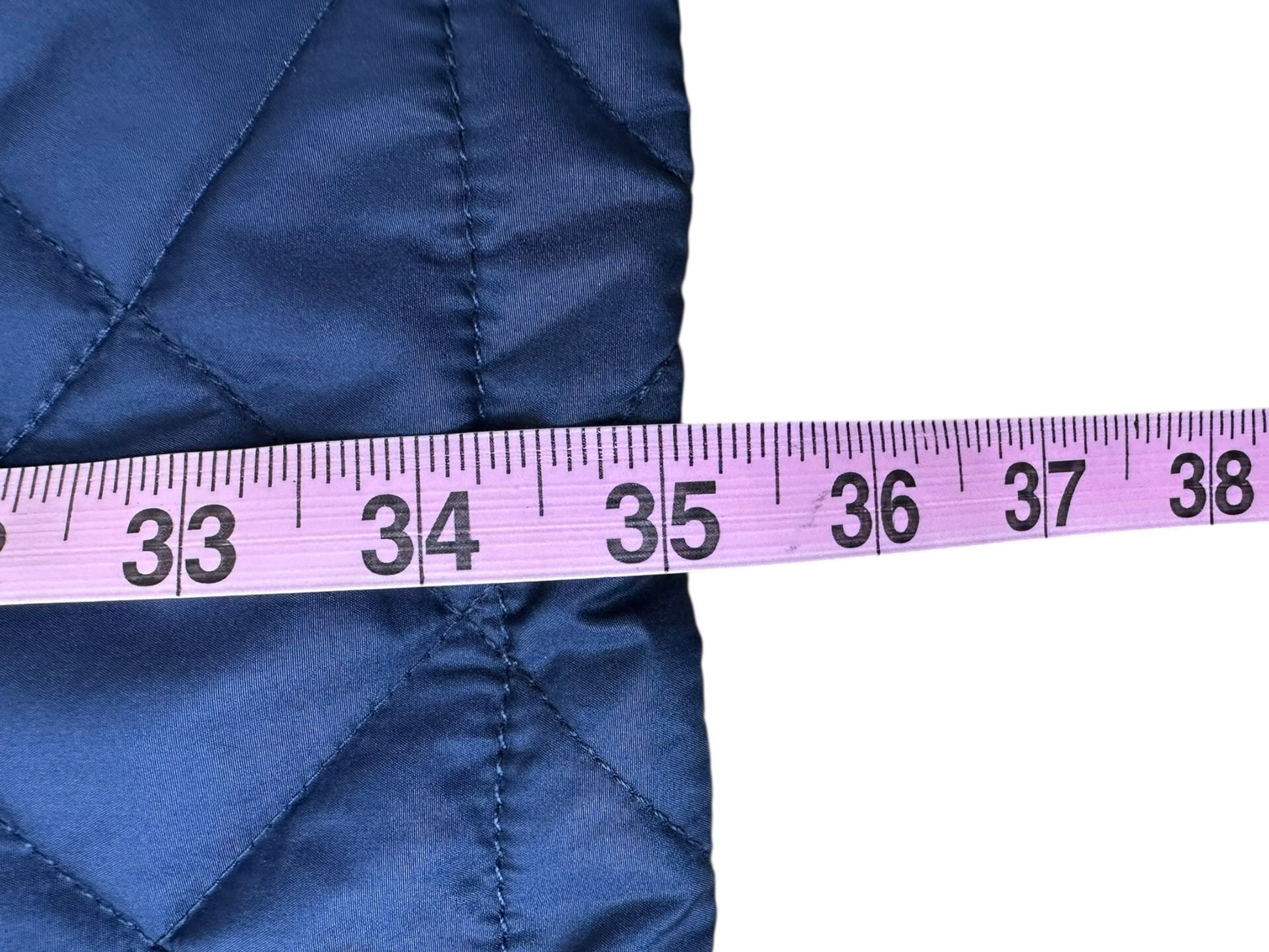 New with tags! Navy blue quilted long Fenya jacket with long sleeves, front pockets and a full front zipper closure. White striped cuffed wrist and neckline.
