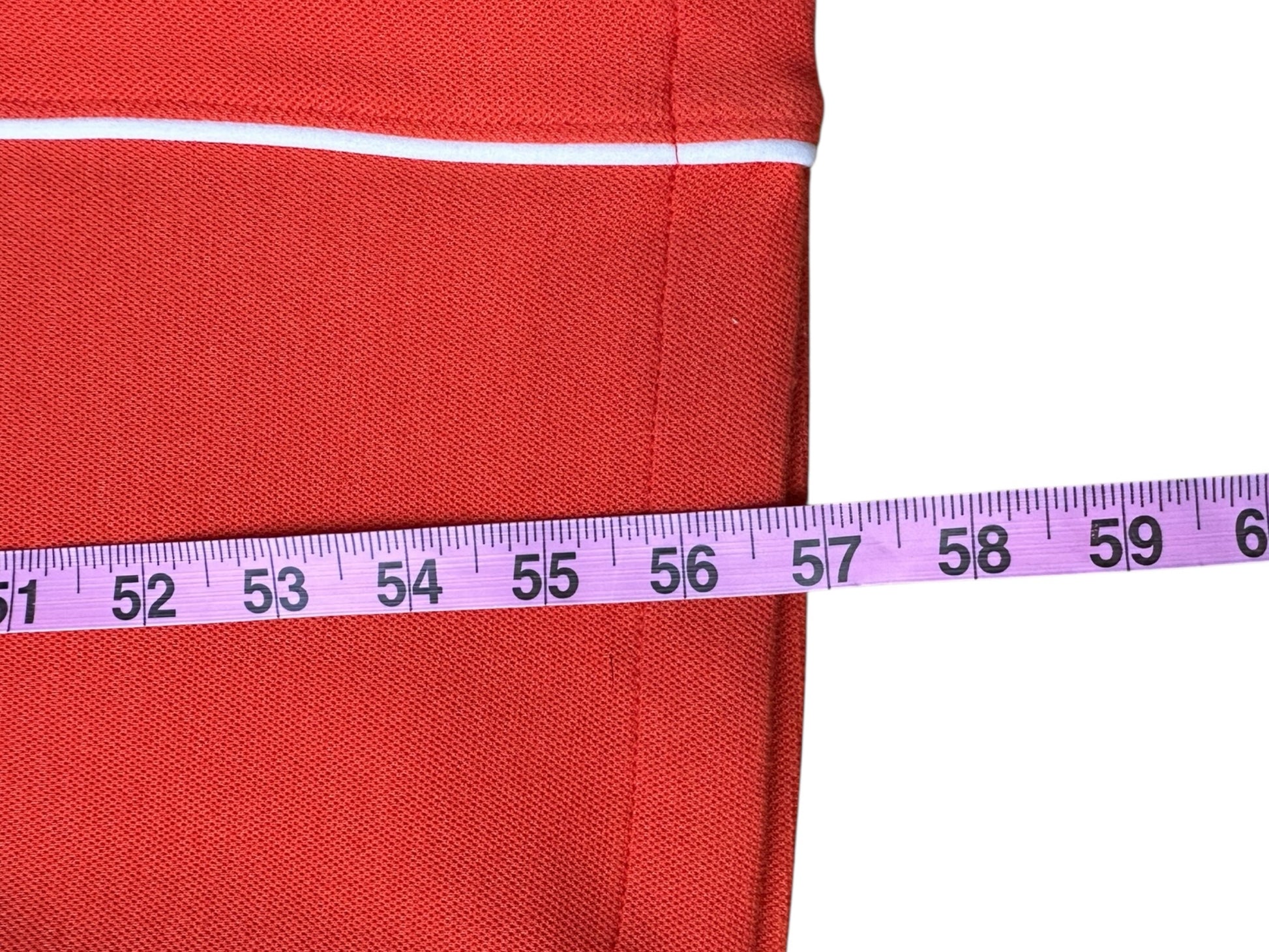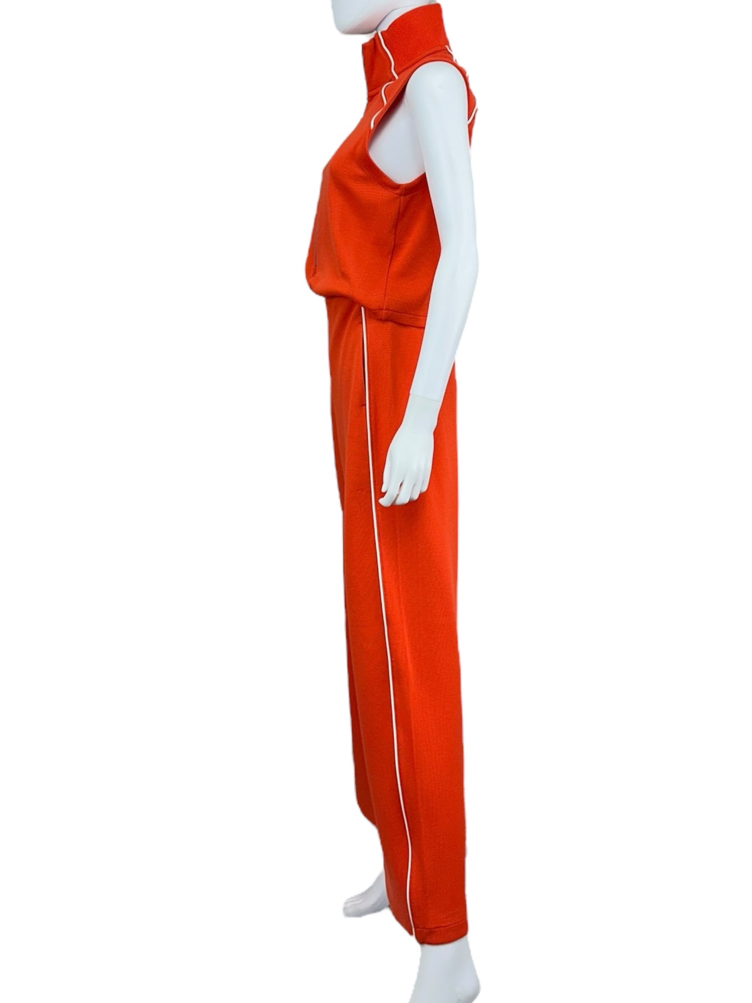 Orange stretch knit sleeveless wide leg jumpsuit with white trim, an elastic waistband and a zipper front closure.