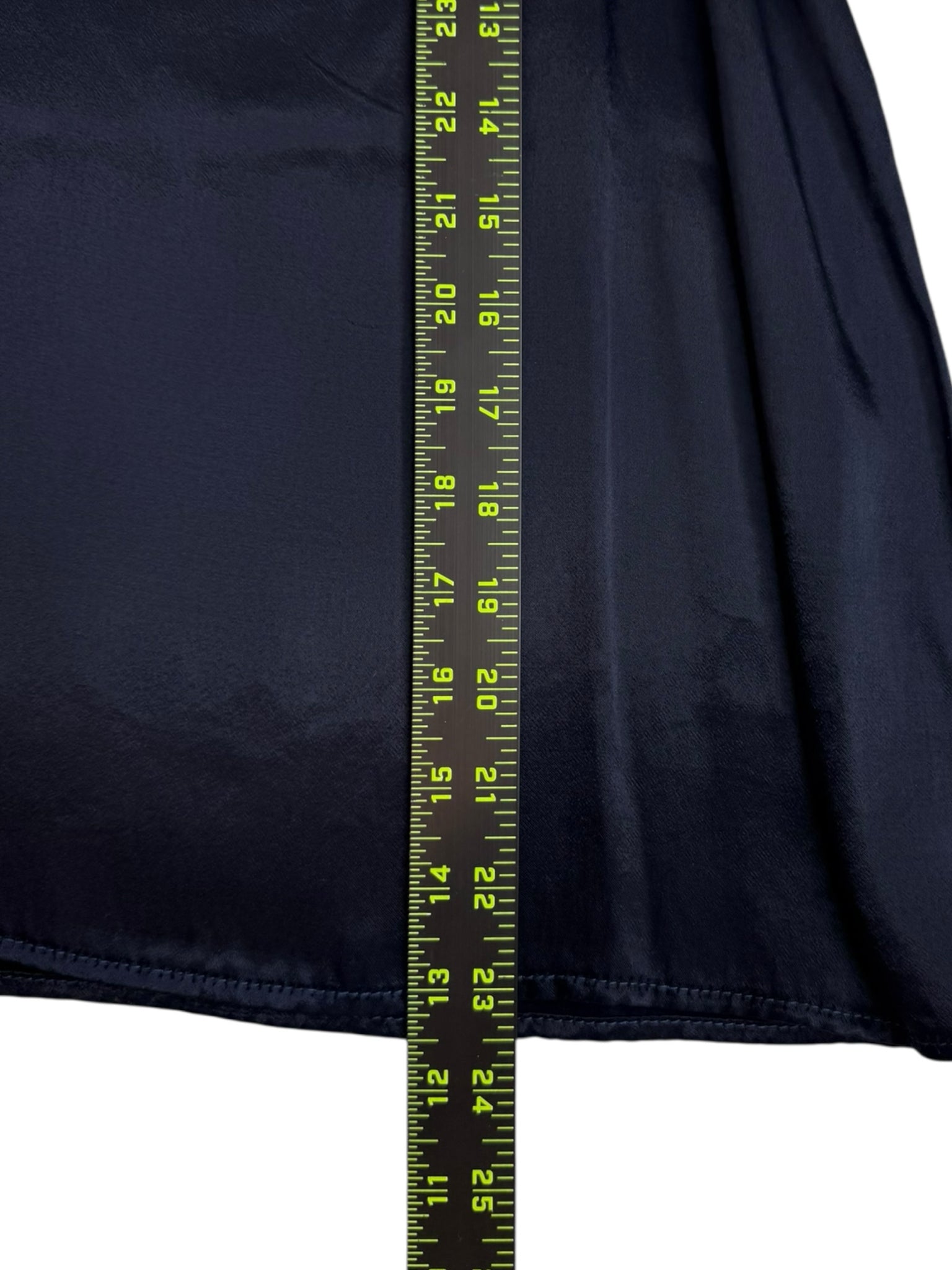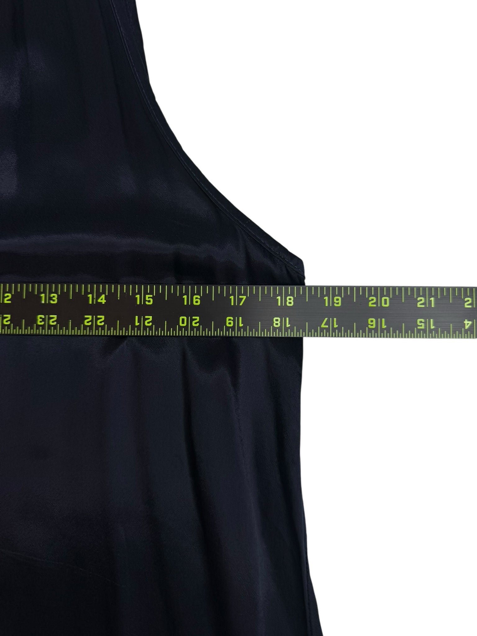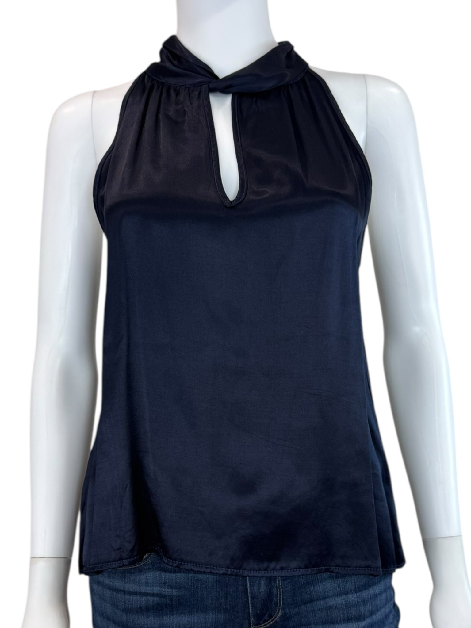 New with tags! Navy blue sleeveless satin top with high neckline and front keyhole opening with button closure in the back.