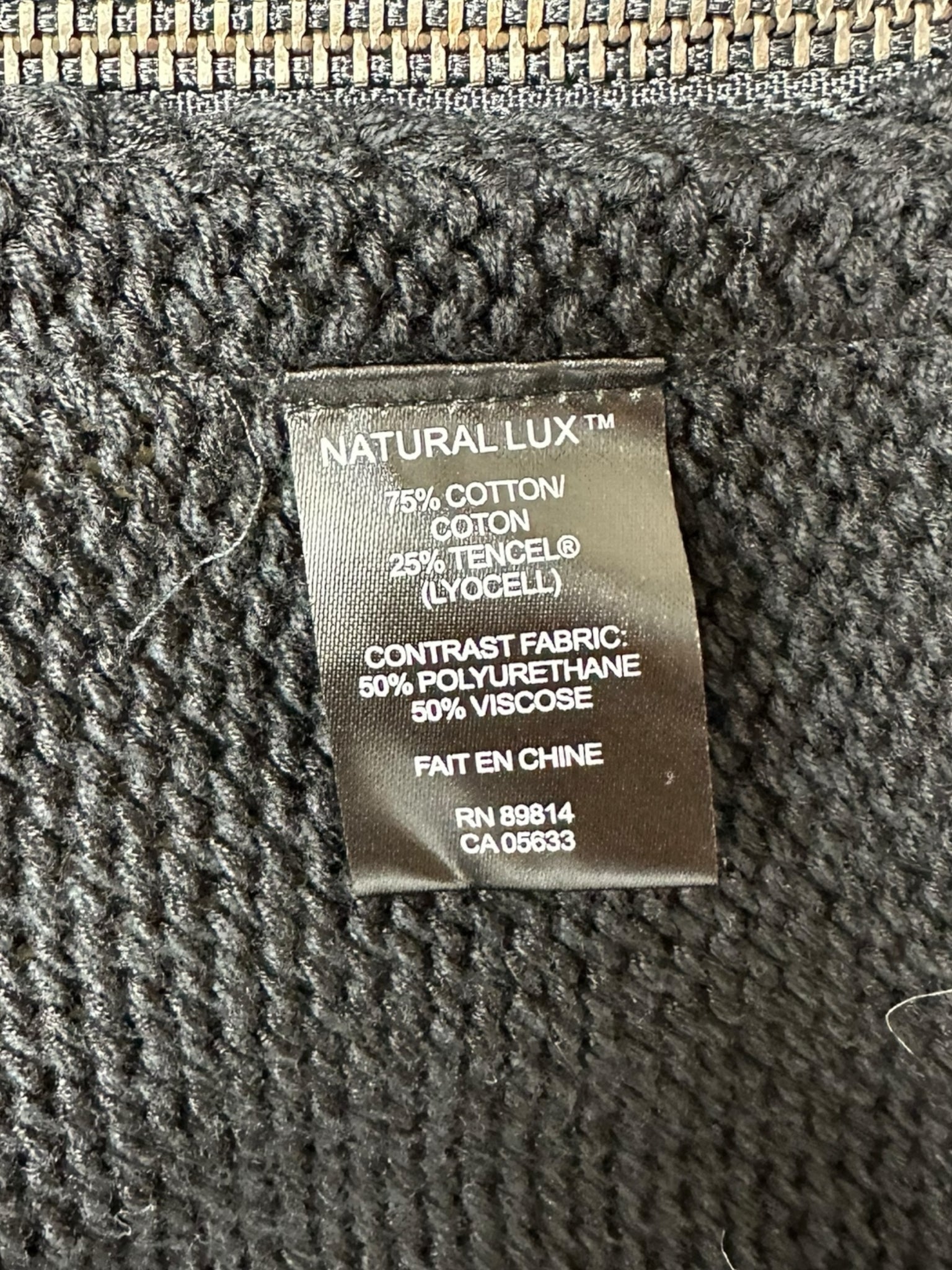 Black cotton blend sweater knit cardigan with long sleeves embellished with a vegan leather patch. Cardigan has an open front and bronze zipper detailing.