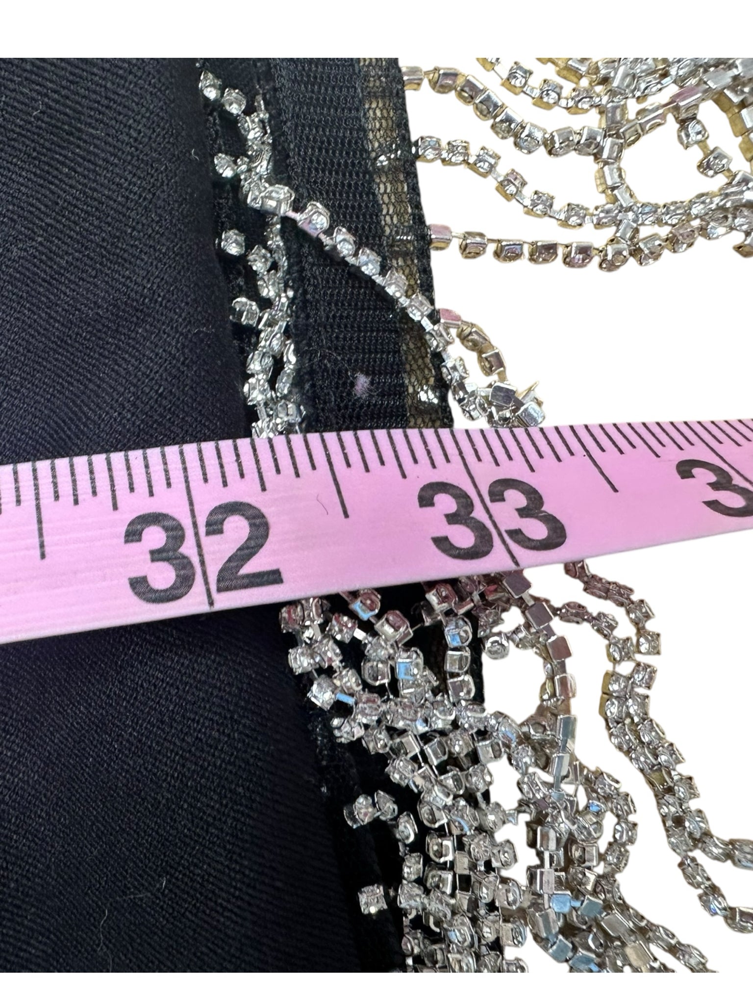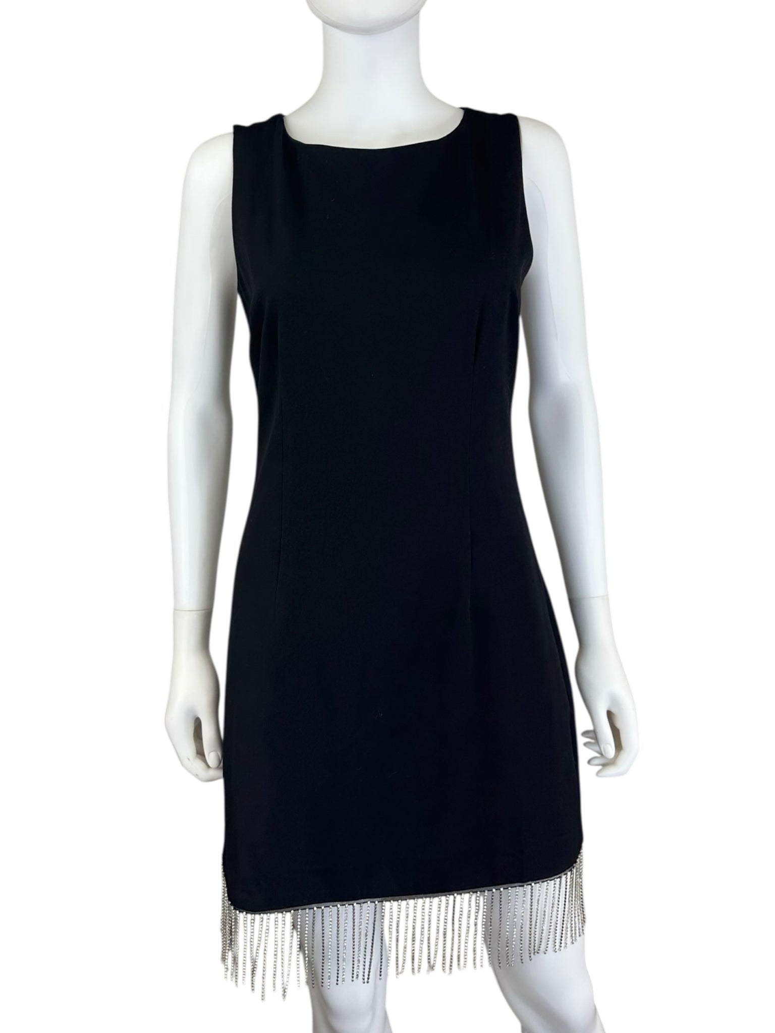 New from local boutique! Adorable sleeveless ELENORA black sheath dress with silver rhinestone hem trim. Dress is lined, features a back zipper closure and is made from a comfy stretch knit fabric.