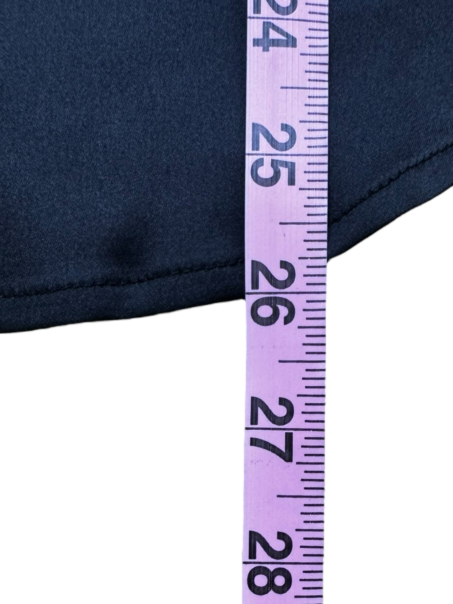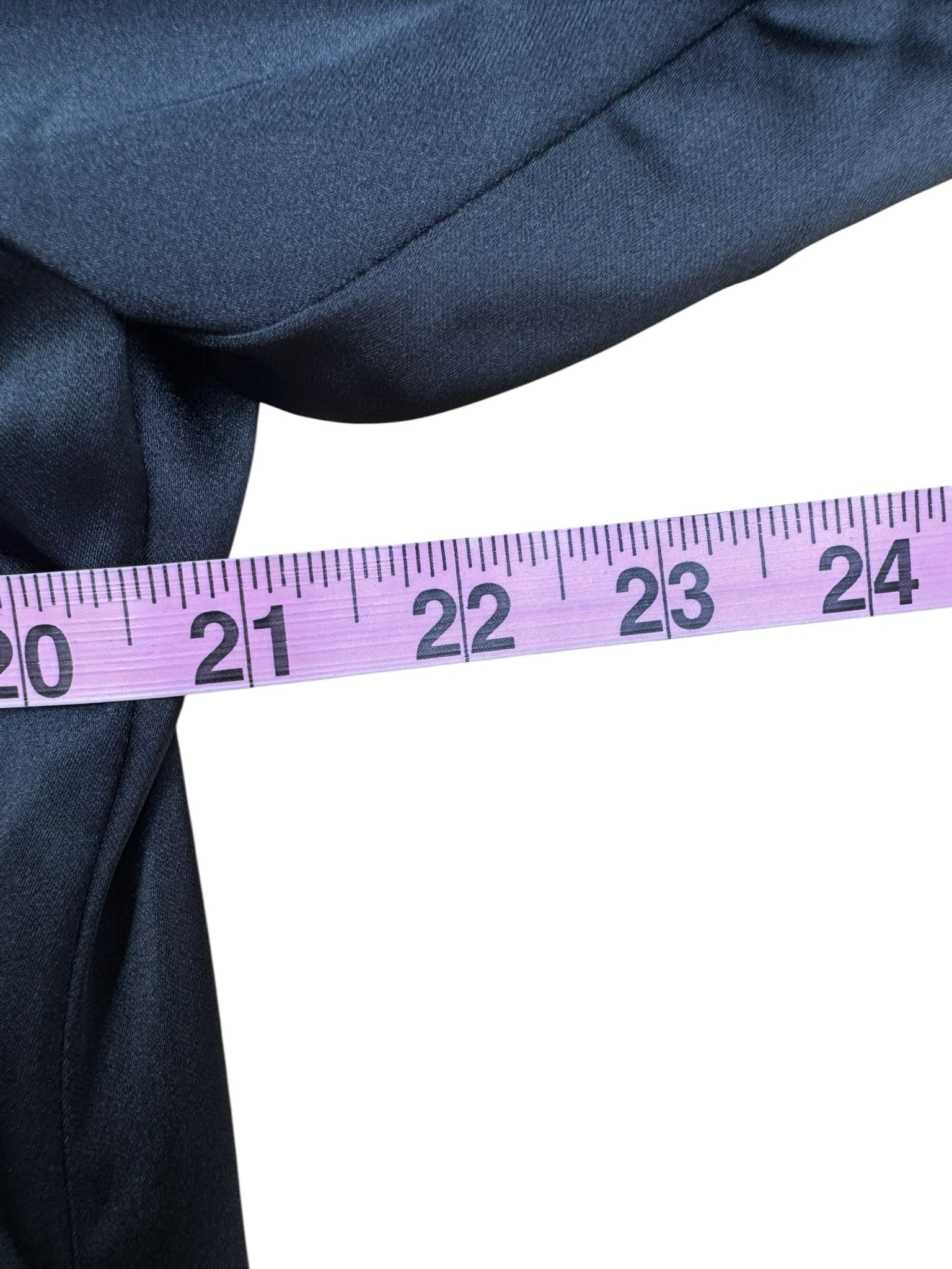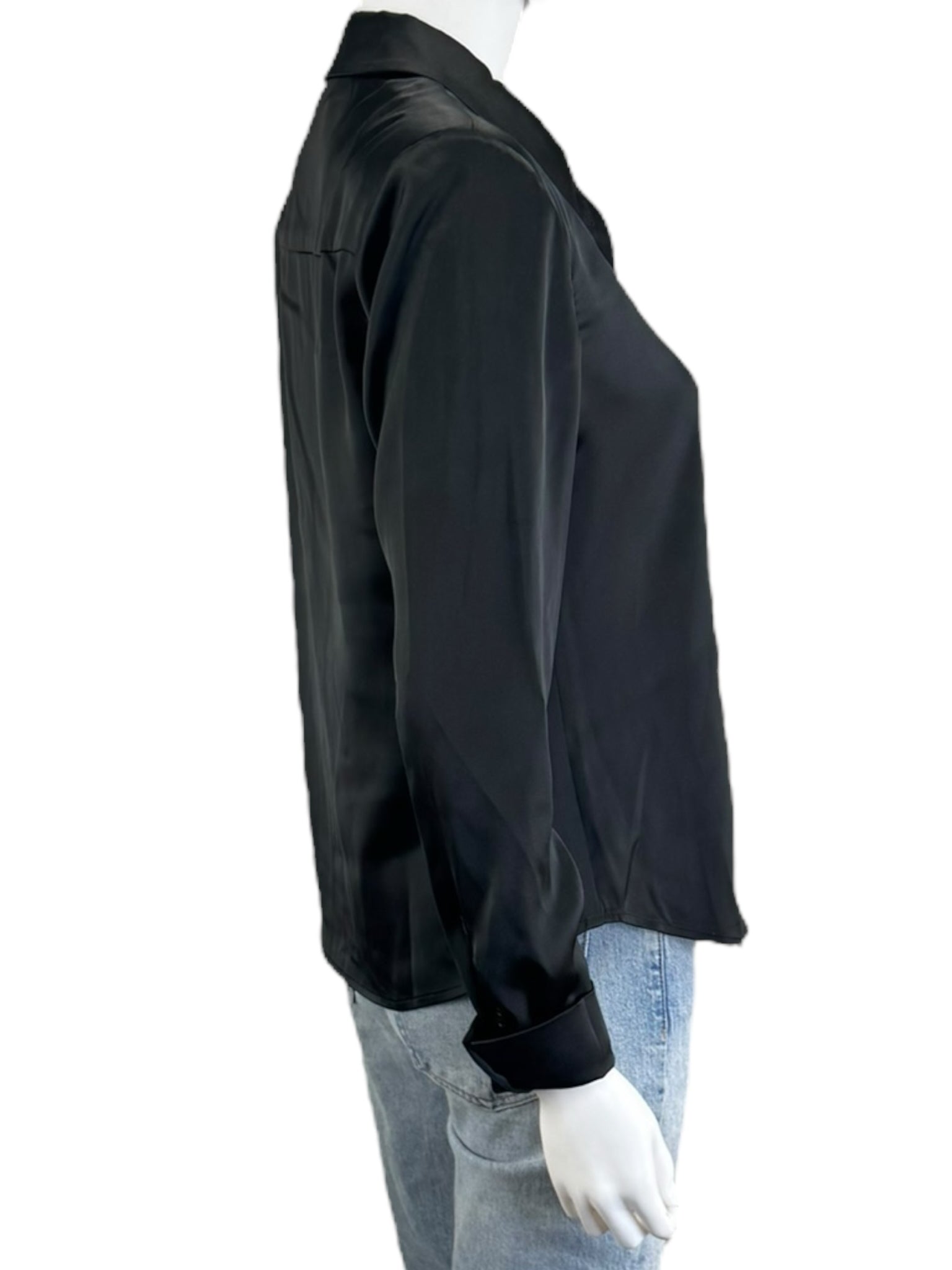 New from local boutique! Super silky black satin ASA style button-down top with collared neckline and long button cuff closure sleeves.