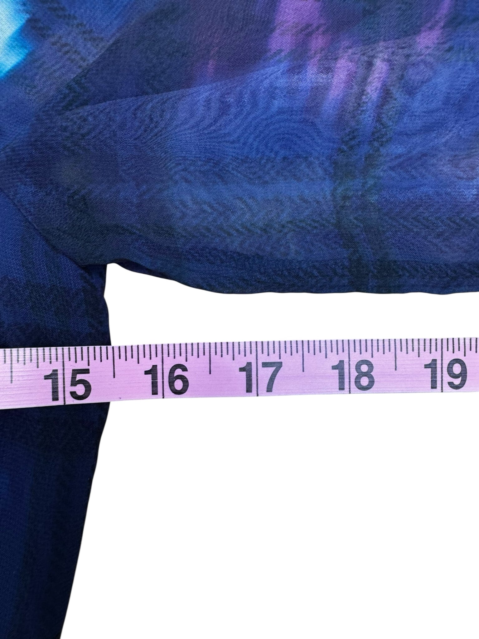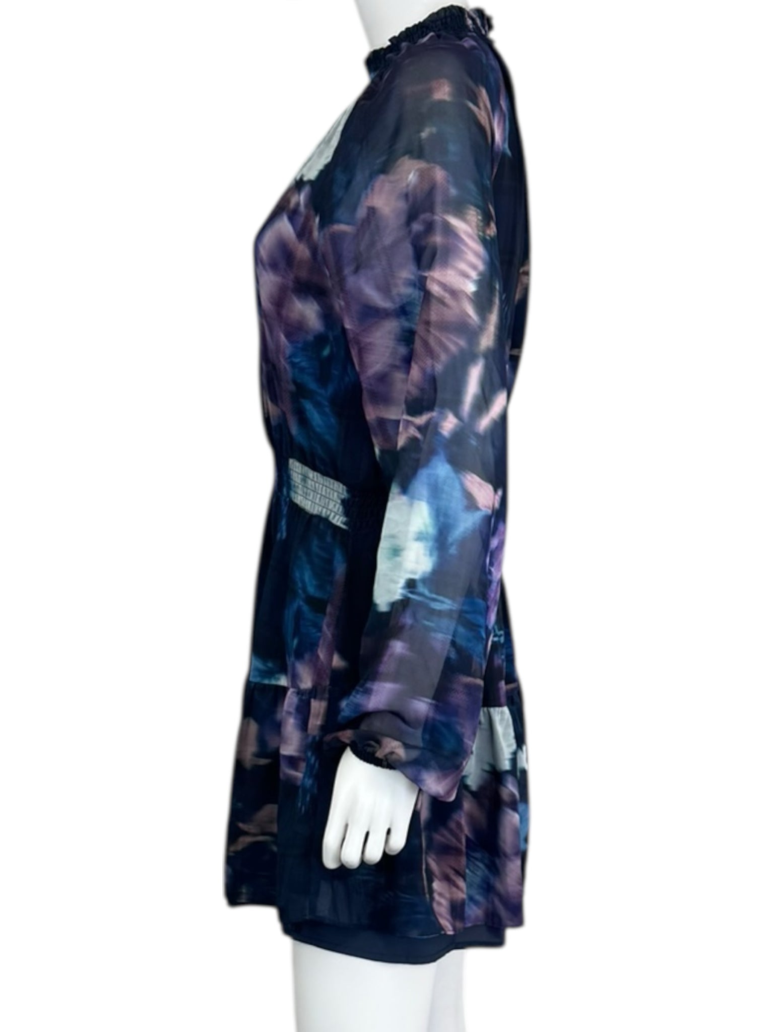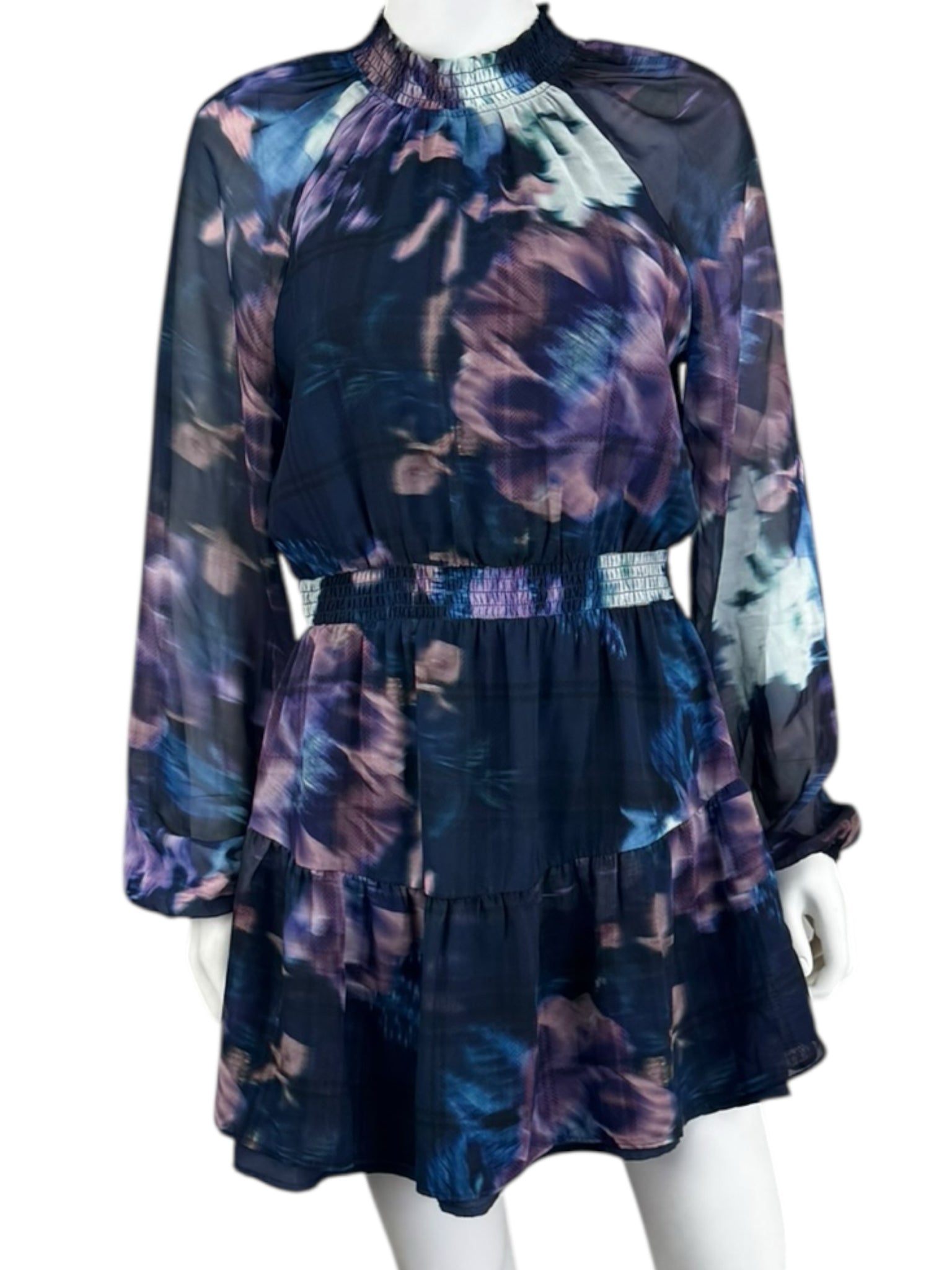 Lightweight purple & blue watercolor chiffon print Rylan minidress with smocked mock neck, long semi-sheer puffed sleeves, back keyhole opening with button closure, a smocked elastic waist and a tiered skirt.