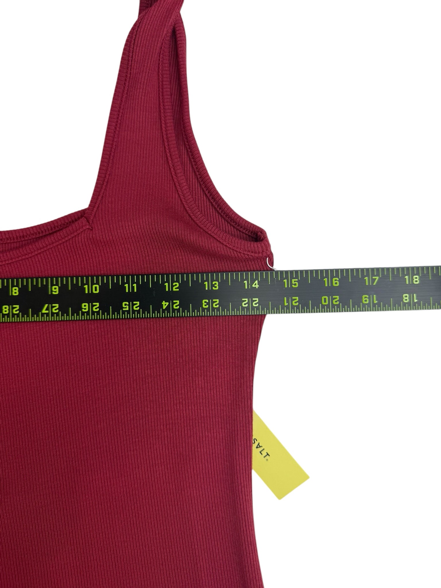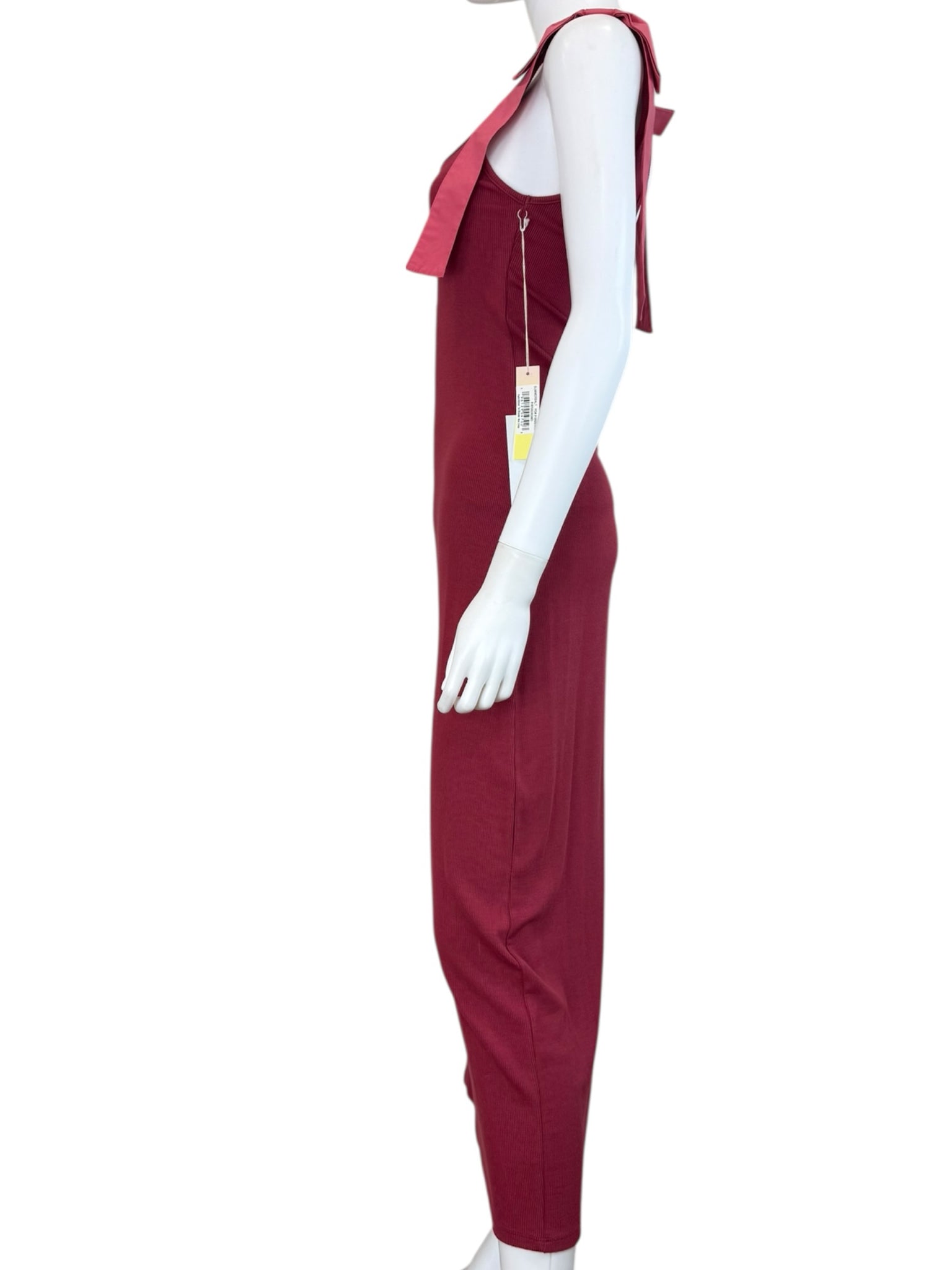 Dark rose ribbed knit sleeveless maxi with tie bow shoulder closure.