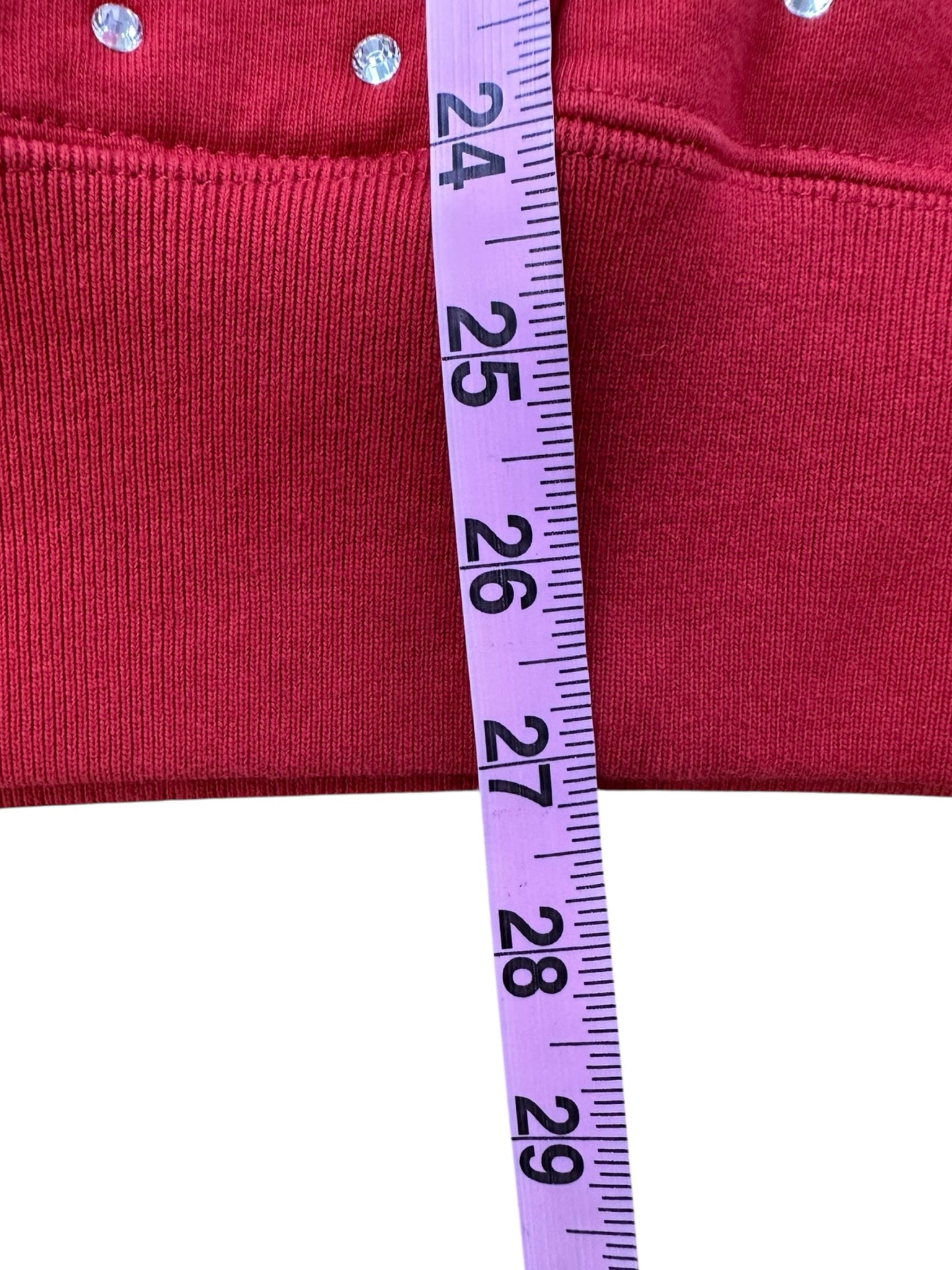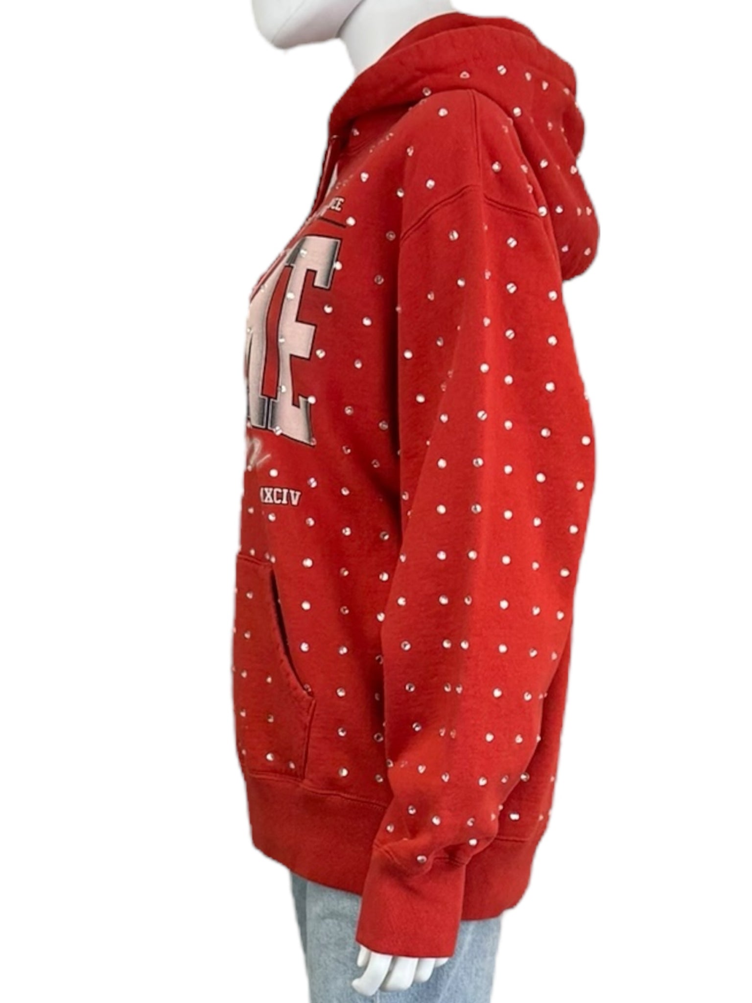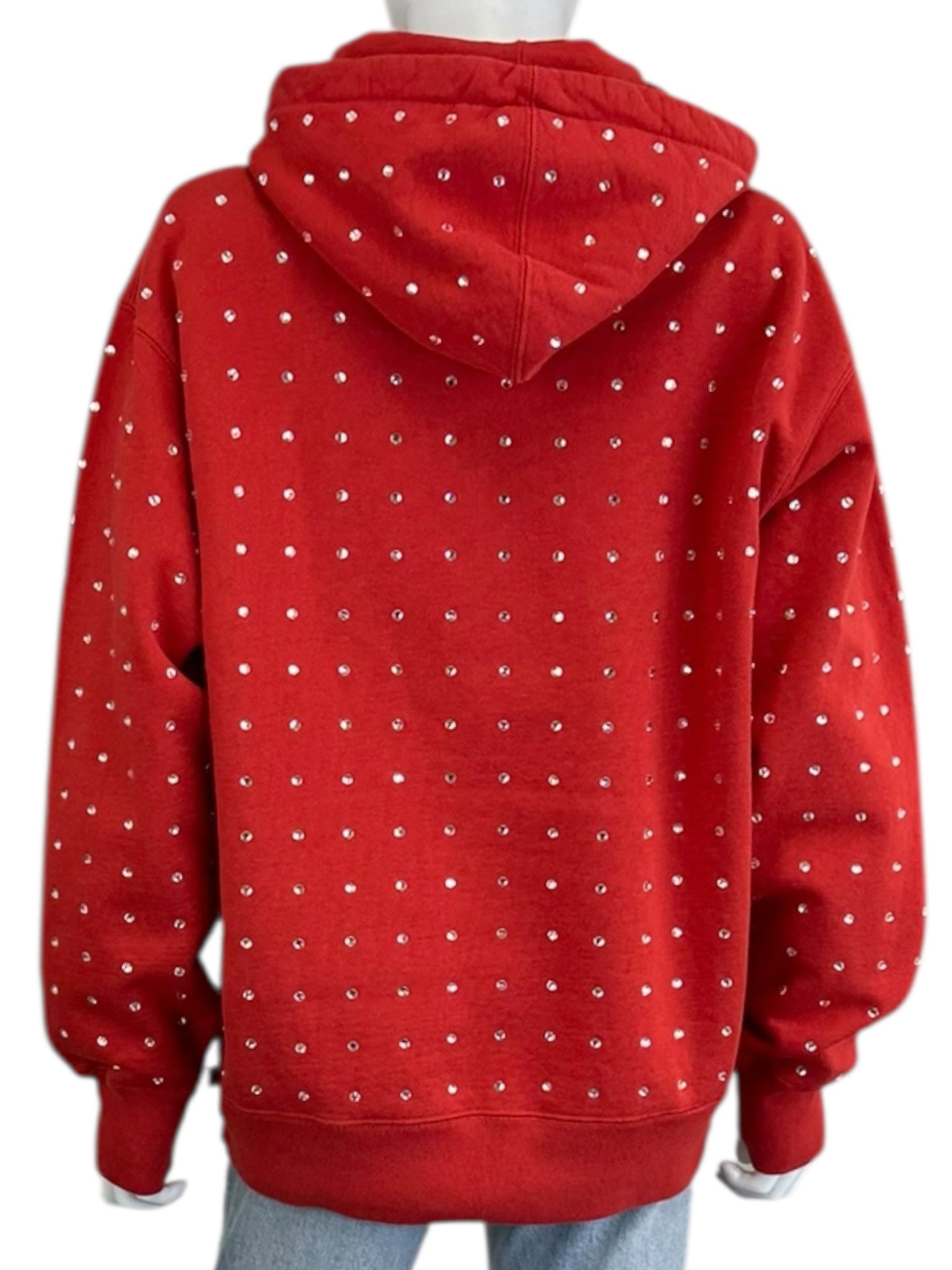 Red100% cotton rhinestone hoodie with long sleeves and a kangaroo pocket.