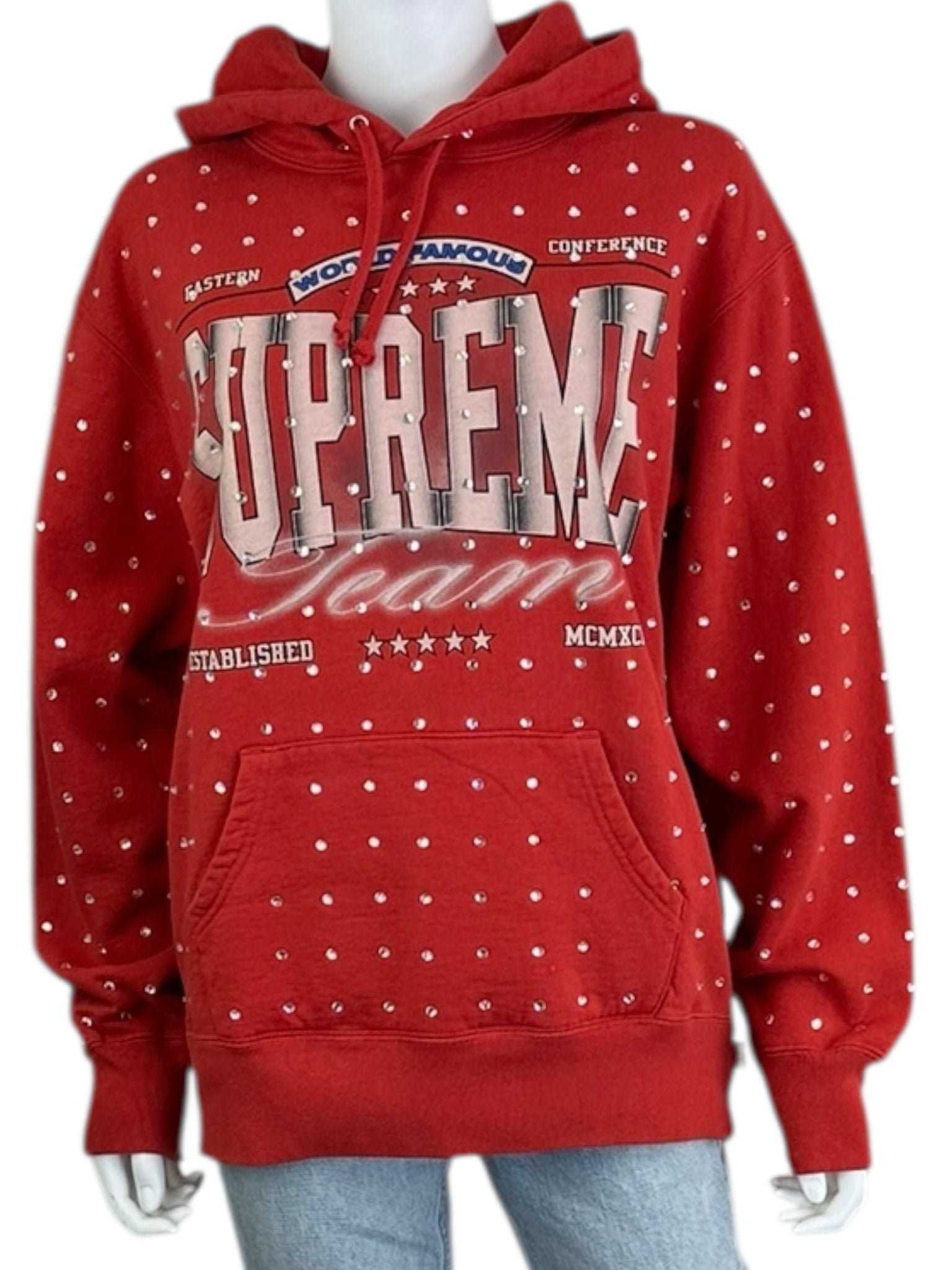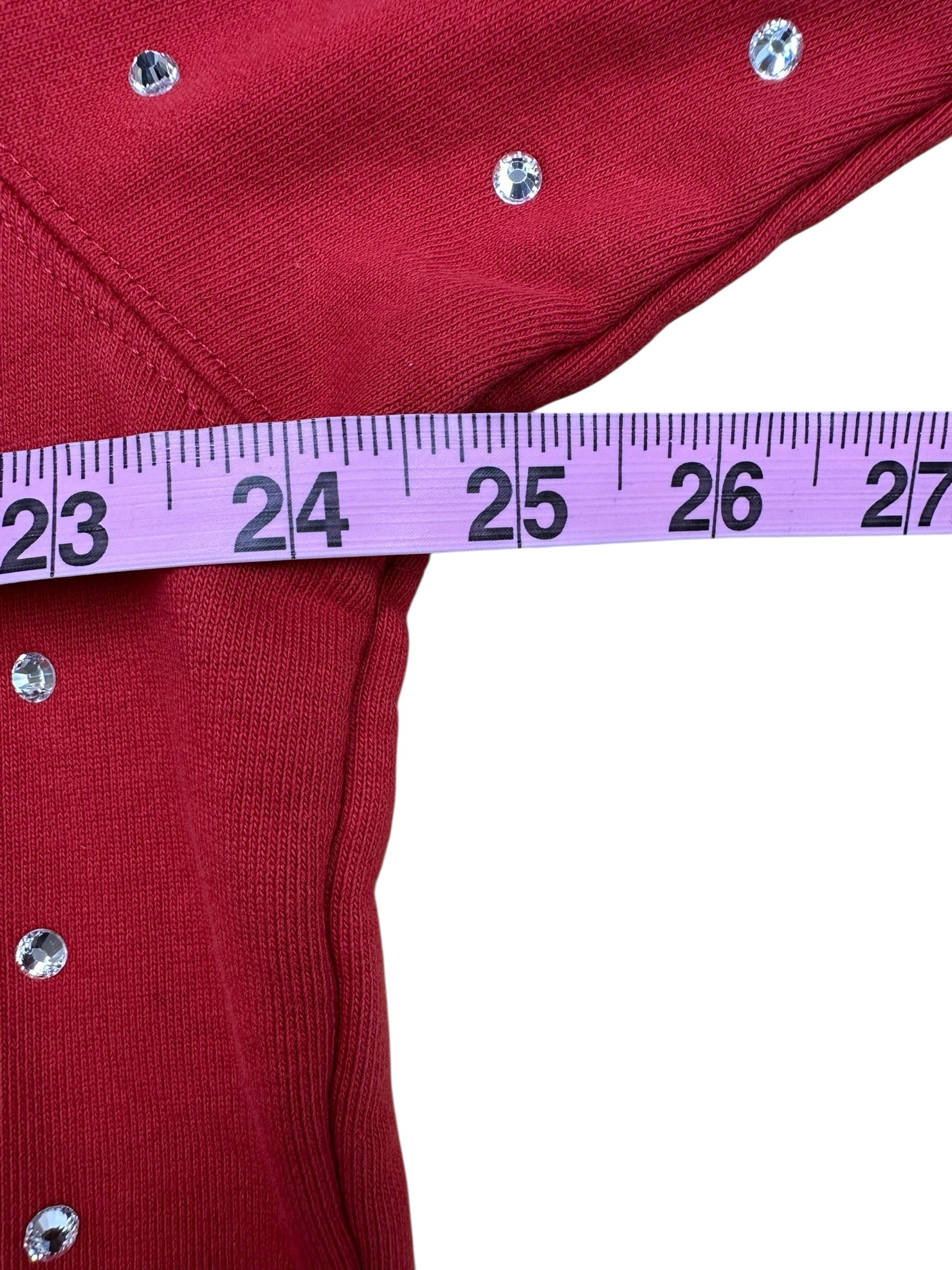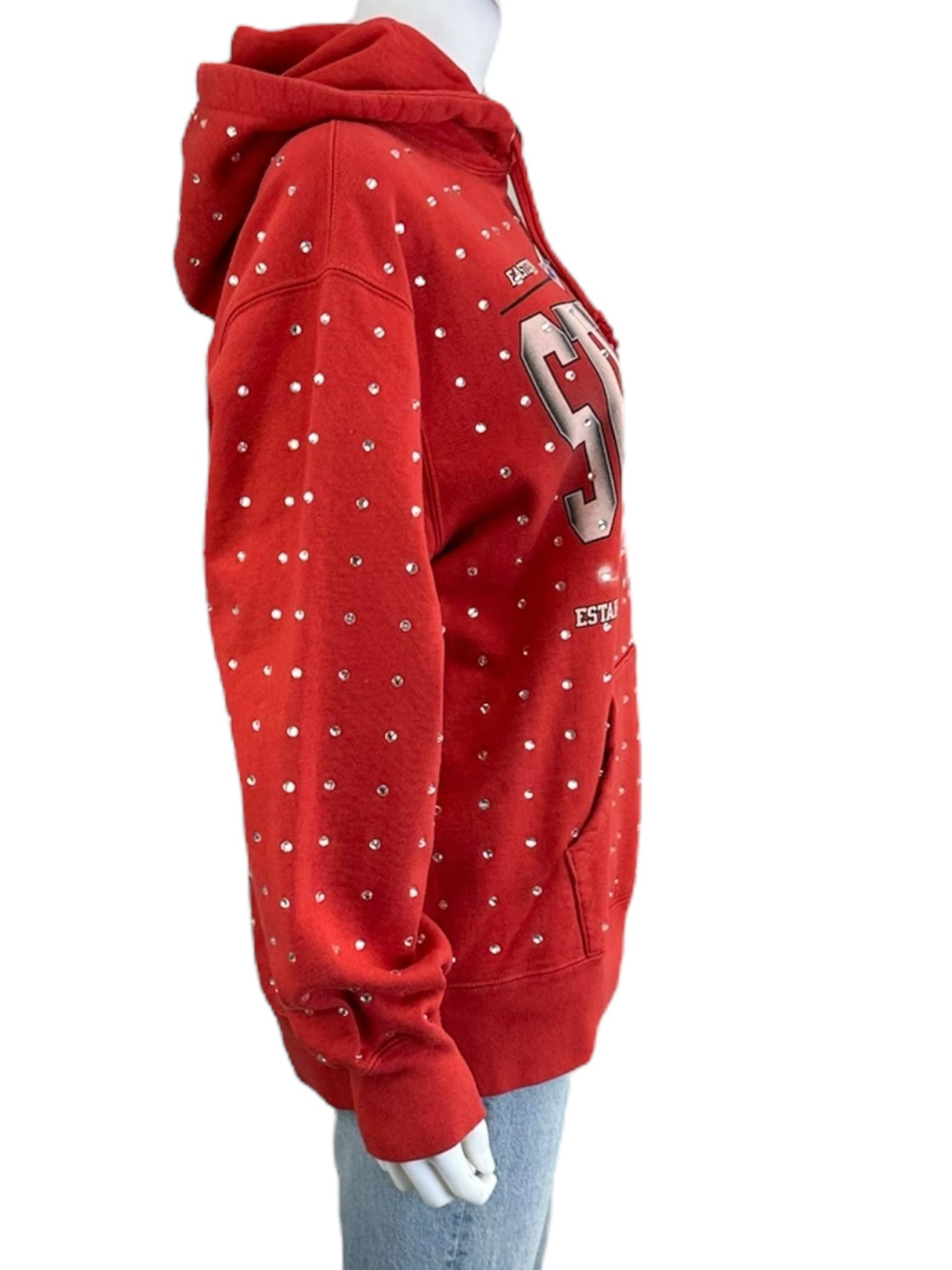 Red100% cotton rhinestone hoodie with long sleeves and a kangaroo pocket.
