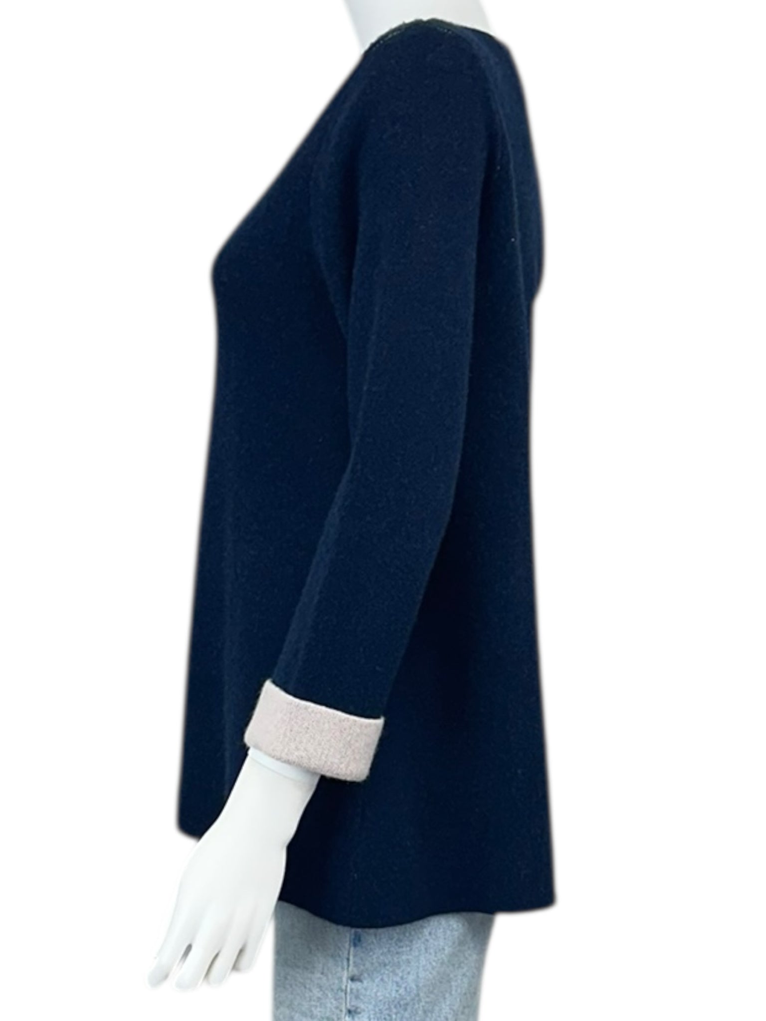 100% Pure Luxe CASHMERE navy blue wide neck pullover sweater with long sleeves and accent trim at cuffs. Sweater has a back zipper closure.