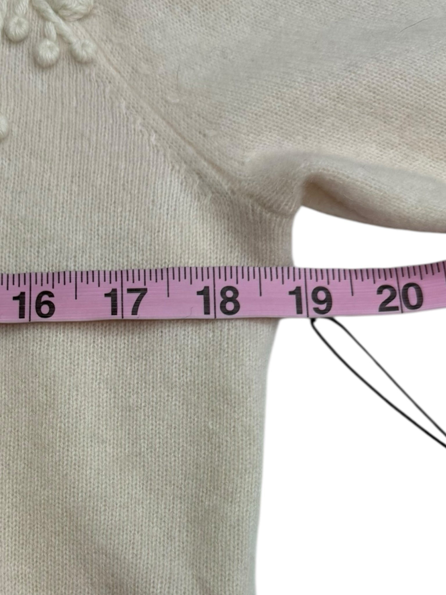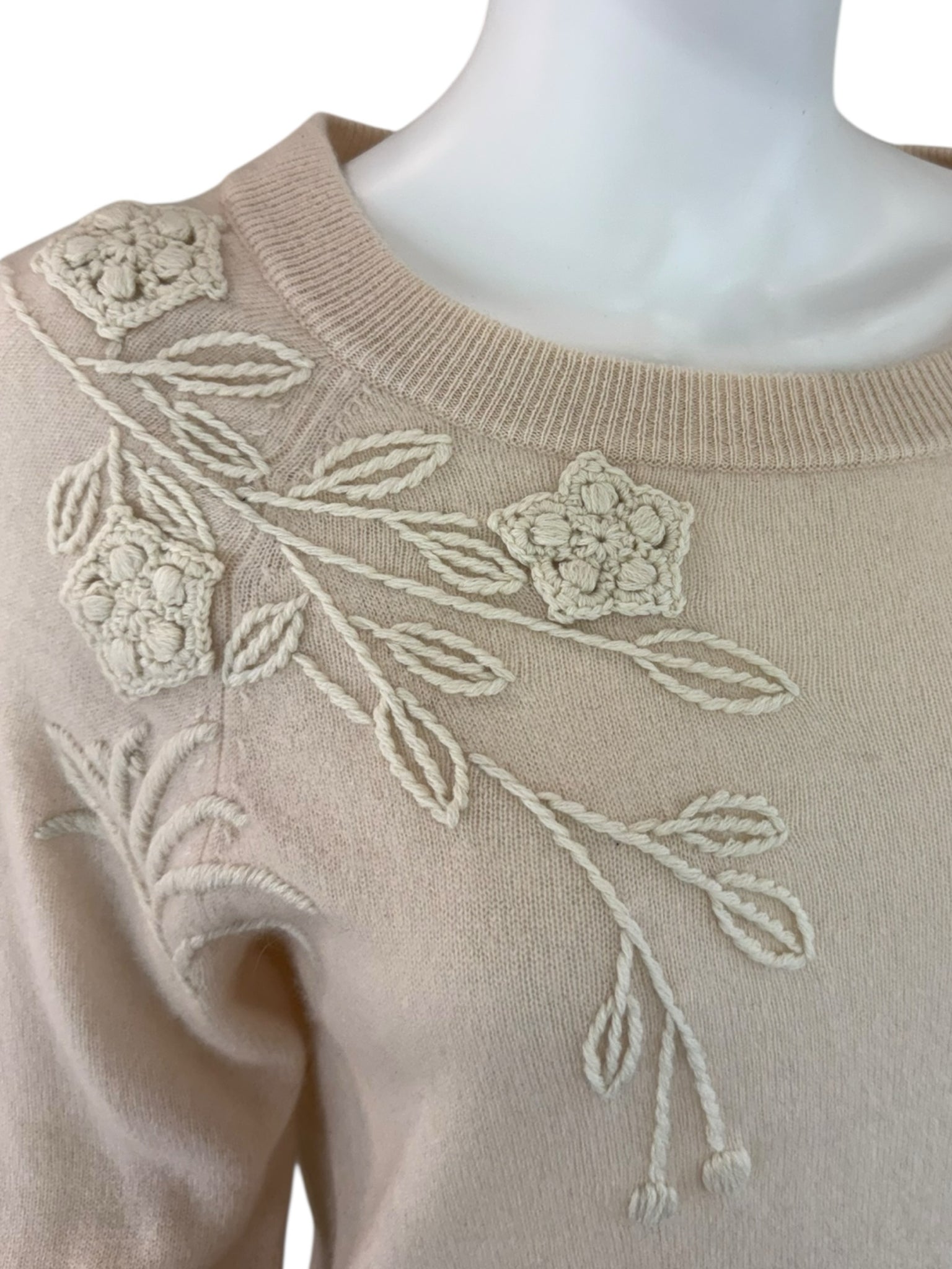 New With Tags! Ivory 100% cashmere pullover long sleeved sweater with embroidered floral design.