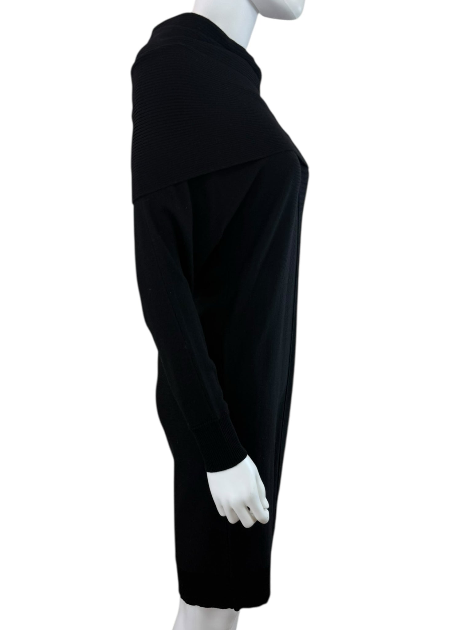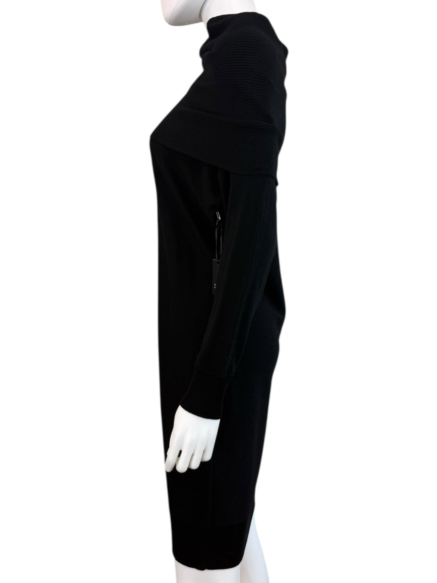 New with tags! Black stretch knit sweater dress with long sleeves and an off the shoulder neckline.