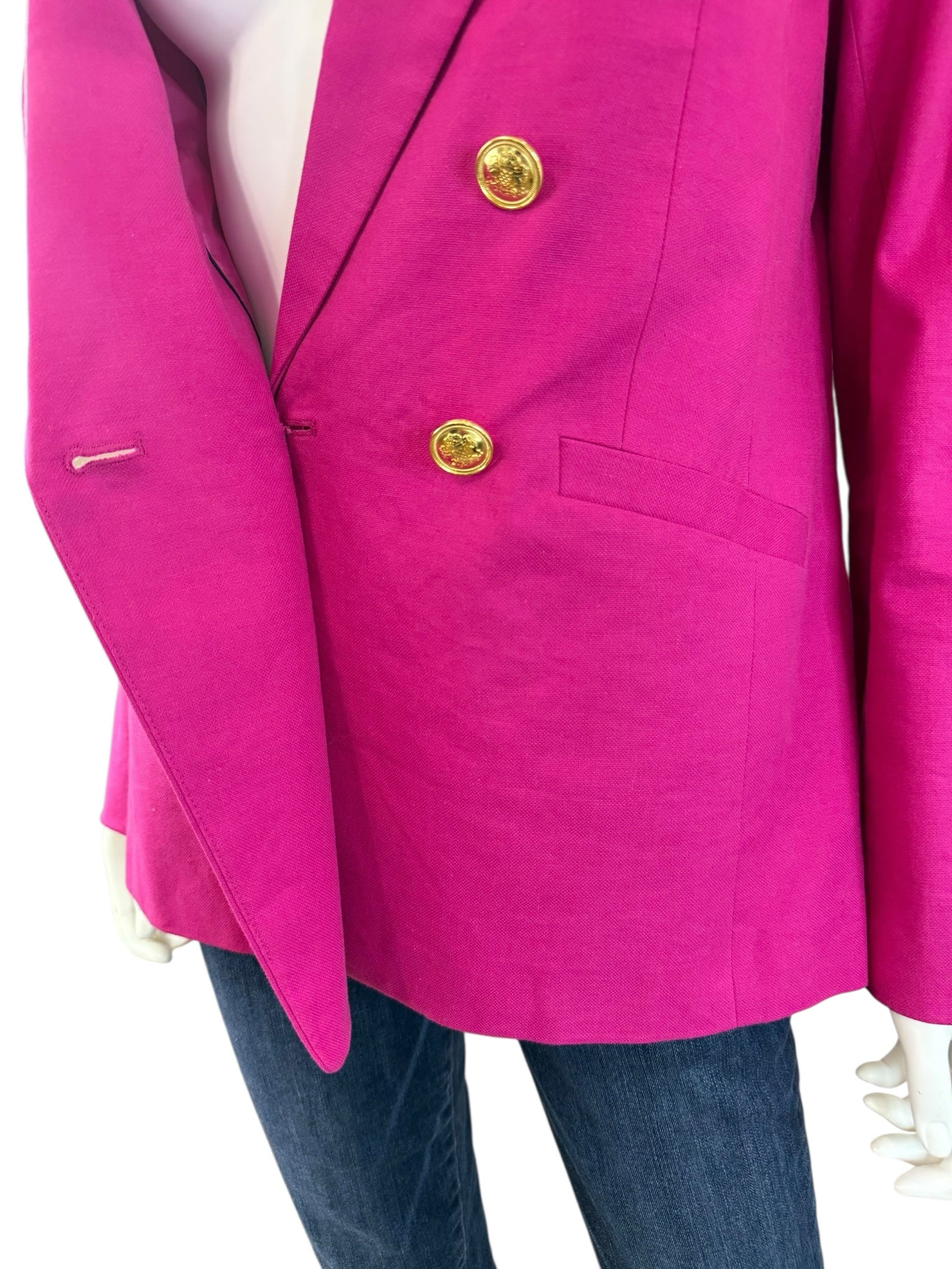 Fuchsia linen and cotton blend blazer with long sleeves, front pockets and a gold button double breasted closure.