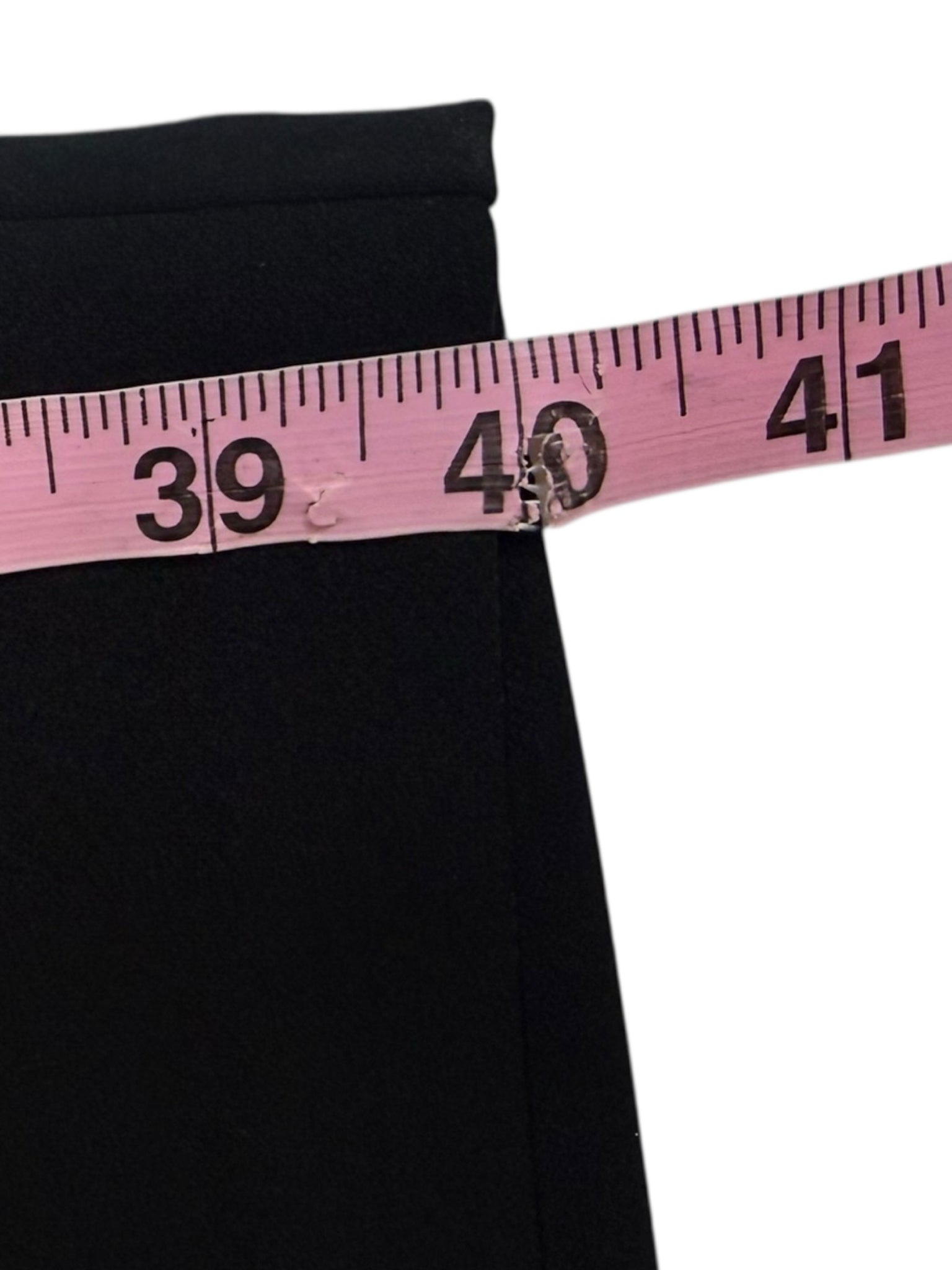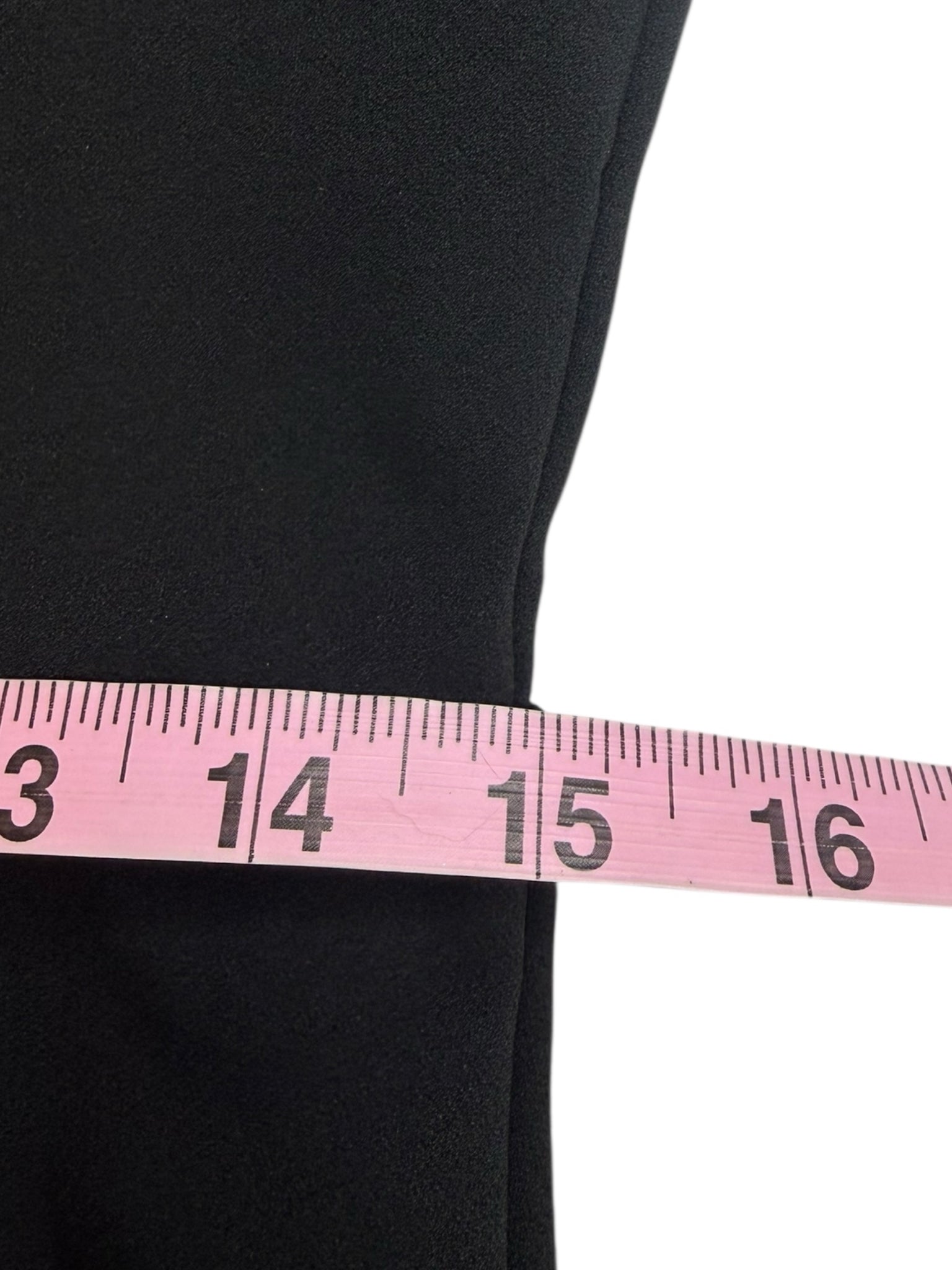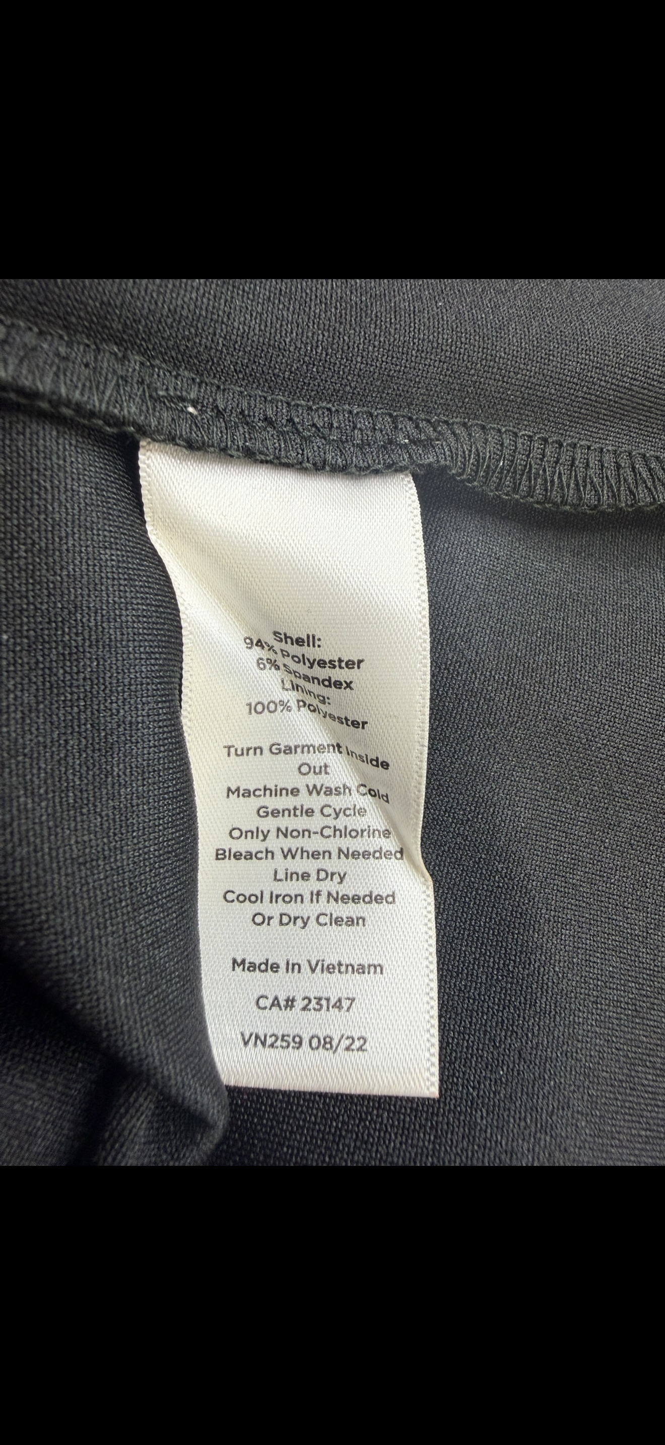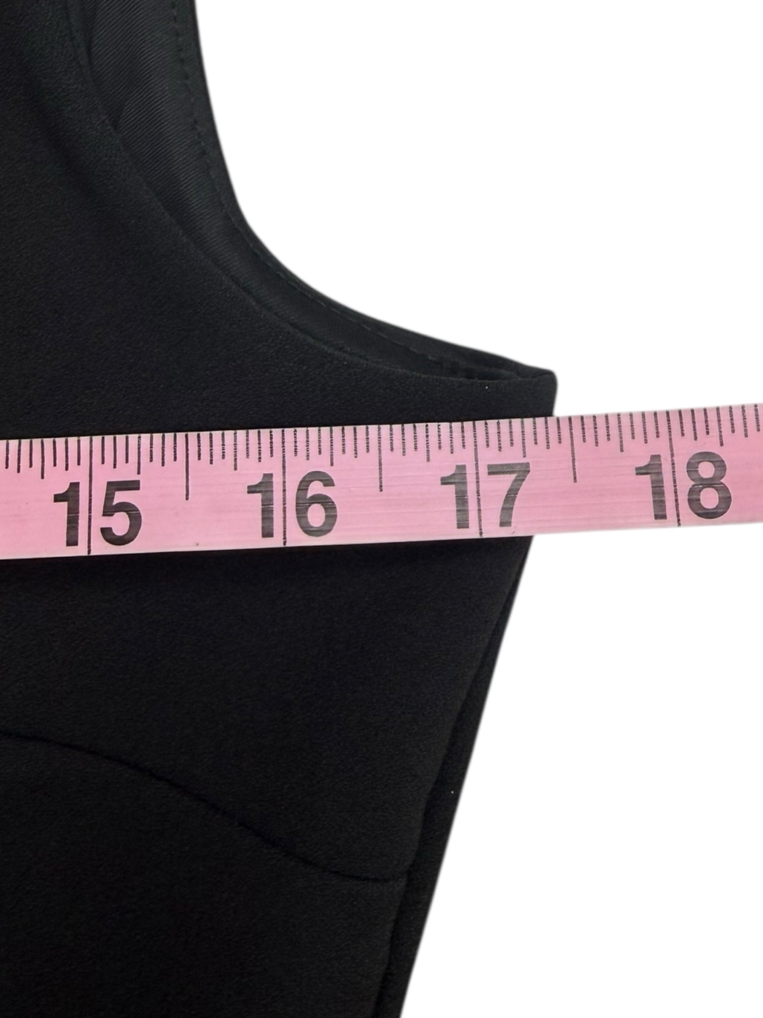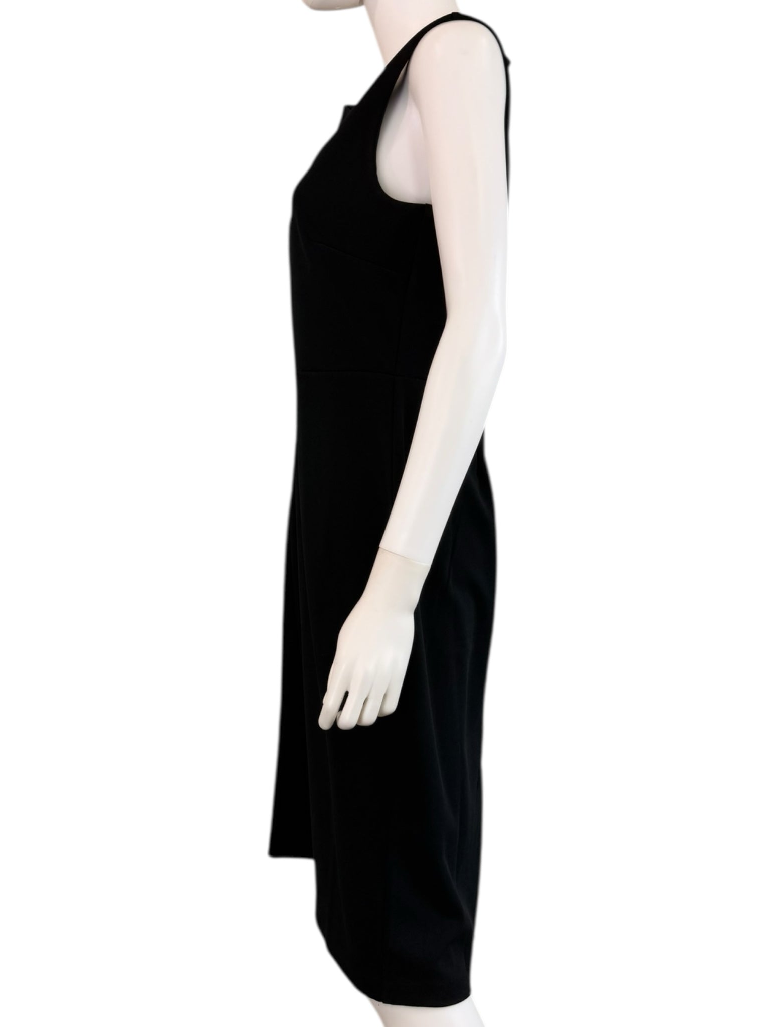 Black stretch knit knee length sleeveless cocktail dress with an asymmetrical hemline and a back zipper & hook closure. Dress is lined.