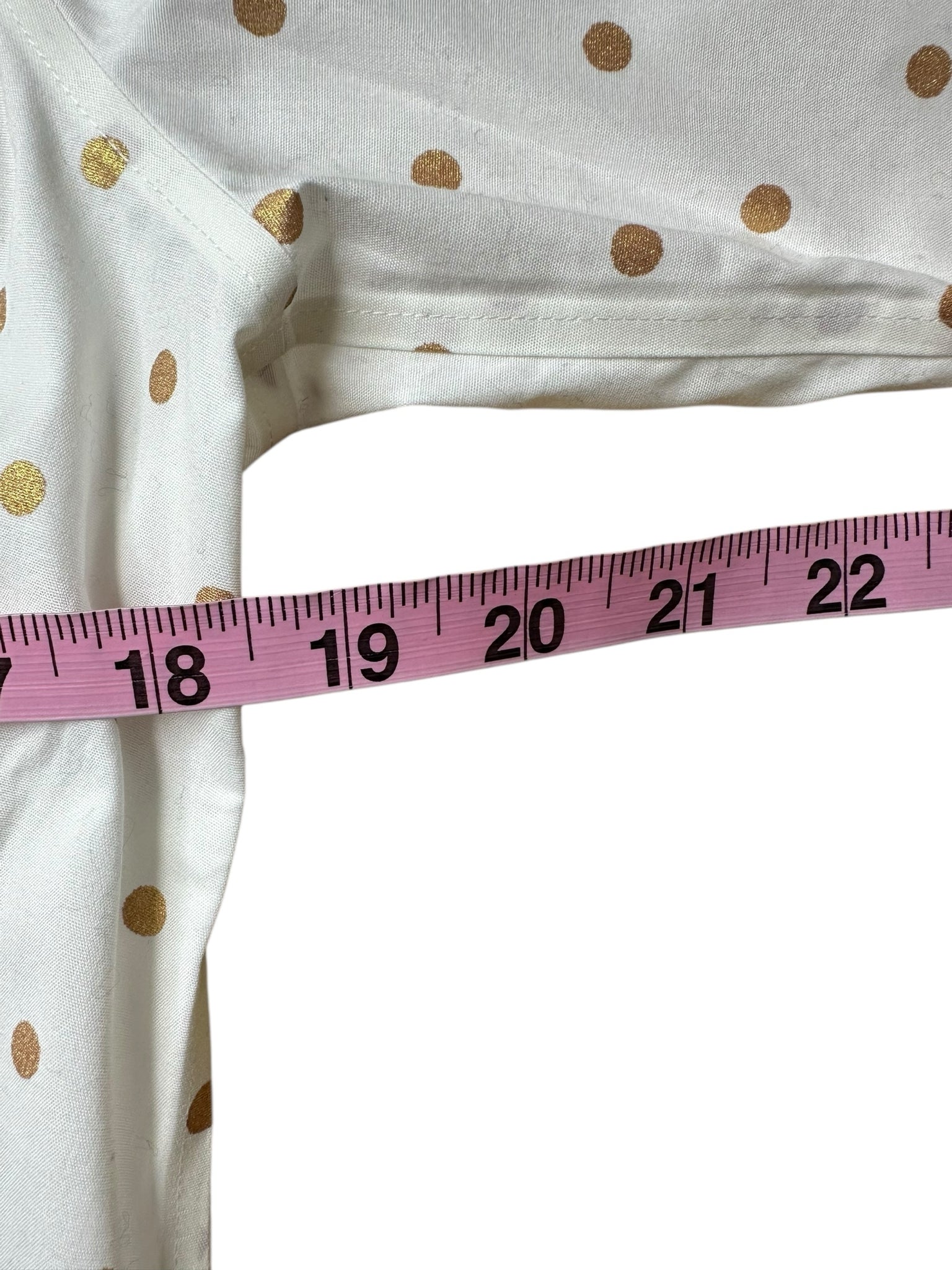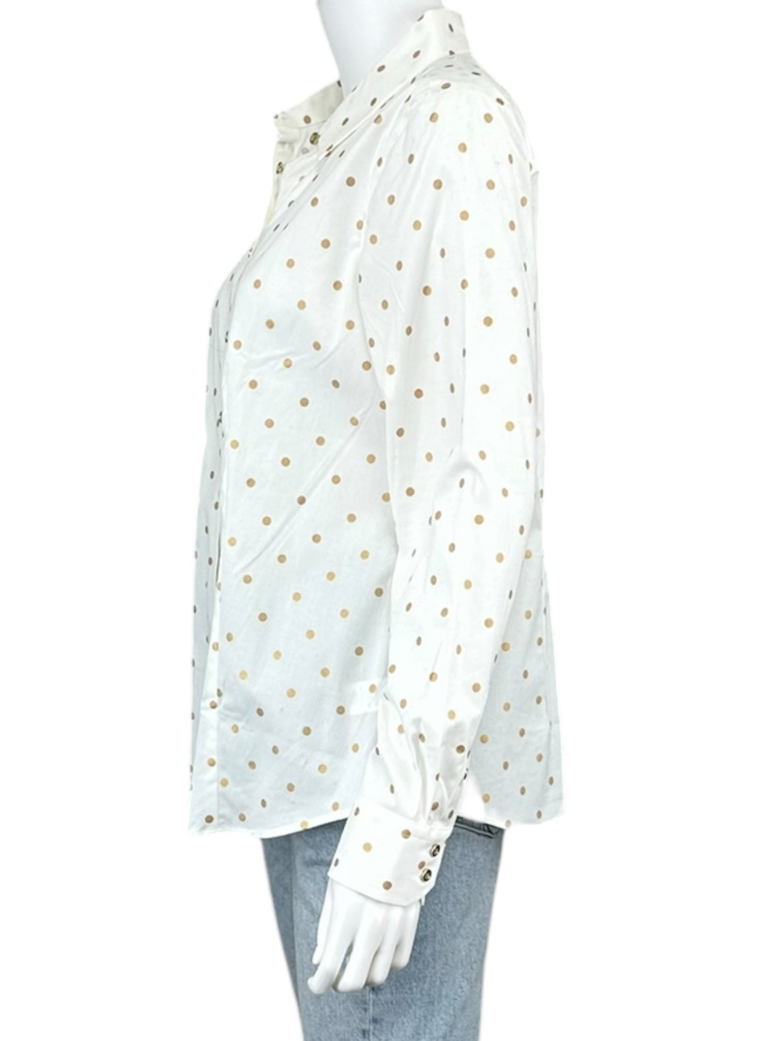 New with tags! White with metallic gold polka dot pattern collared long sleeve button-down shirt. Shirt is made from a cotton blend fabric.