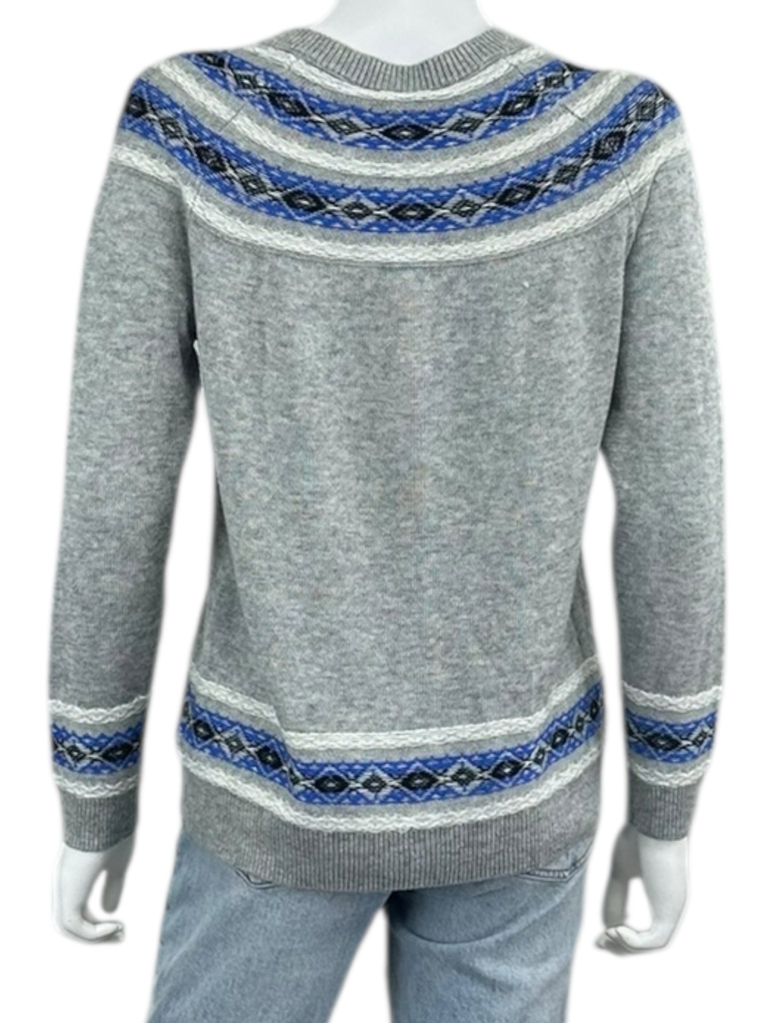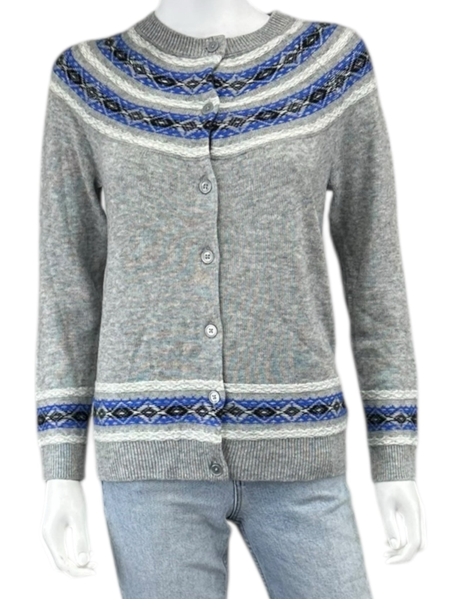 New with tags! Light gray fair isle lambswool blend sweater cardigan with long sleeves and a front button closure.