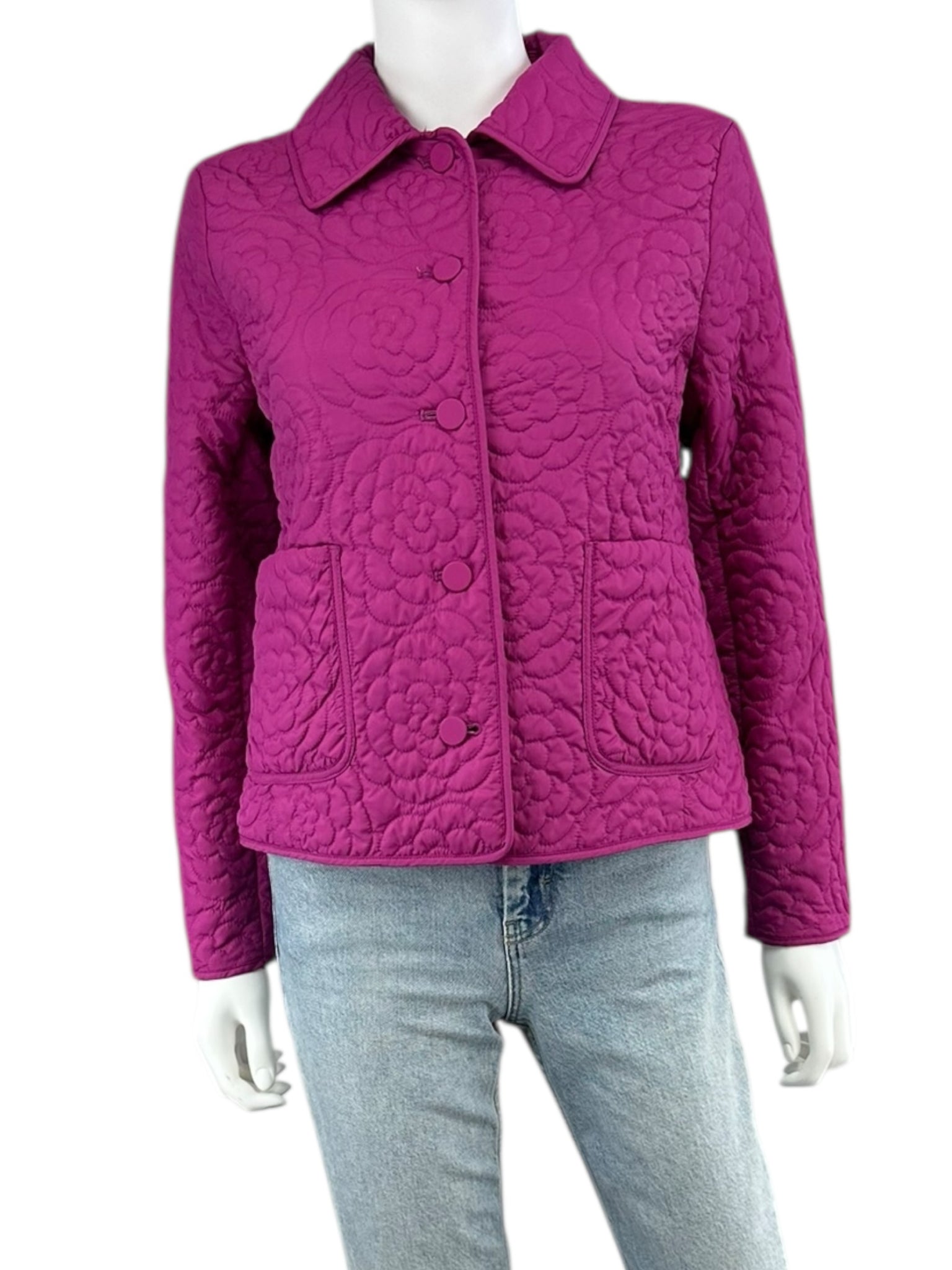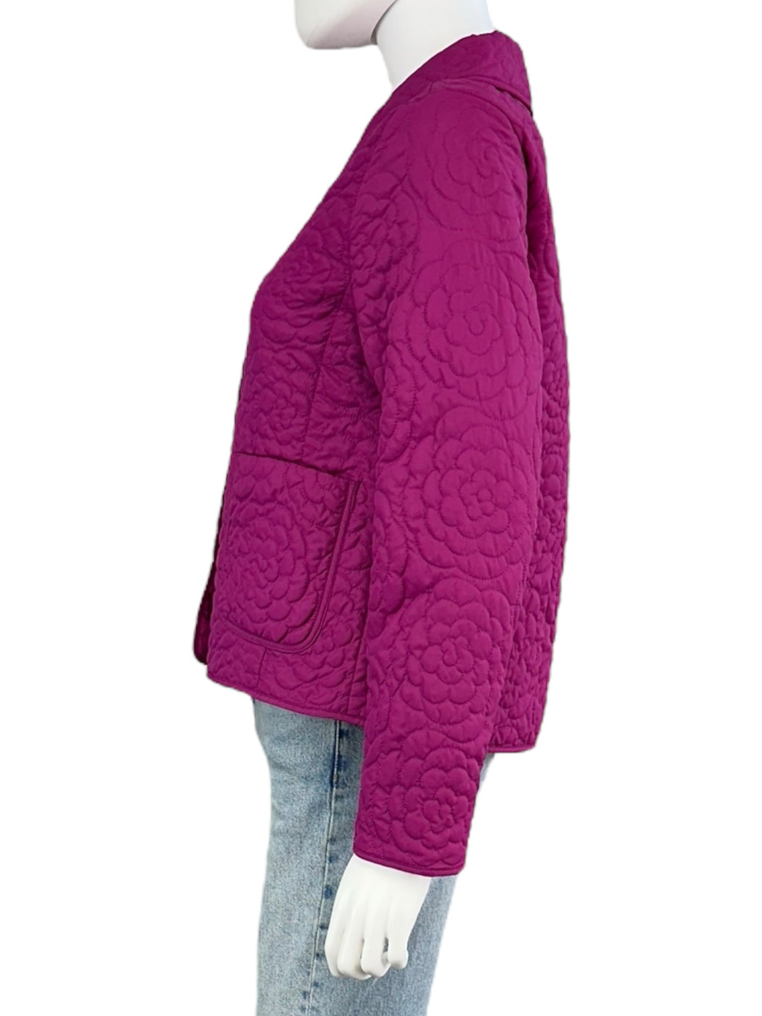 Magenta floral quilted collared puffer jacket with long sleeves, two front pockets and a front button closure.