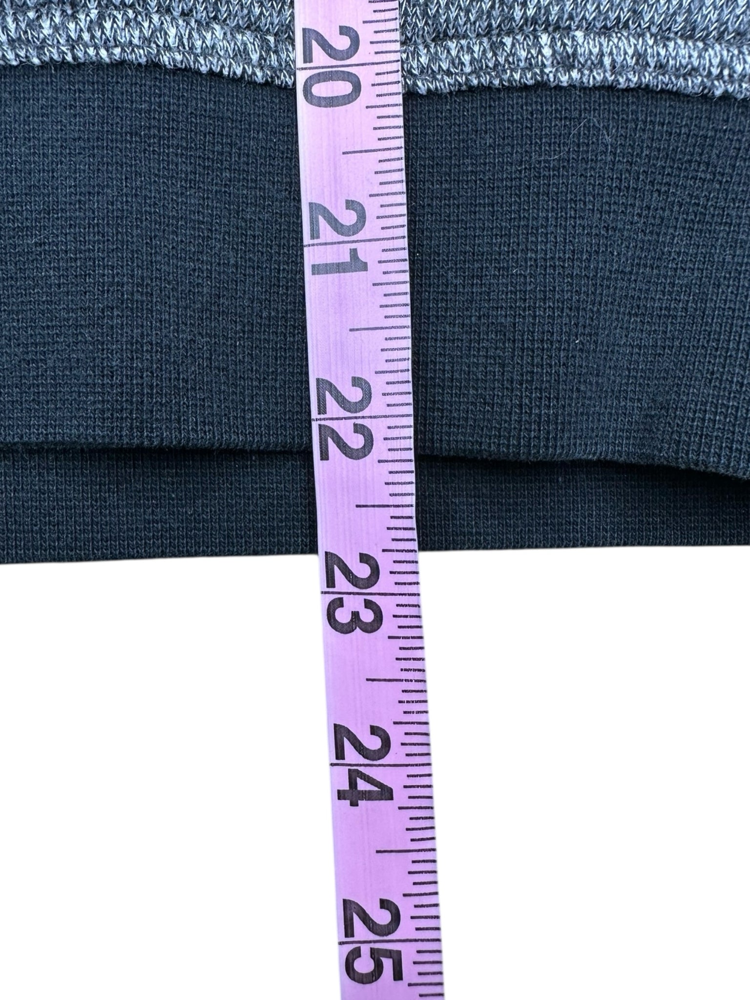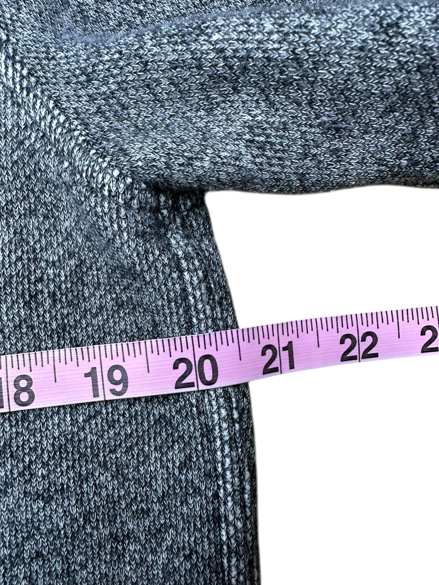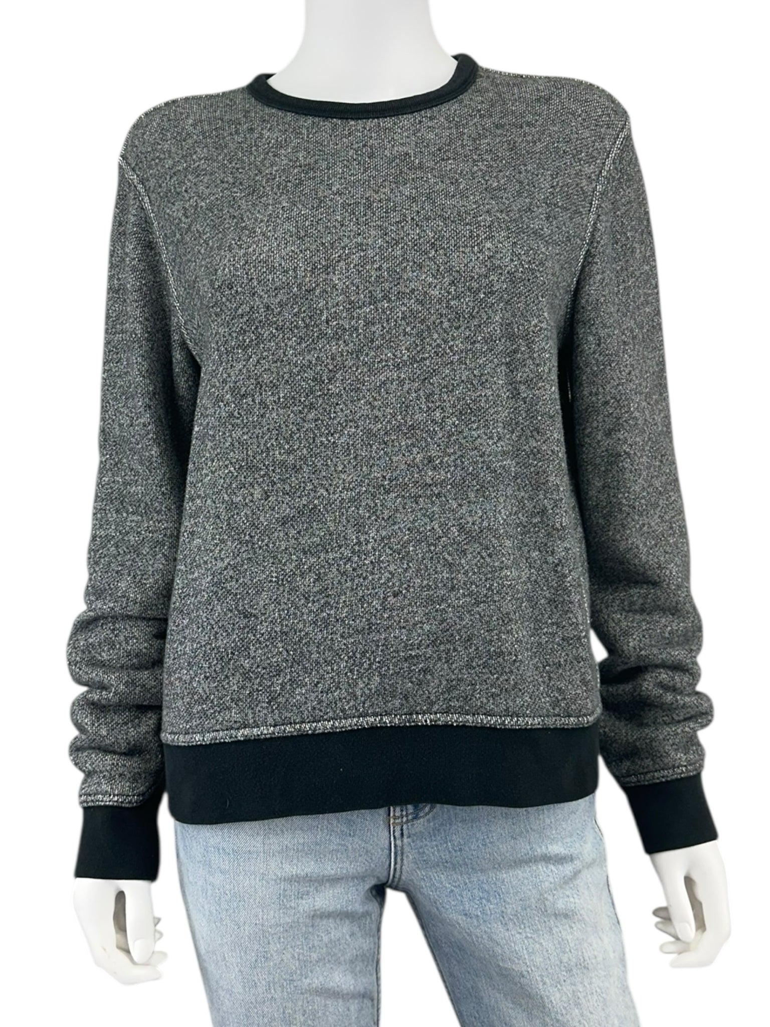 Gray sweater knit crewneck sweat shirt with long sleeves and black ribbed cuffs and hemline.