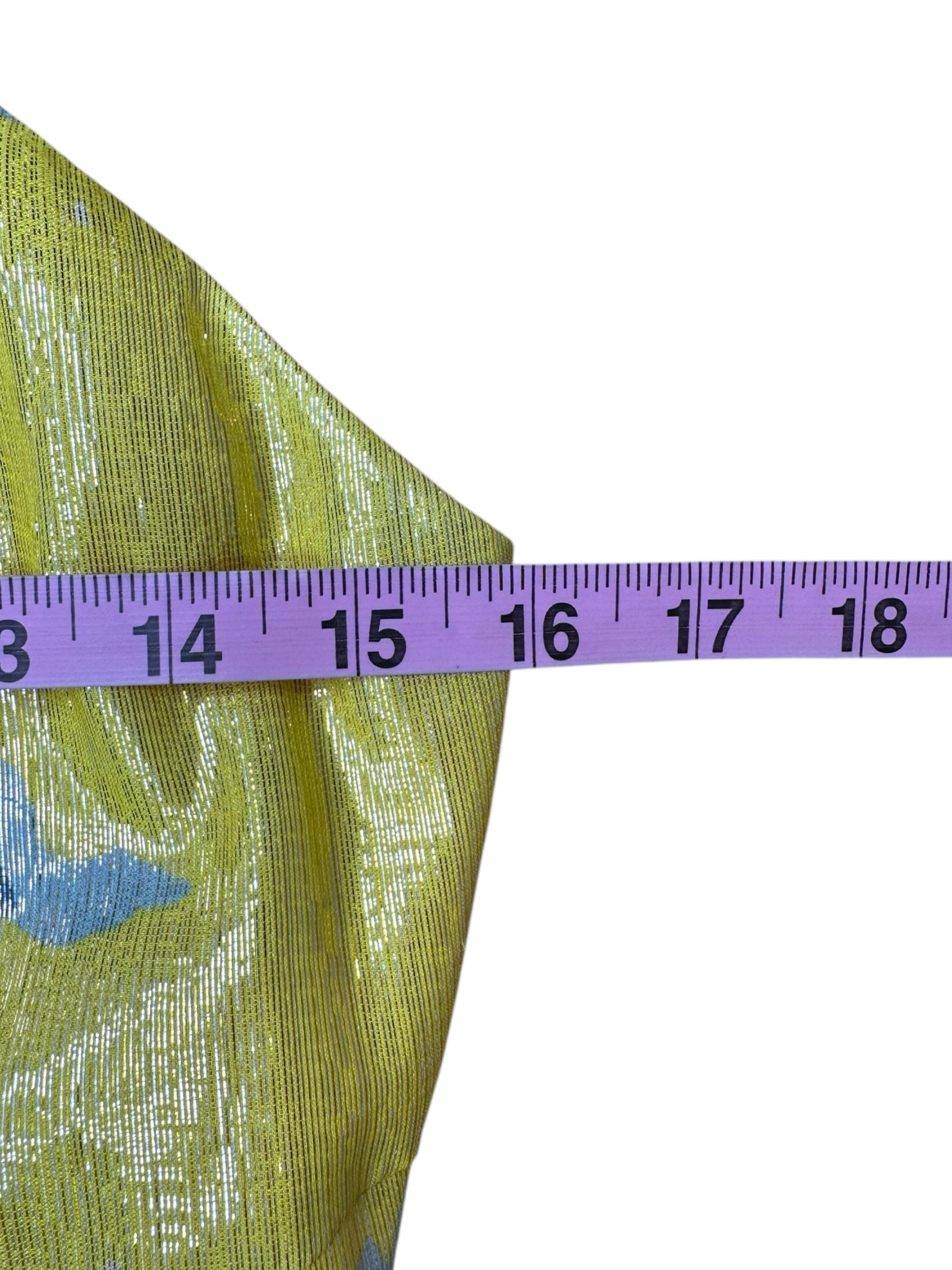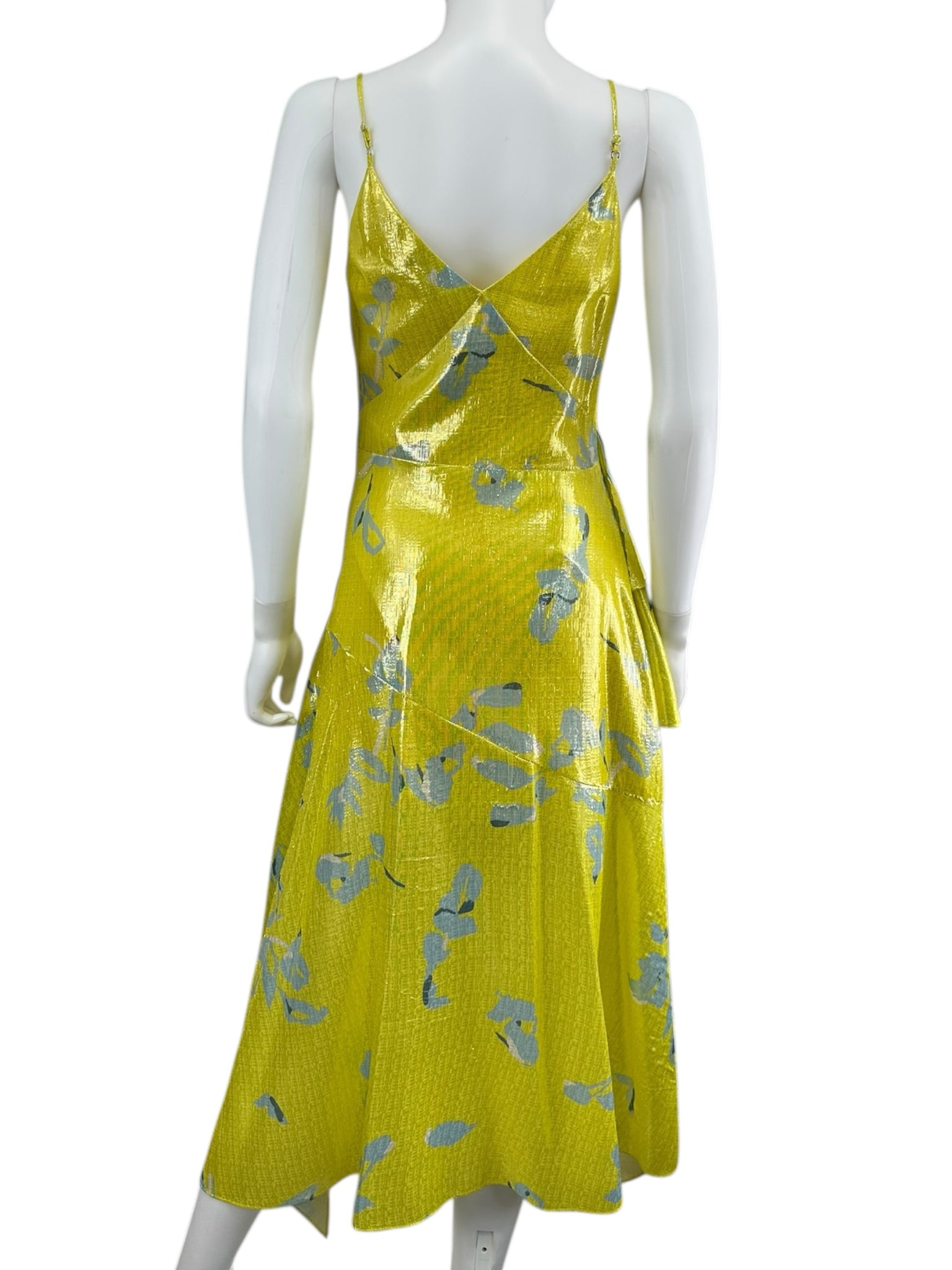 Lightweight yellow floral print A-line cocktail dress with adjustable spaghetti straps and side zipper closure.