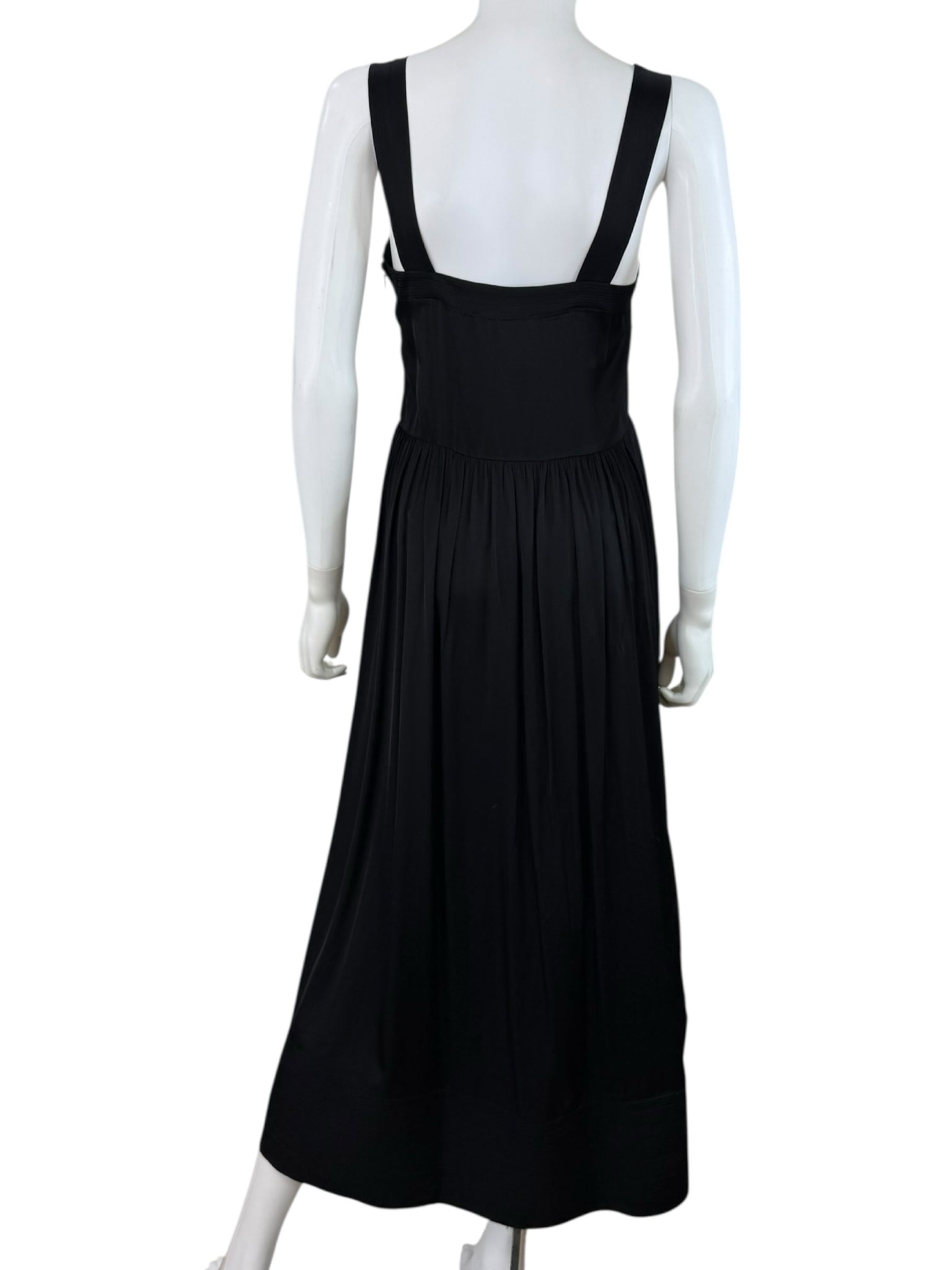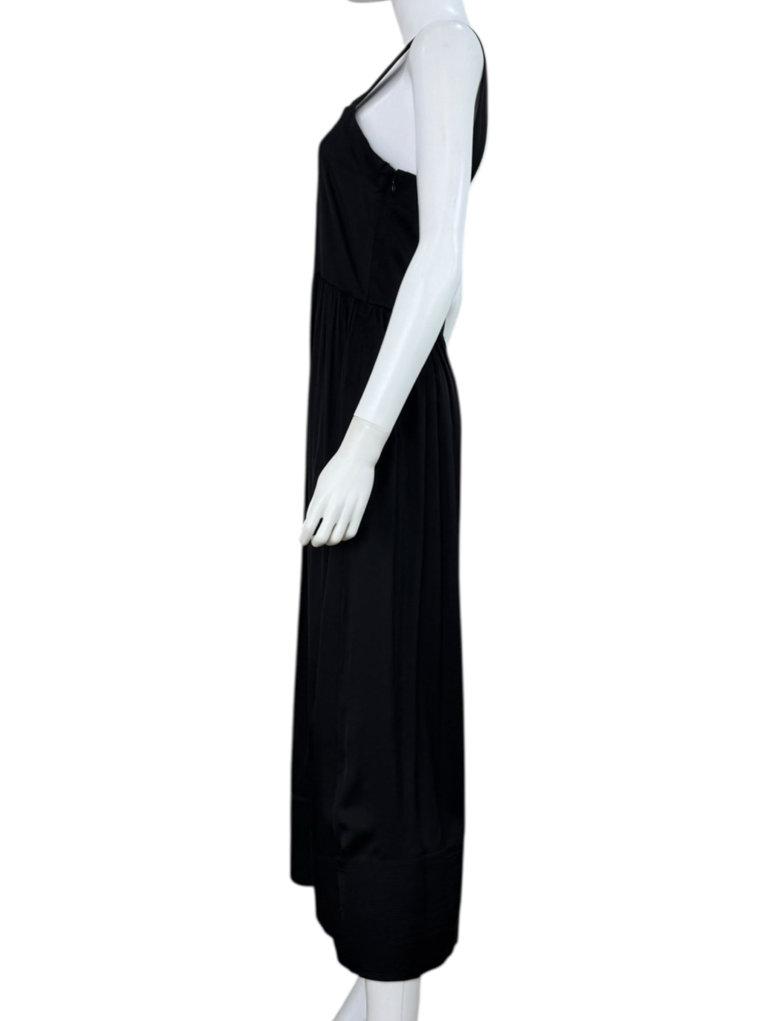 Black maxi dress with a large embroidered floral design on the chest, along with a zipper on the side.
