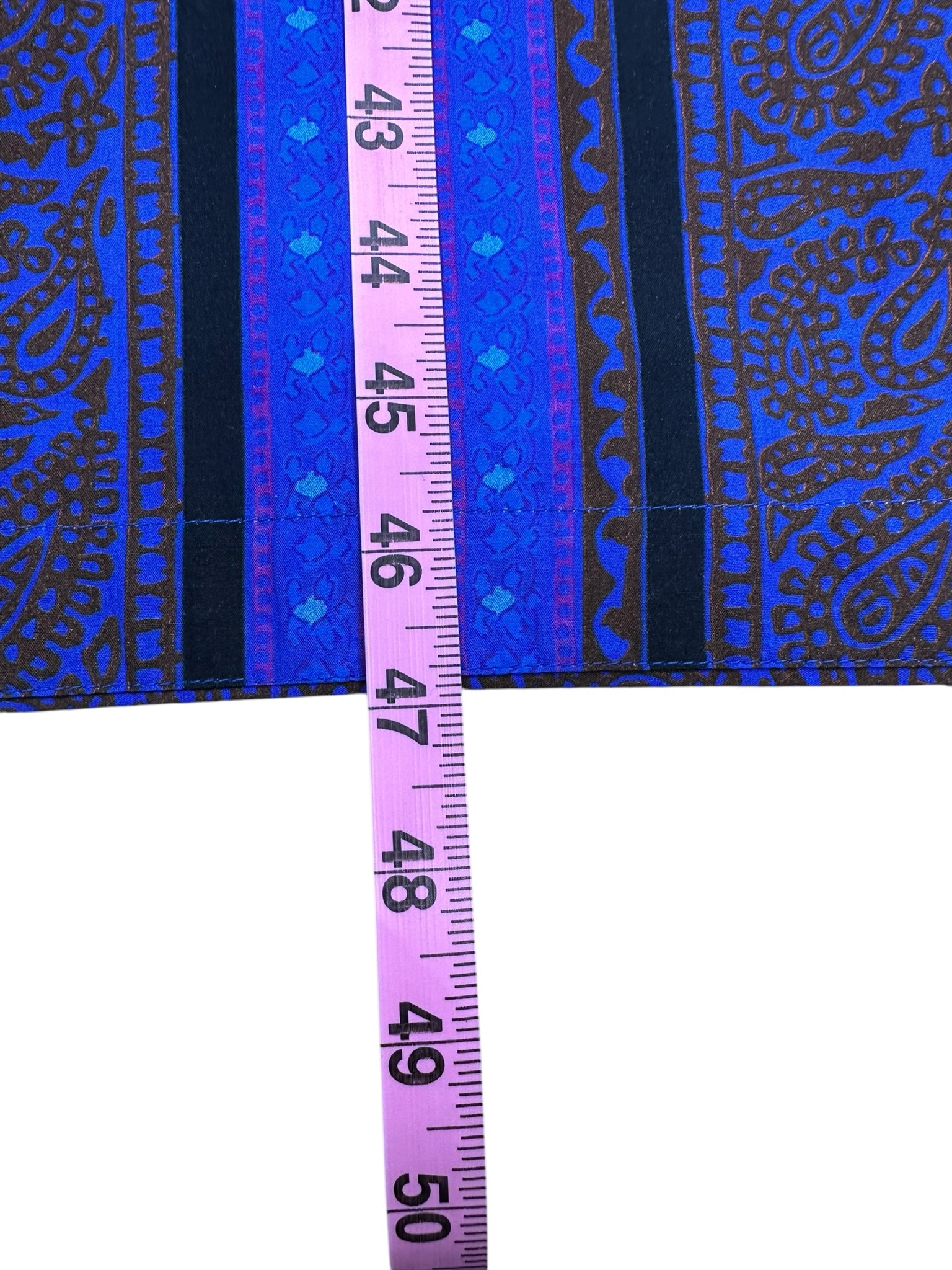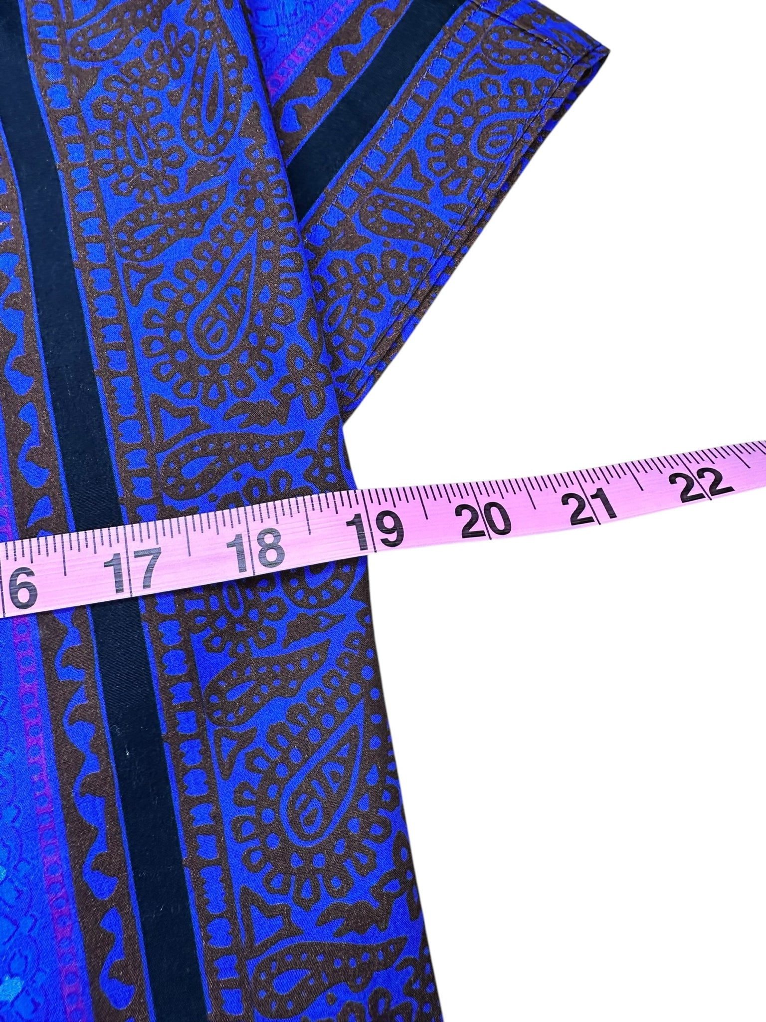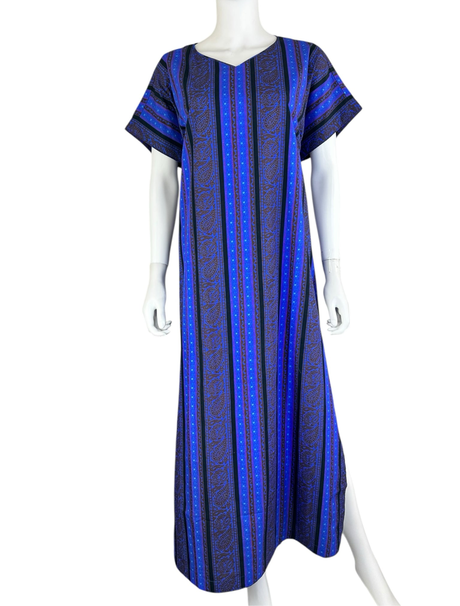 Blue, purple and maroon 100% cotton striped paisley print maxi dress with a v-neck, short sleeves and high side hem slits.