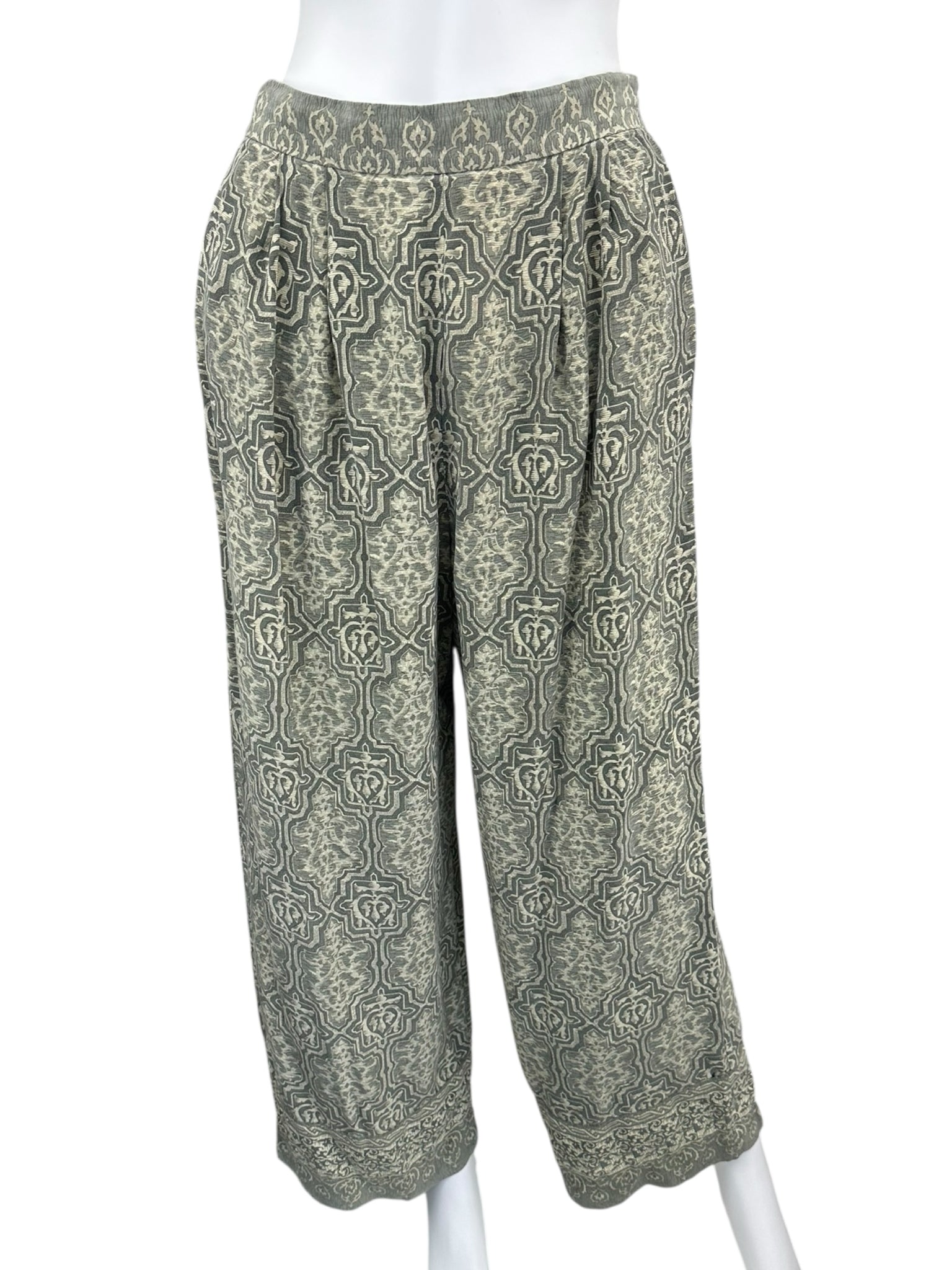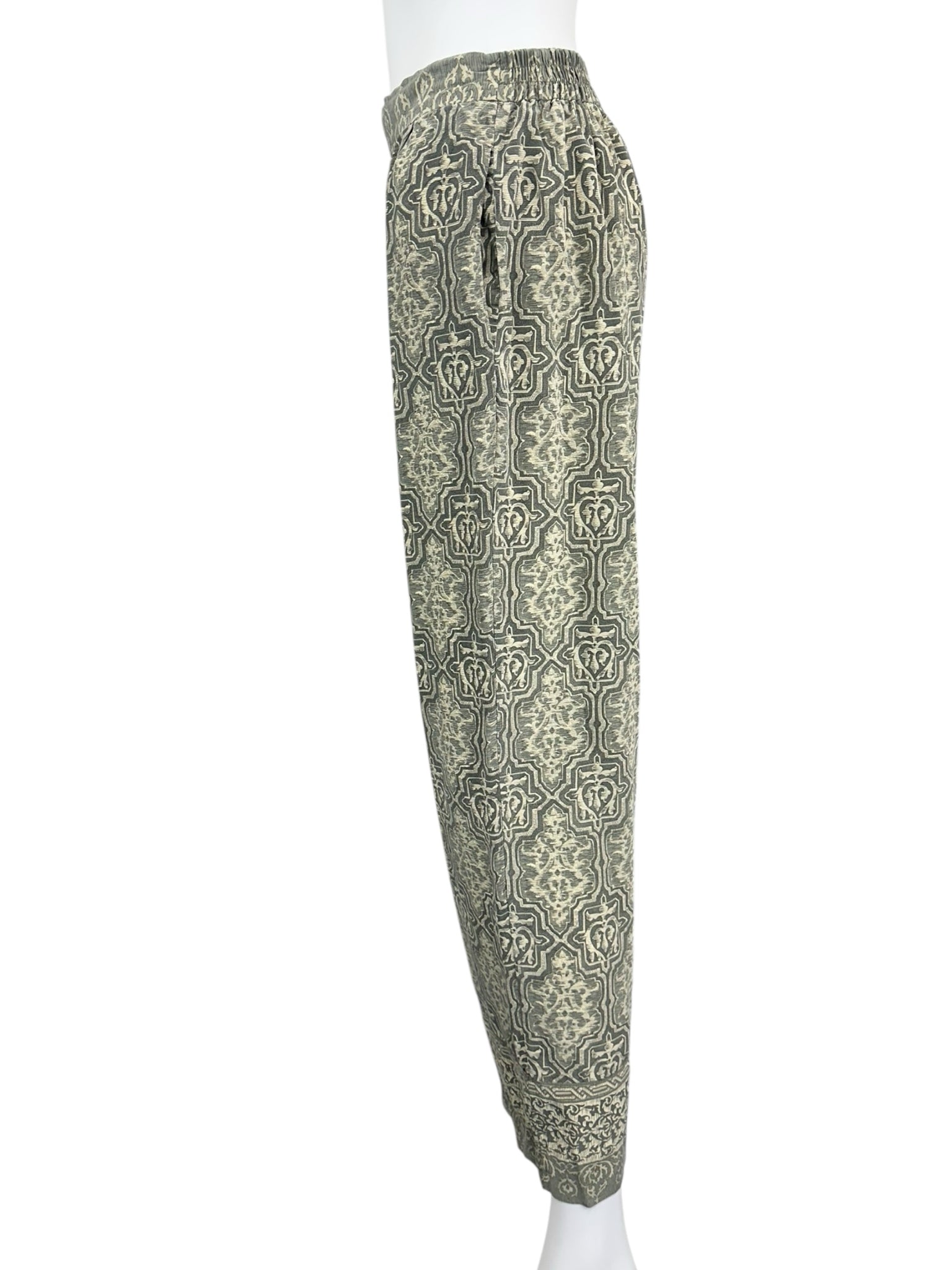 100% silk sage green print wide leg pants with an elastic waist and side pockets.