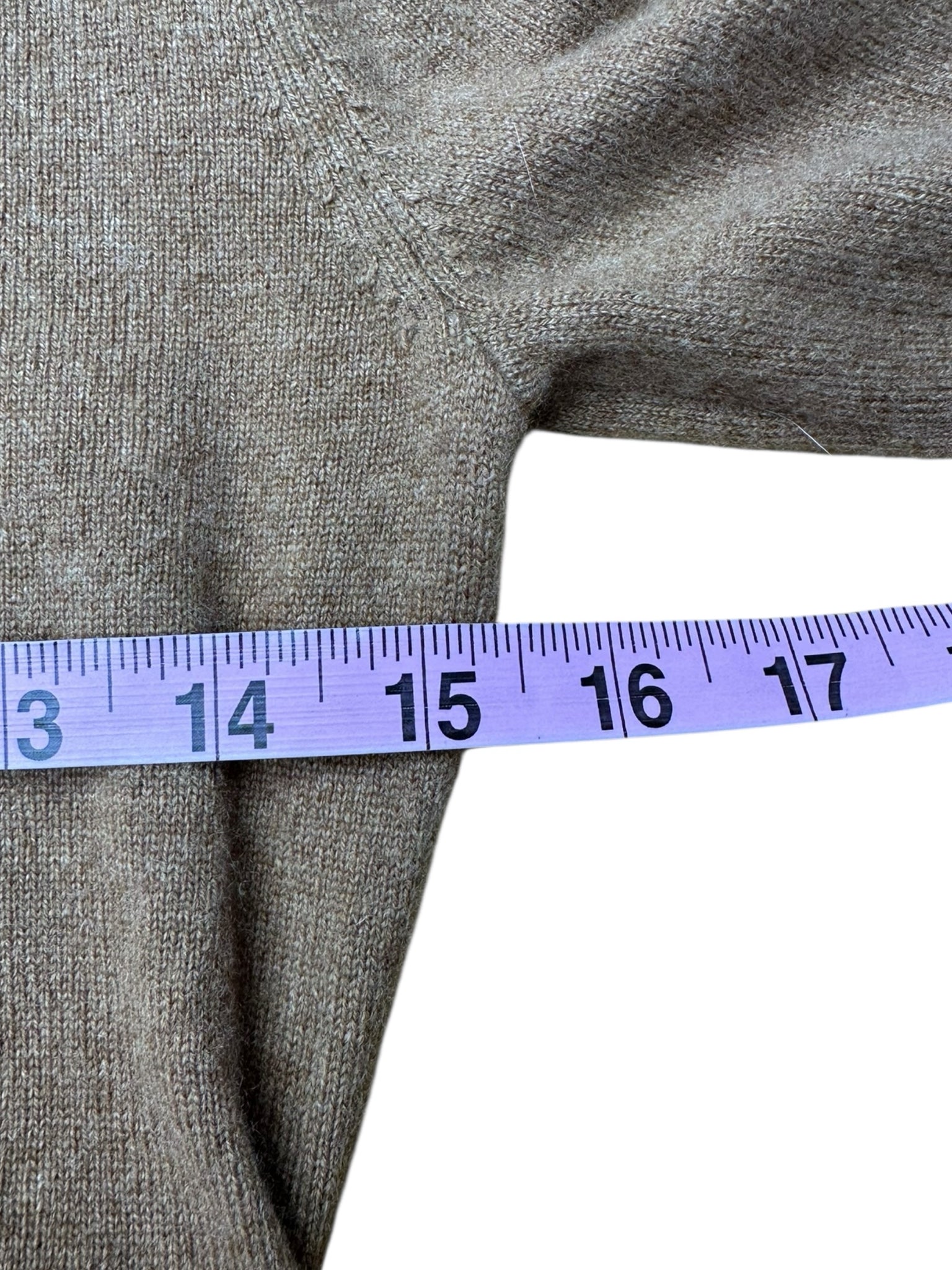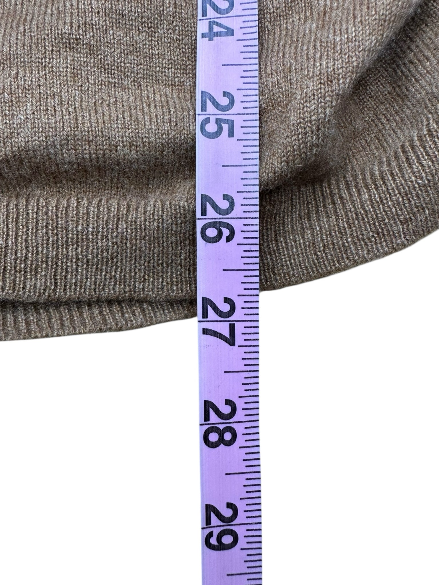 Brown thin knit pullover sweater with a cinched sides and long sleeves. Fabric content tag has been removed but is believed to be a wool cashmere blend.