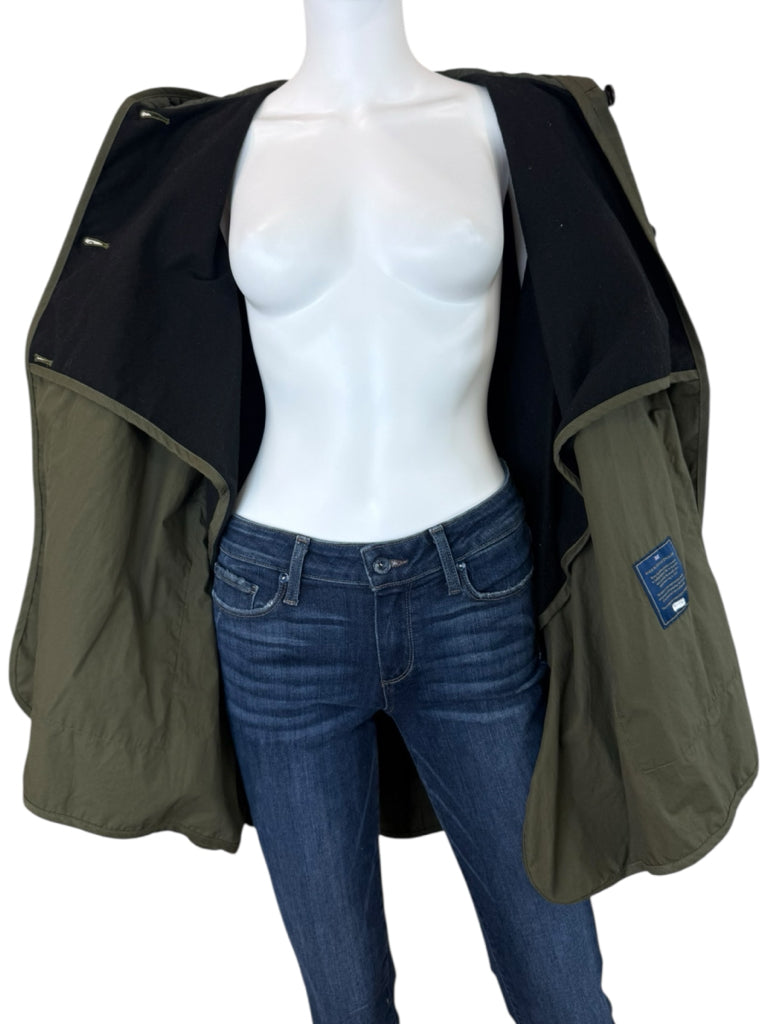 Limited edition! The TOAST x Lavenham collaboration features a specialized & functional outerwear. This oversized 100% cotton olive green poncho features a quilted hood, long kimono style sleeves, large front pockets, a black 100% cotton felt interior buggy, high side slits and a button front closure.